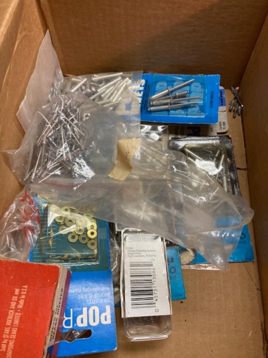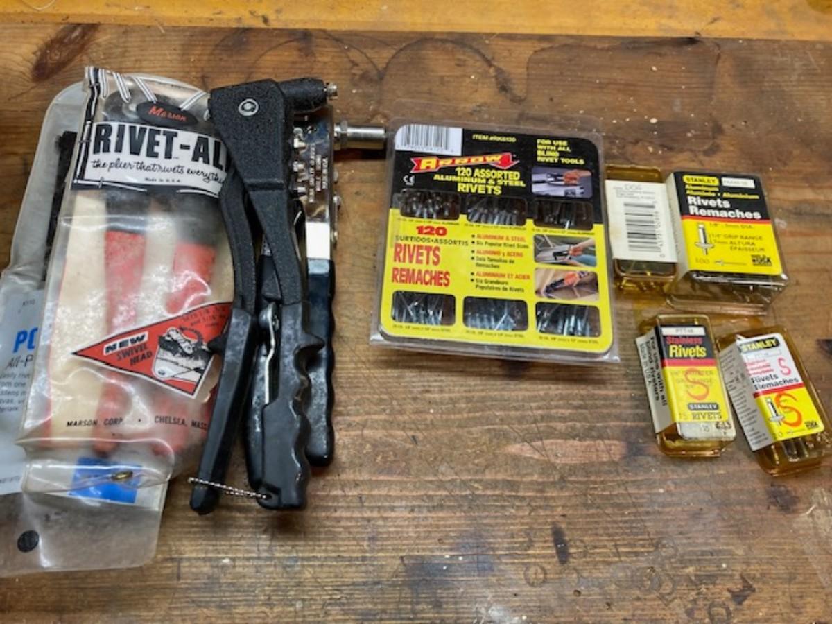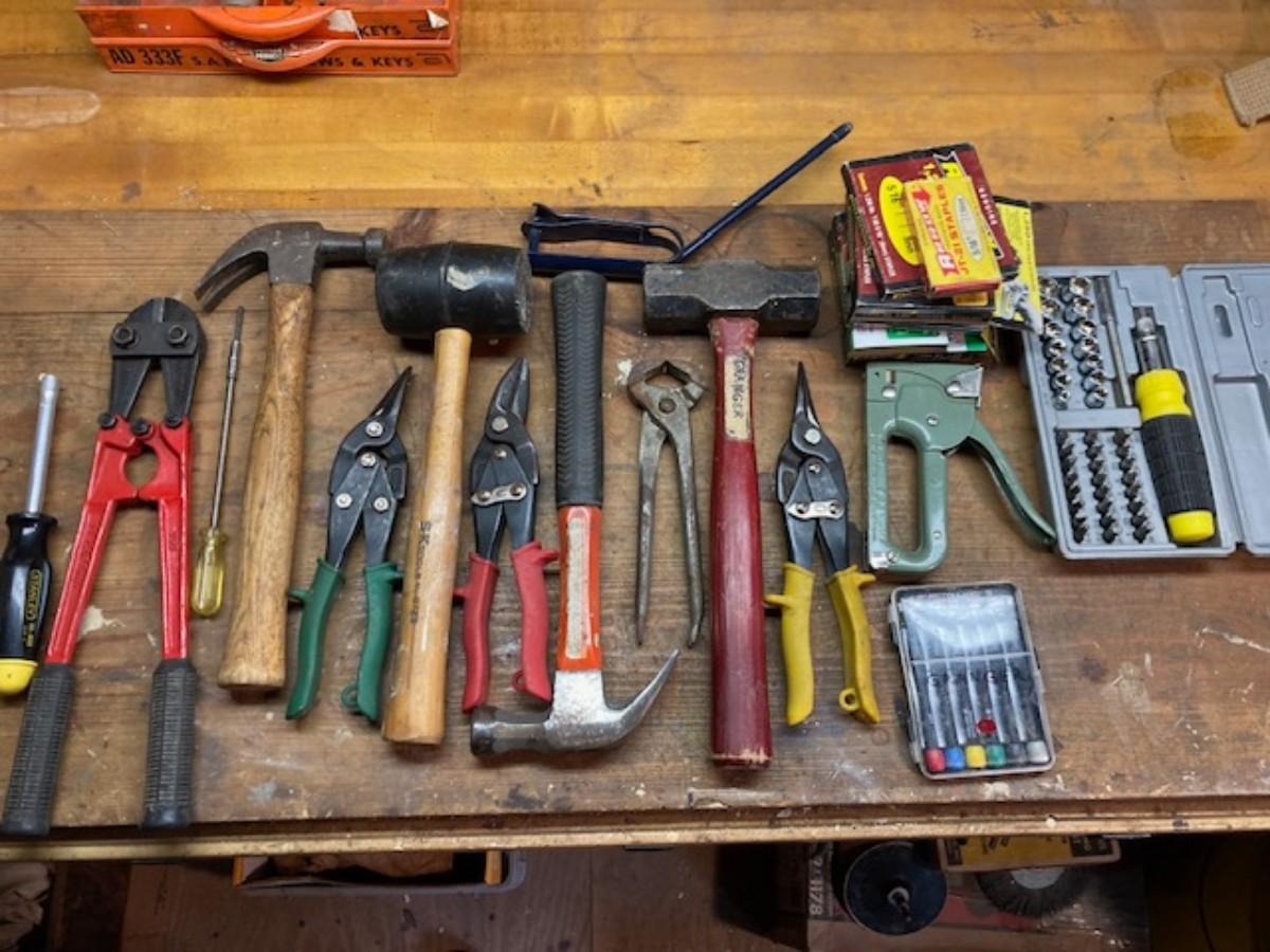 Hammers, tool belt, screw drivers, rivet tools and rivets, tin snips, stapler and staples