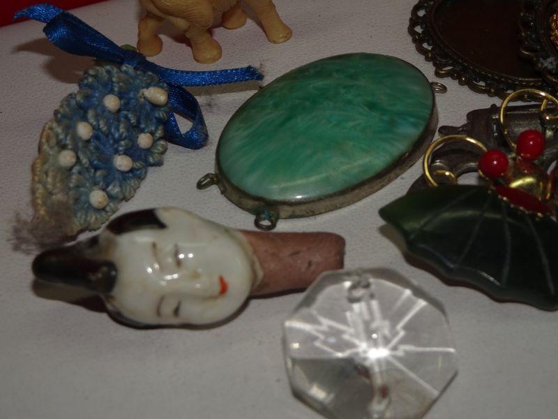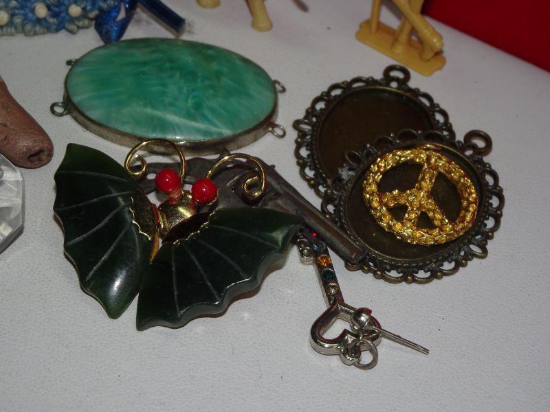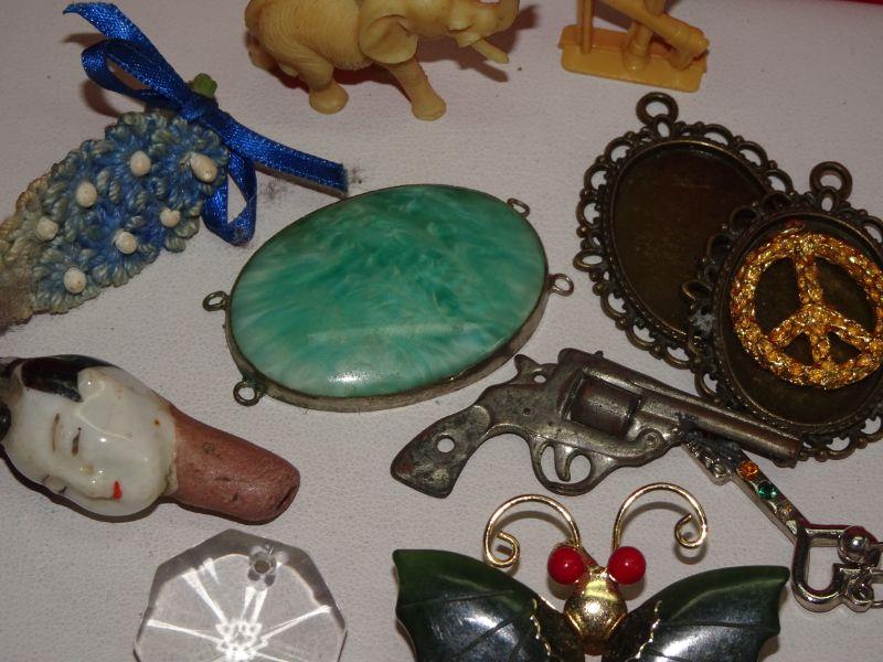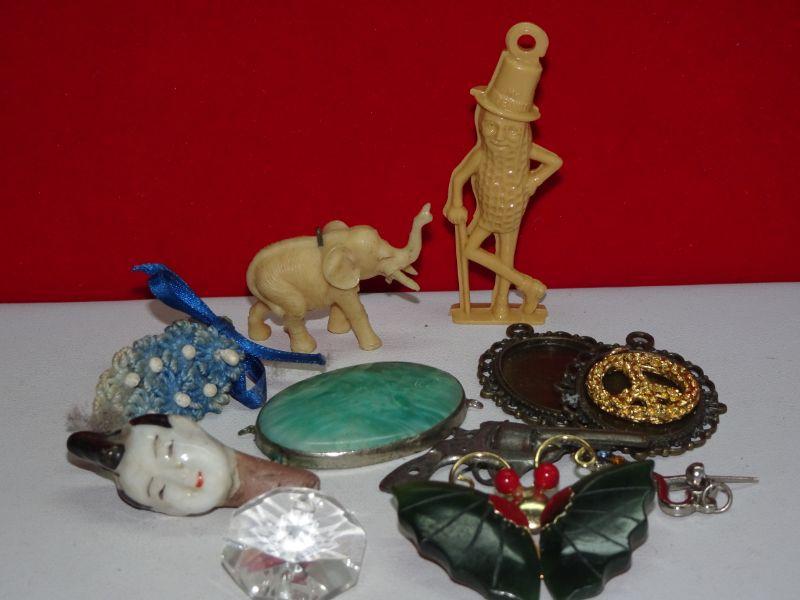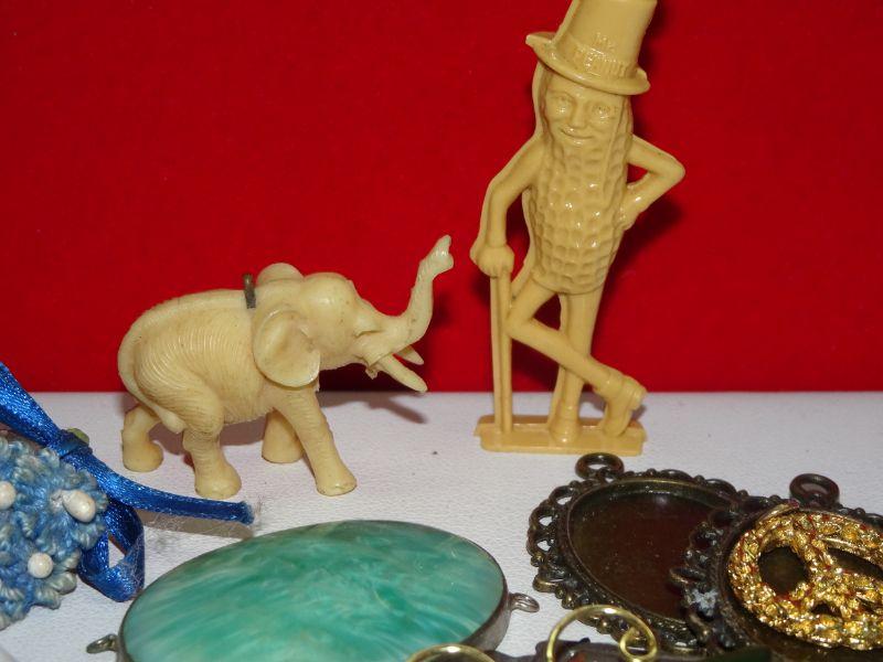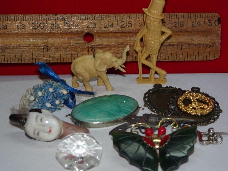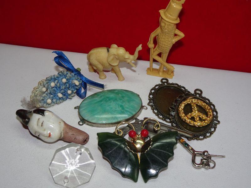 This & That Lot, P7, Mr. Peanut, Elephant, Porcelain Head, JADE Butterfly, Crystal, Flower Pin, Metal Gun and more
