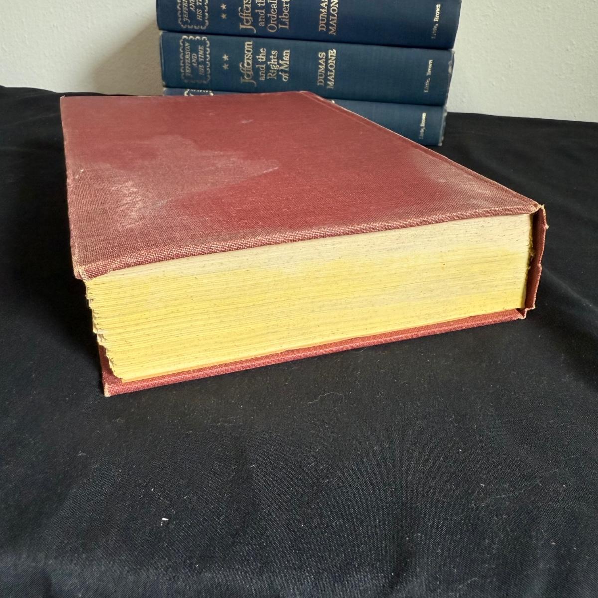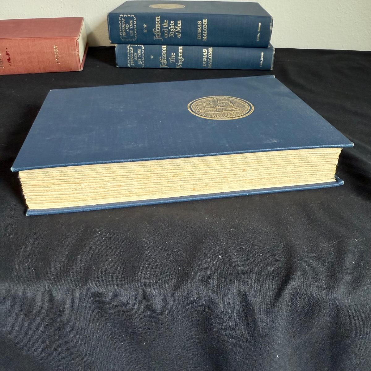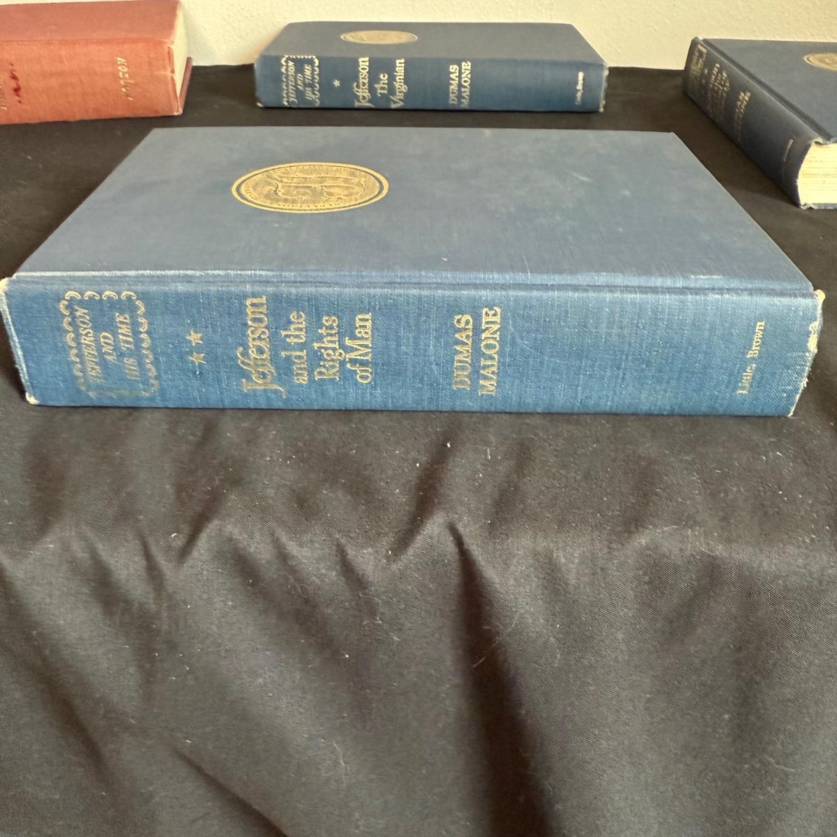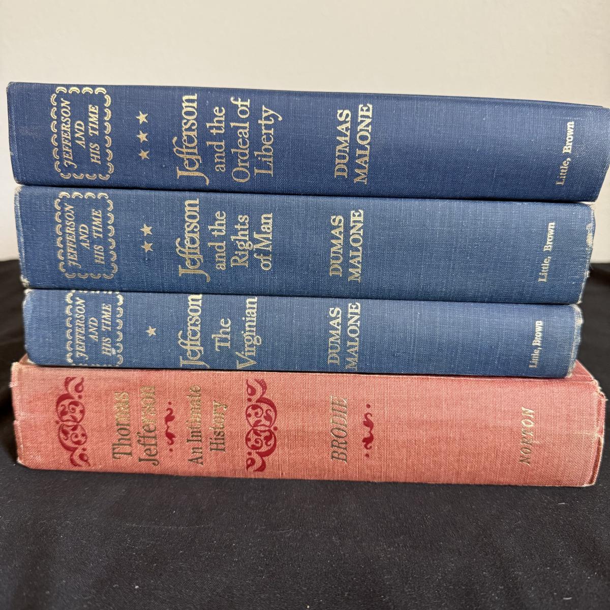 This lot contains four books about Thomas Jefferson. There are three volumes from Jefferson And His Time by Dumas Malone. Comes with Jefferson The Virginian, Jefferson and the Rights of Man, Jefferson and the Ordeal of Liberty. Also included in this lot is Thomas Jefferson An Intimate History by Fawn Brodie. This book in particular appears to have some water damage and all of the books are a bit worn, see pictures for details. Shipping available.