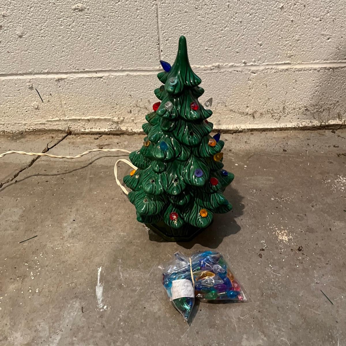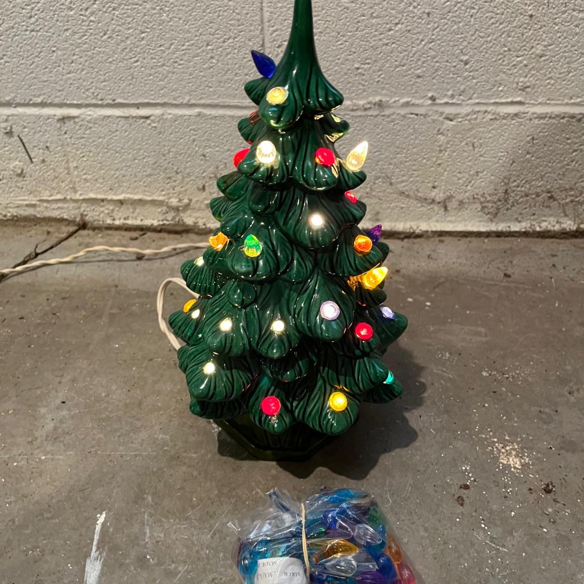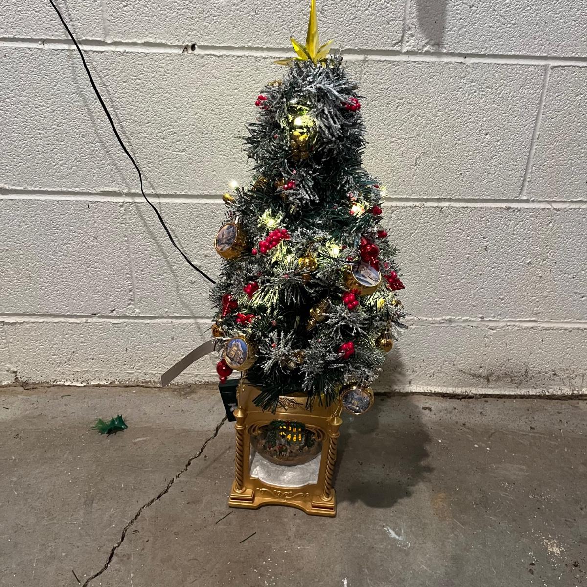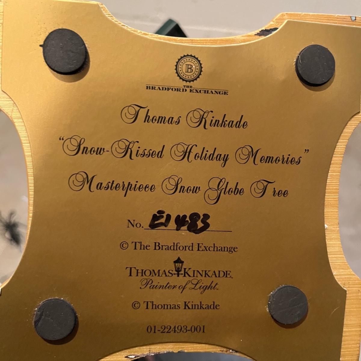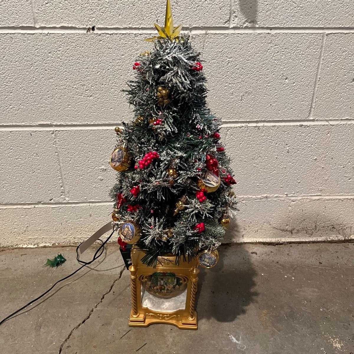 Lot includes a Thomas Kinkade "Snow-Kissed Holiday Memories" snow globe tree and a lighted ceramic tree by Holland Mold. Both trees worked when tested. Ceramic tree has extra pieces and has some pieces glued on, see pictures. Thomas Kinkade tree measures 9” x 9” x 24”.