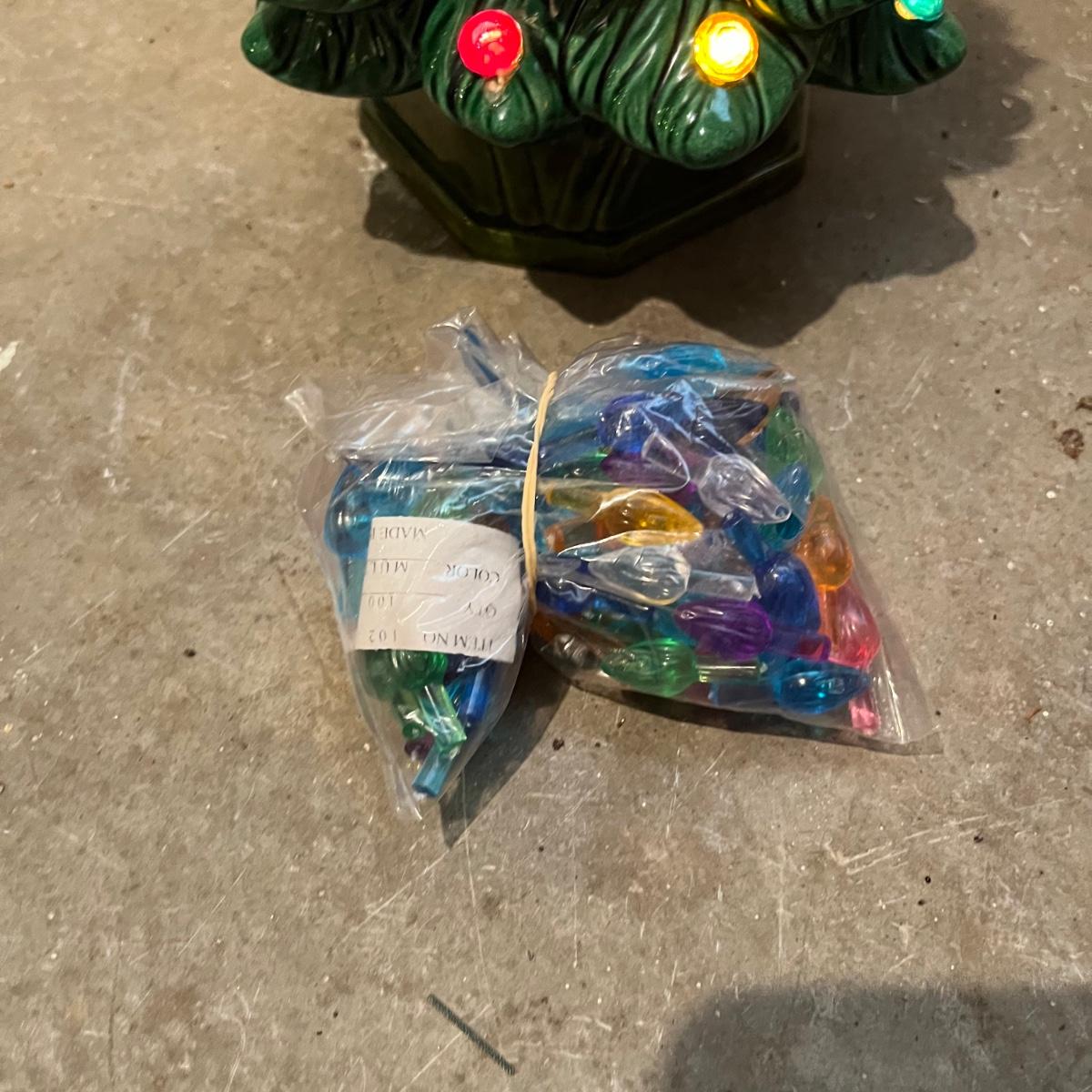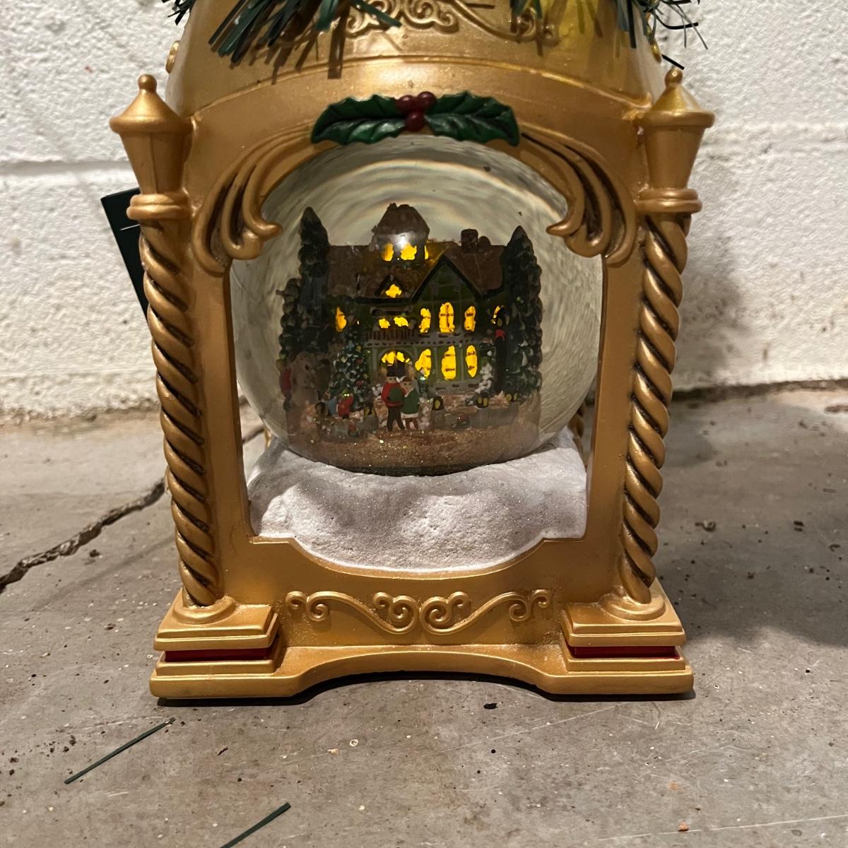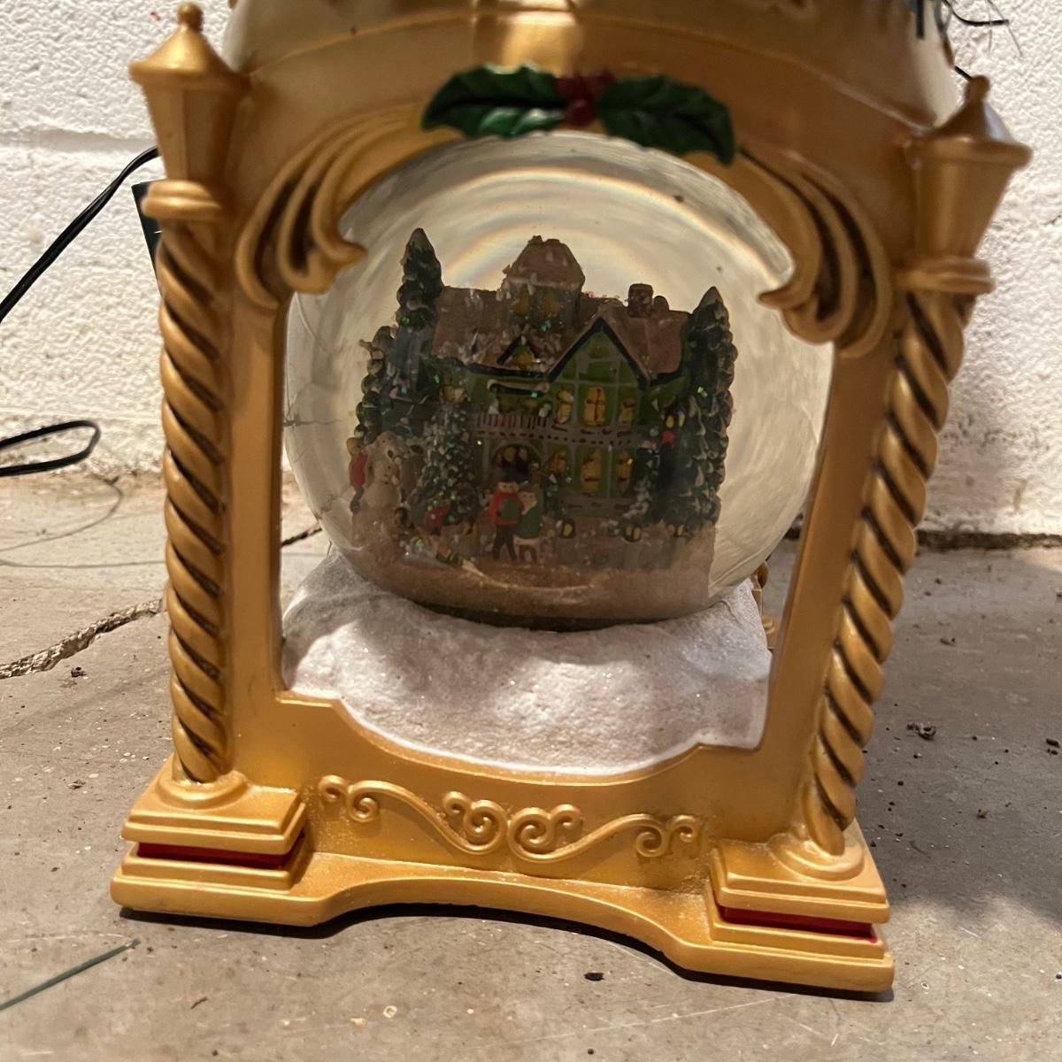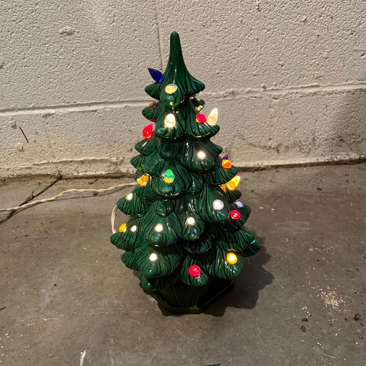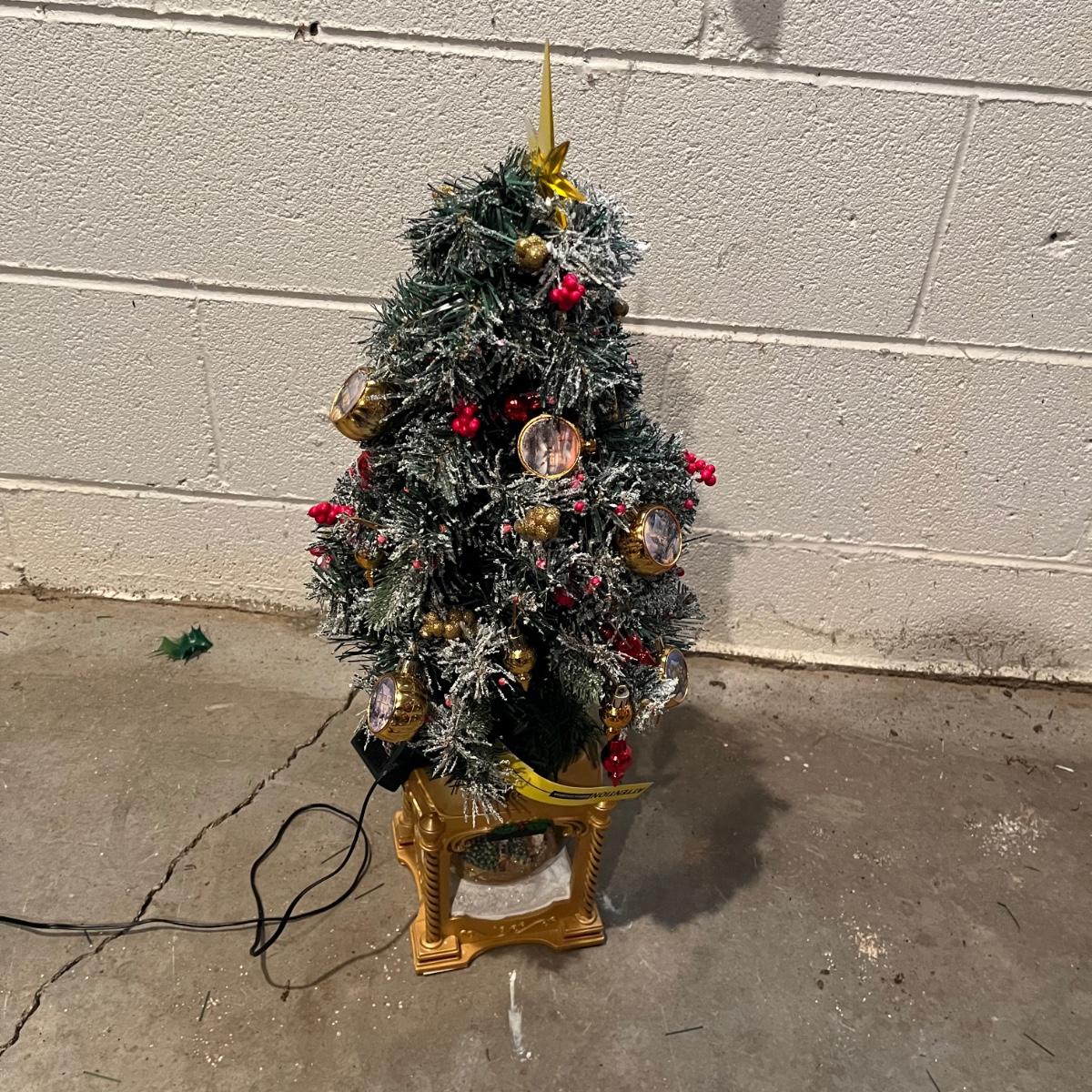 Lot includes a Thomas Kinkade "Snow-Kissed Holiday Memories" snow globe tree and a lighted ceramic tree by Holland Mold. Both trees worked when tested. Ceramic tree has extra pieces and has some pieces glued on, see pictures. Thomas Kinkade tree measures 9” x 9” x 24”.