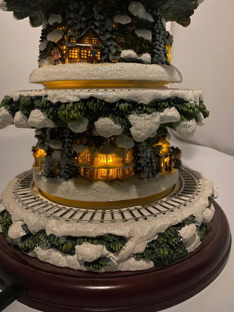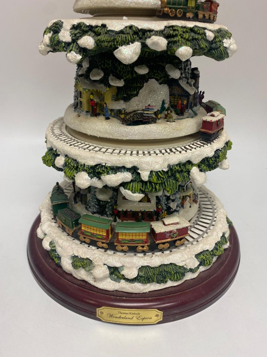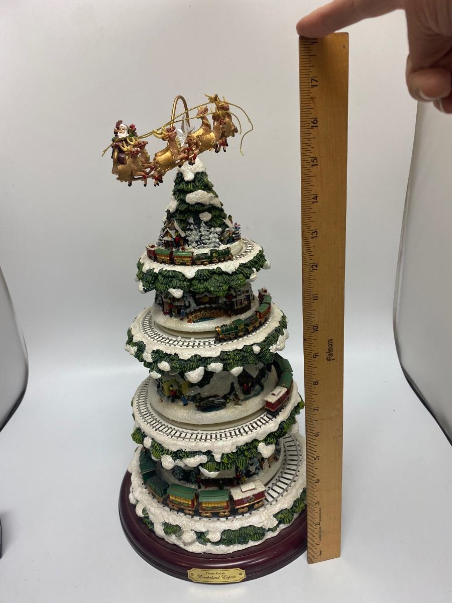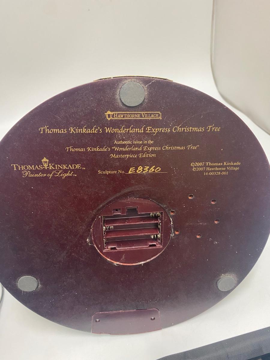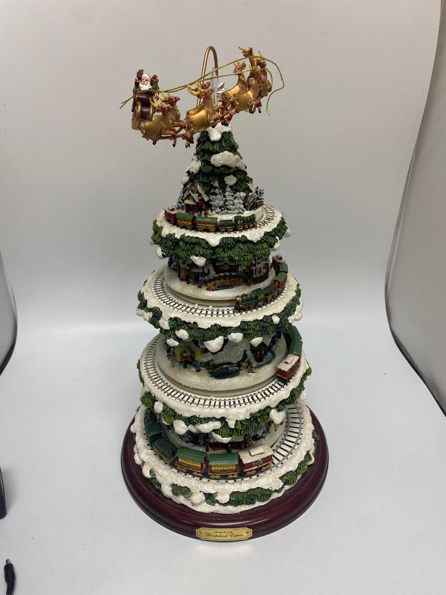 Thomas Kinkade's Wonderland Express Christmas Tree Lighted Display. Comes in original box. Lights up, trains move around the tree, and Santa flies over head. Does not play music anymore. Has a power cord, but it fits loose. Can also hold batteries in the bottom, that may control music but untested. About 17" tall. Tree looks to be in good condition, did not notice any broken or chipped spots.