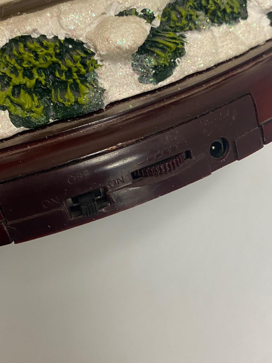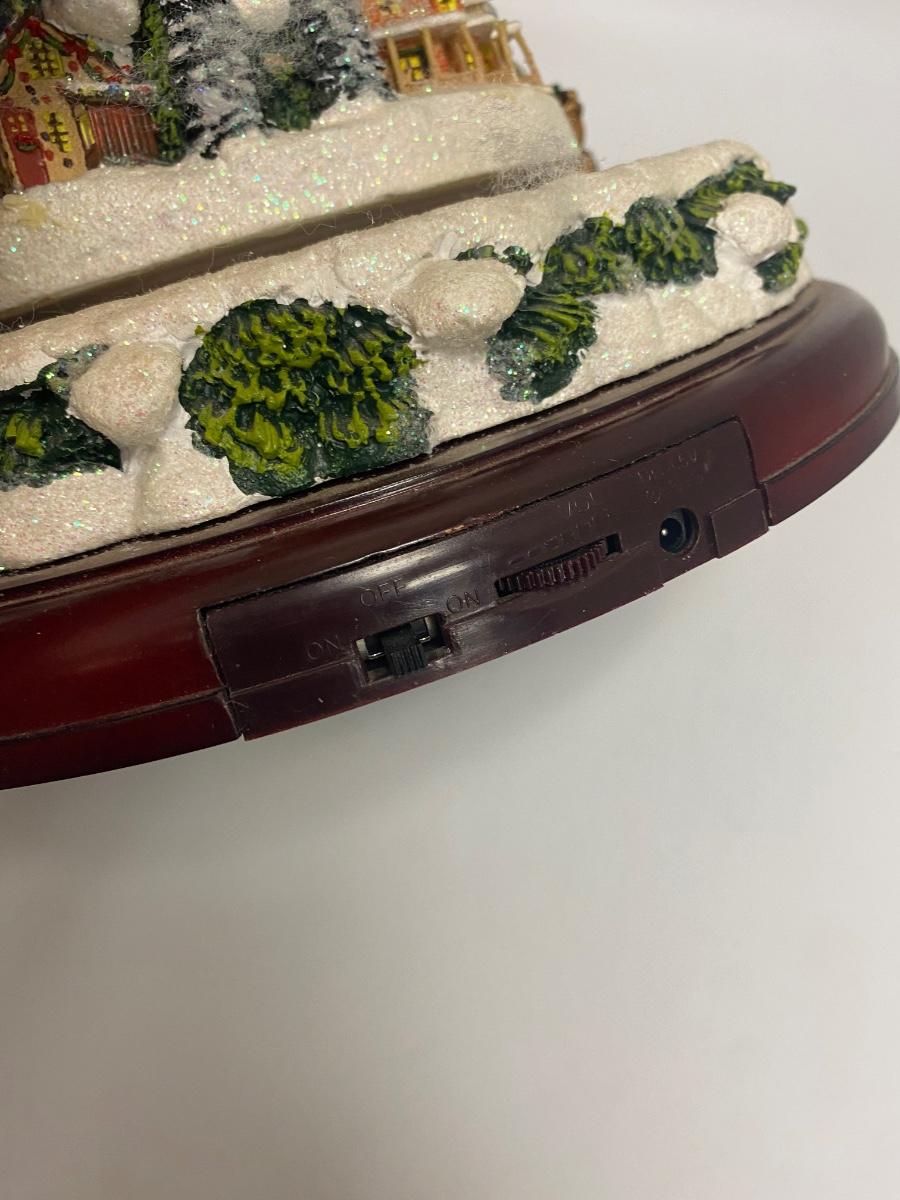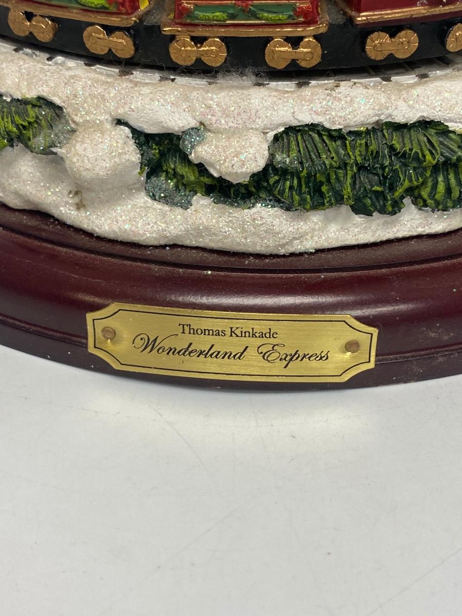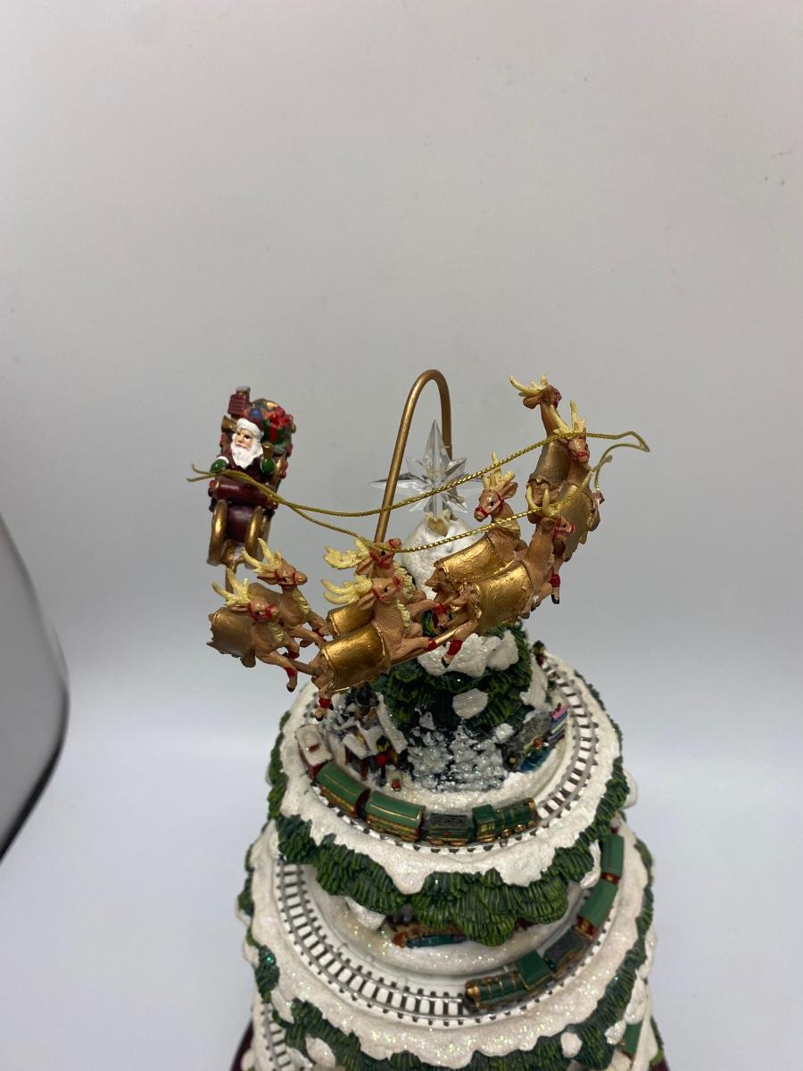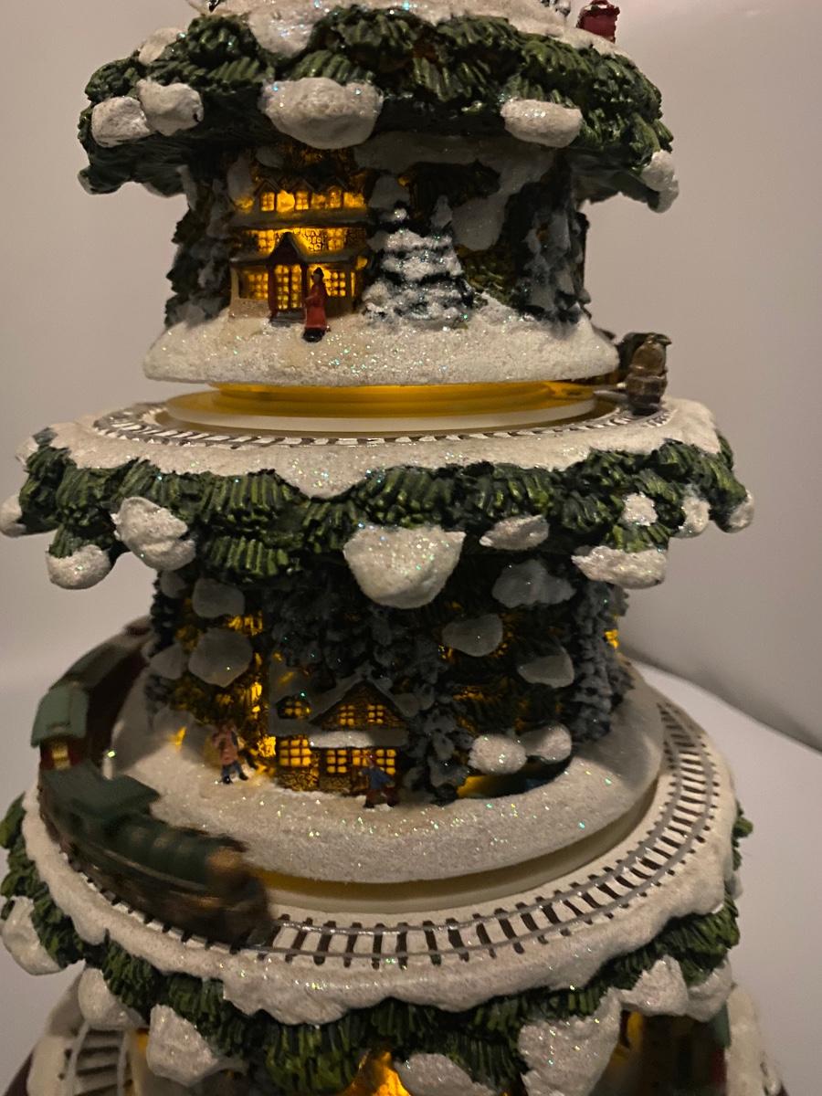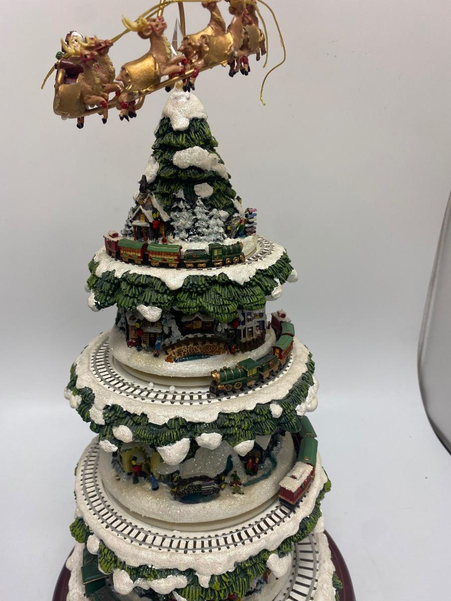 Thomas Kinkade's Wonderland Express Christmas Tree Lighted Display. Comes in original box. Lights up, trains move around the tree, and Santa flies over head. Does not play music anymore. Has a power cord, but it fits loose. Can also hold batteries in the bottom, that may control music but untested. About 17" tall. Tree looks to be in good condition, did not notice any broken or chipped spots.