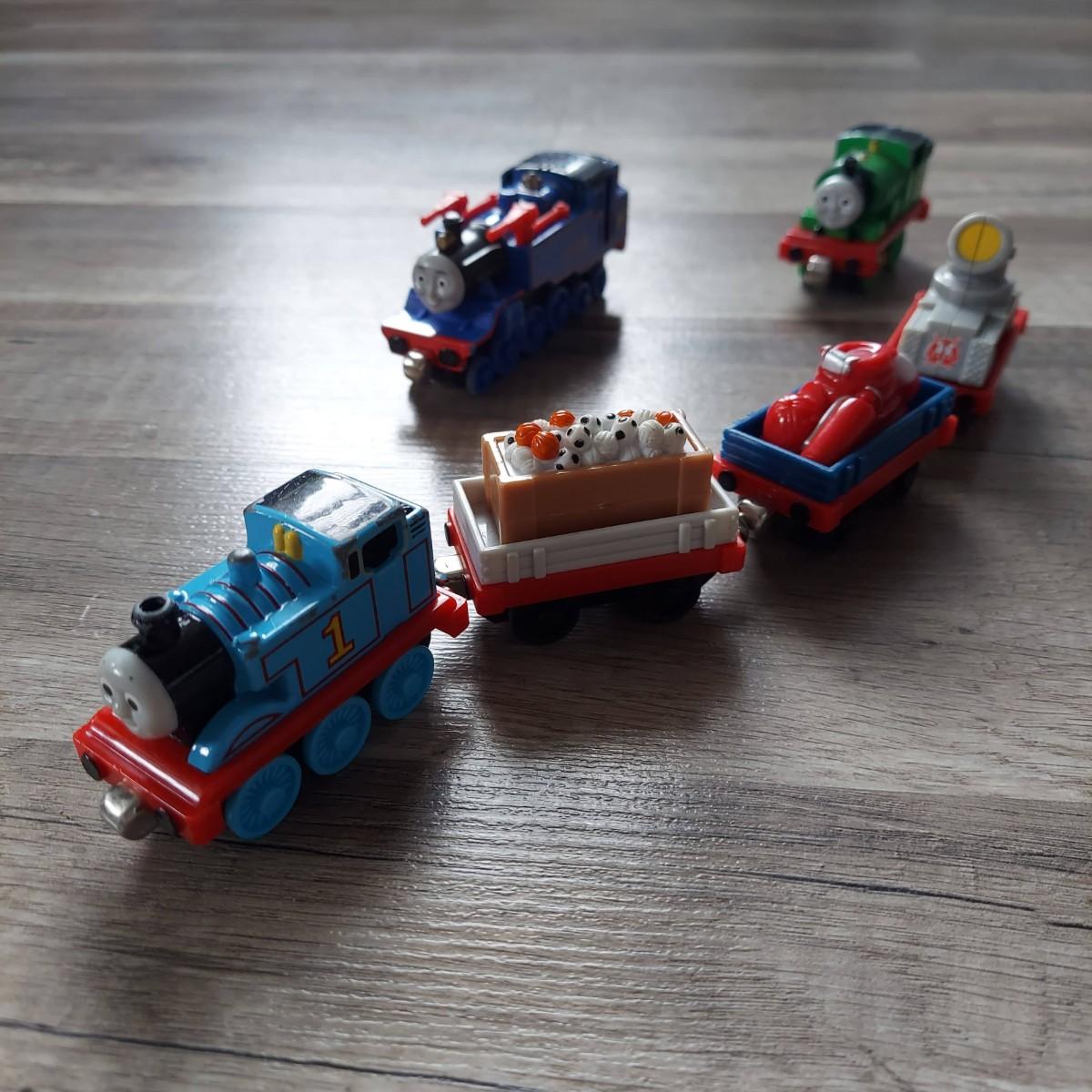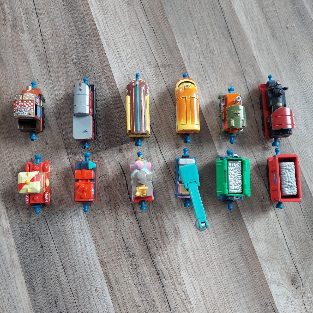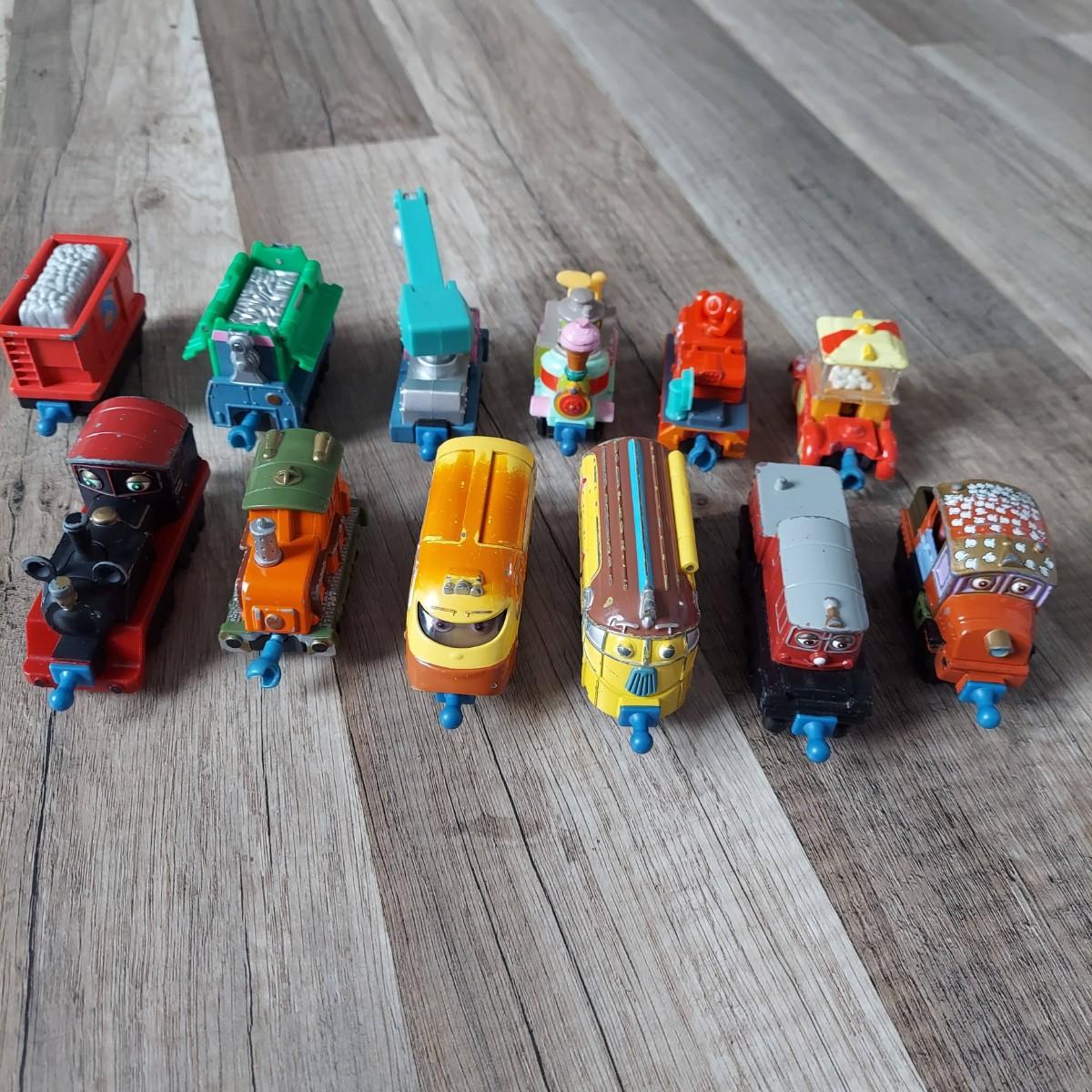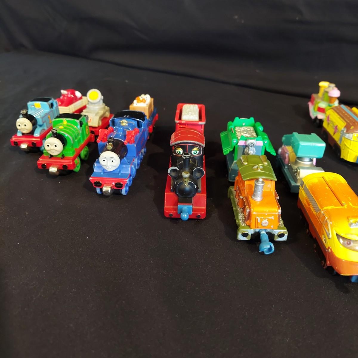 Thomas the Tank Engine Diecast Train Set. Three magnetic train cars with removable accessories. Thomas the Train and two Thomas and Friends trains including Thomas 2002, Percy 2002 and Belle 2010. Also includes Learning Curve Chuggington Die-cast Trains. Six engines including Frostini, Old Puffer Pete, Action Chugger, Hodge, Irving and Calley with six interchangeable train cars. Some chipping paint. Each train piece is approximately 3-4" in length. Please see photos for details. Shipping available.