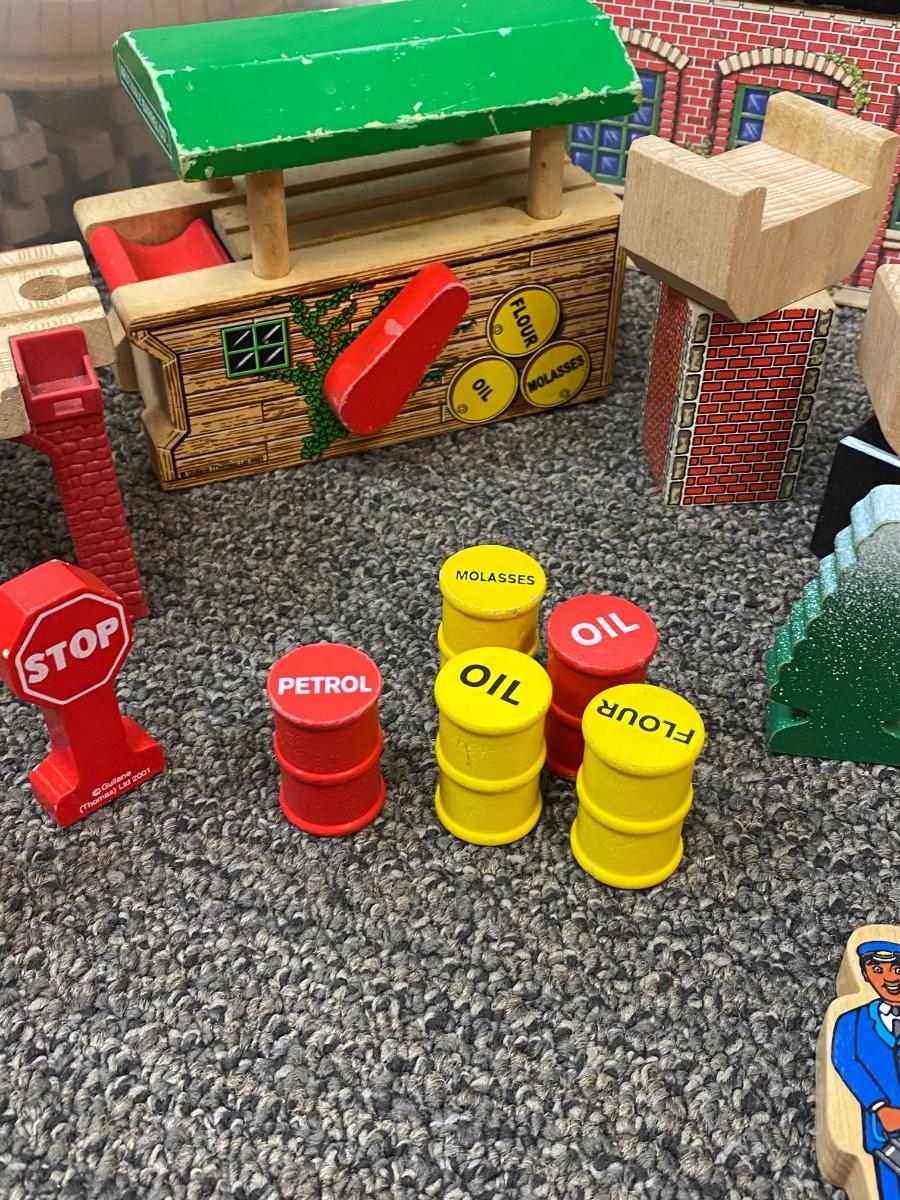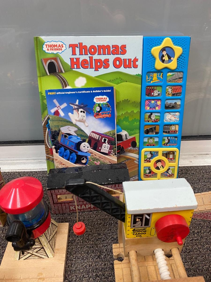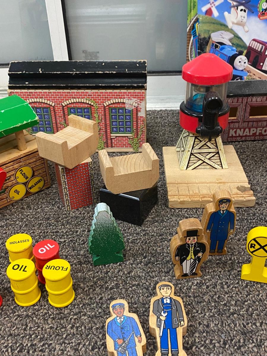Thomas the Tank Engine & Friends Wooden Train Track Set with Railway Accessories. Includes Sir Topham Hatt. Tons of track pieces. Booklet included with different track set ups and illustration of pieces needed. See Photos.