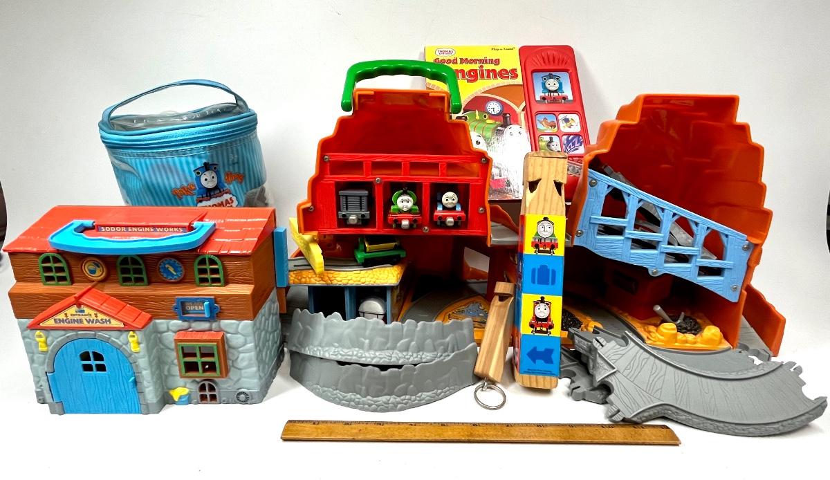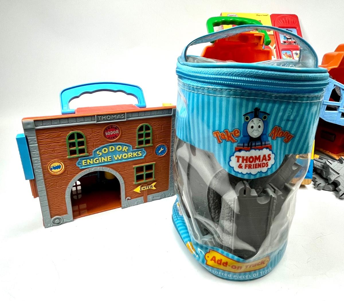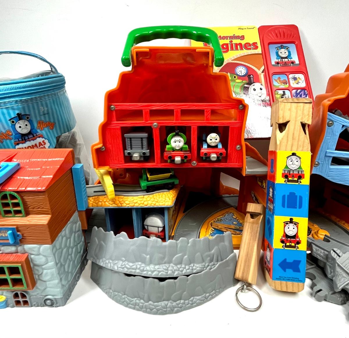 Thomas the Tank Engine lot book, train whistle, train depot toy, tracks and more