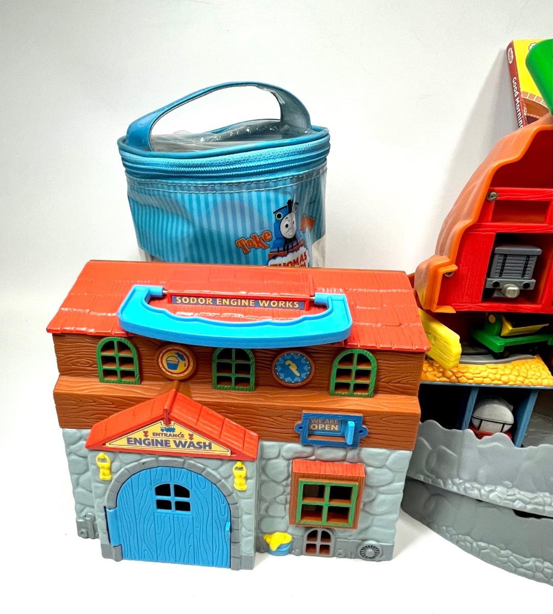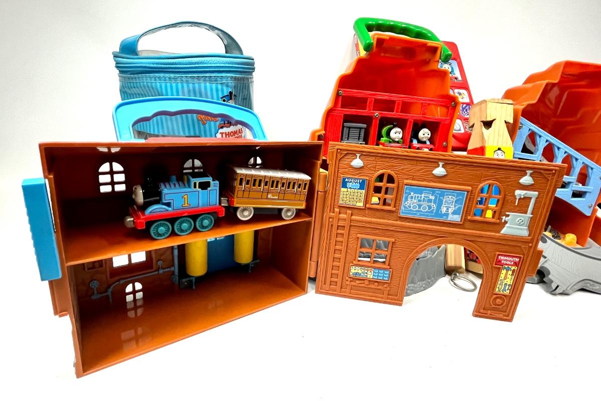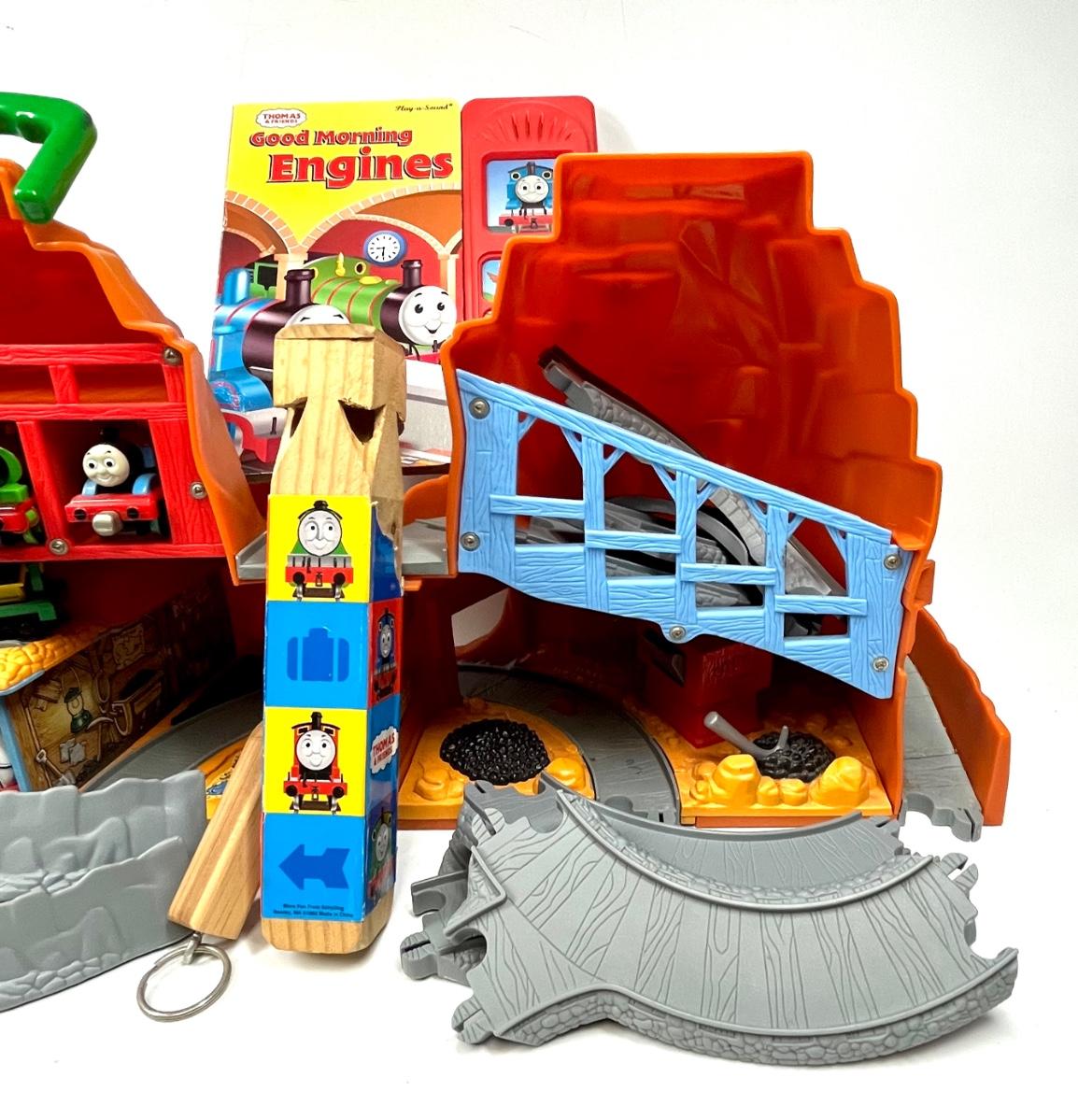 Thomas the Tank Engine lot book, train whistle, train depot toy, tracks and more