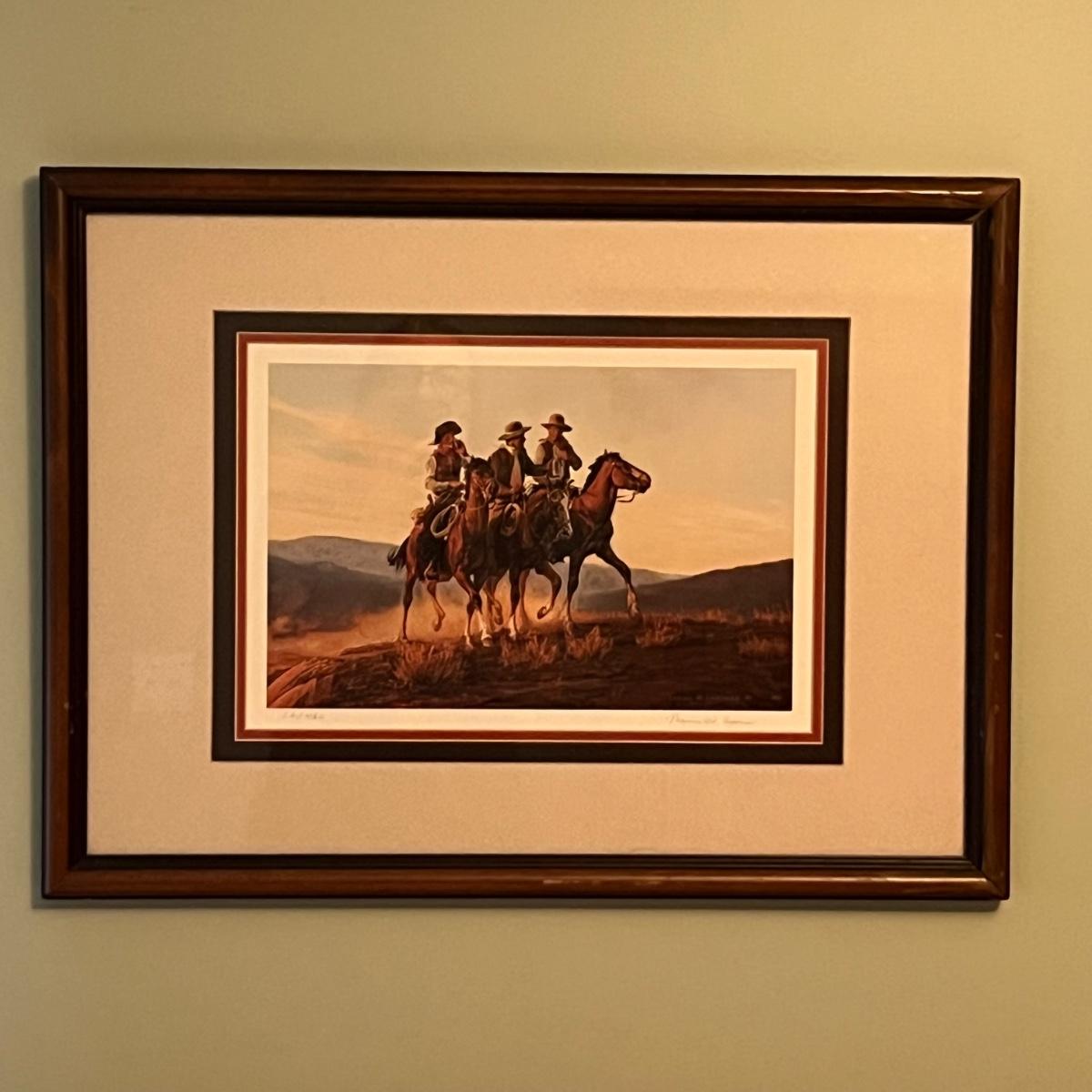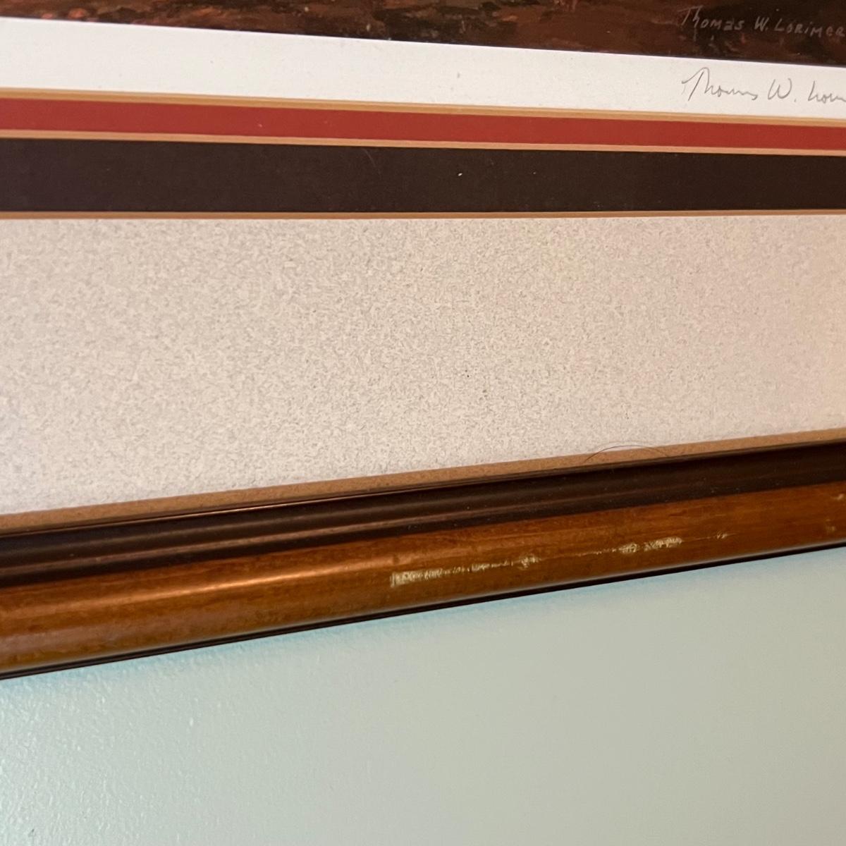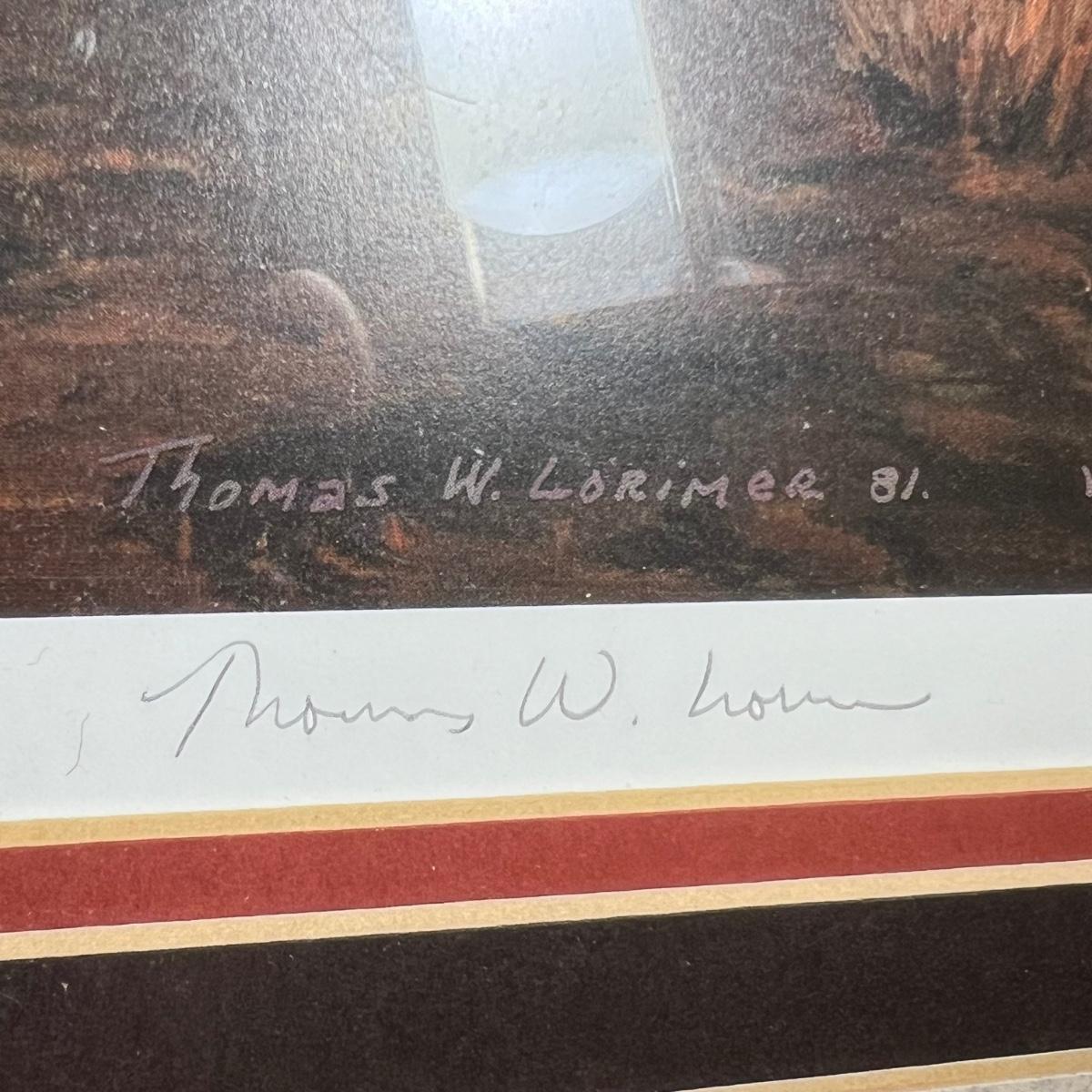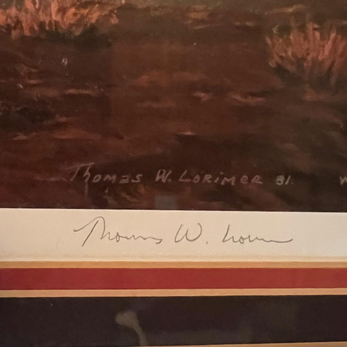This limited edition Thomas W. Lorimer print is number 56/450. Pencil signed, it is double matted, under glass and housed in a wood frame; note the few scuffs marks on frame.