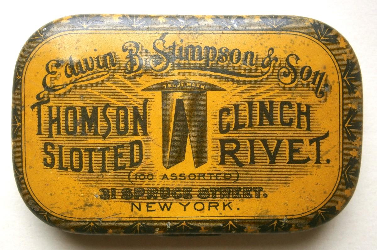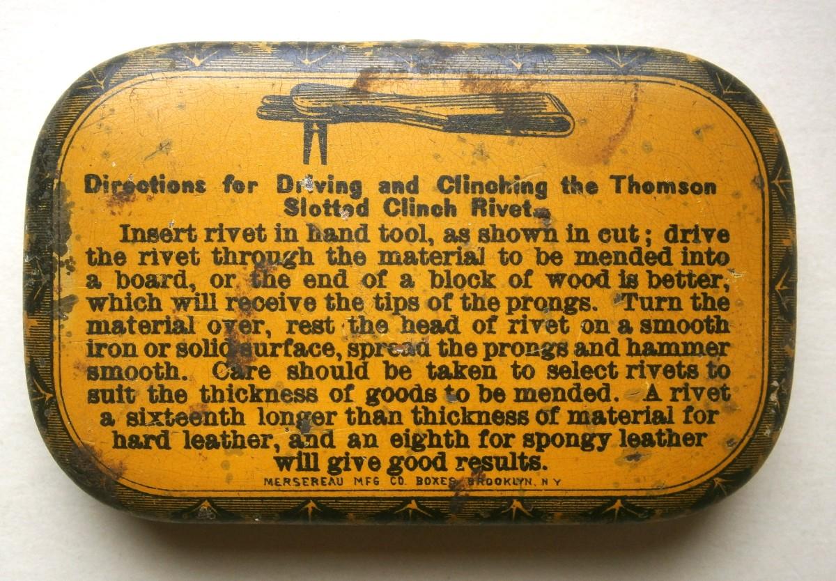 THOMASON SLOTTED CLINCH RIVET Tin, antique/vintage from the early 1900's, 3 x 2 in., lithographed tin.