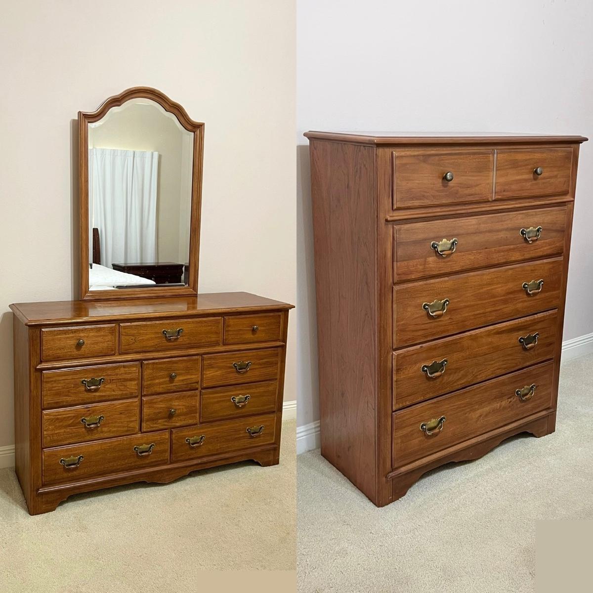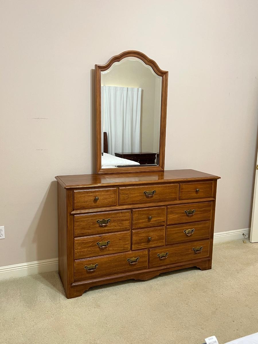 Mirrored dresser = 36” H x 57” W x 18” D ~ Beveled Mirror = 44” H ~ 5 Drawer Tall dresser = 50” H x 38” W x 18” D