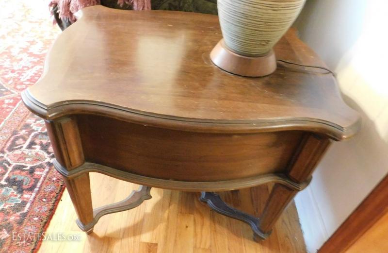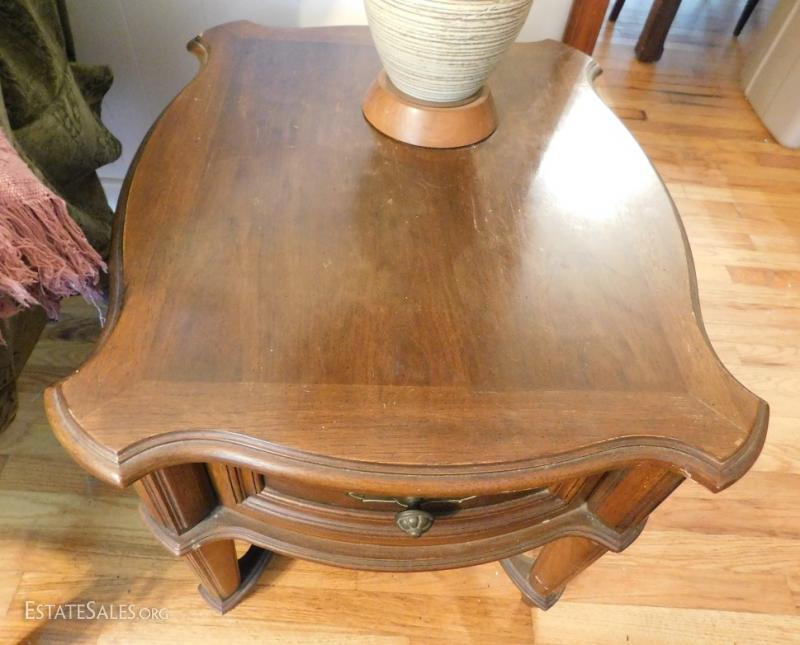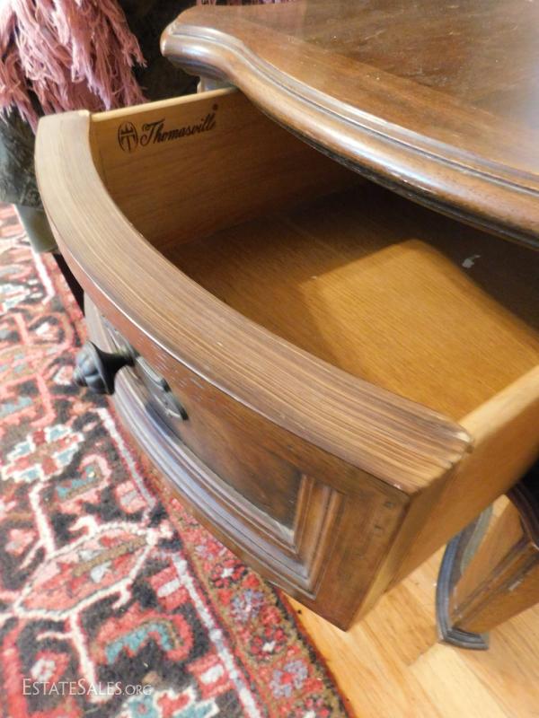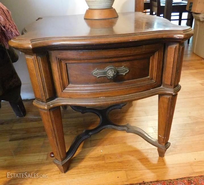 Solid wood Thomasville lamp table with single drawer. Nice, heavy piece and solid. Some wear.