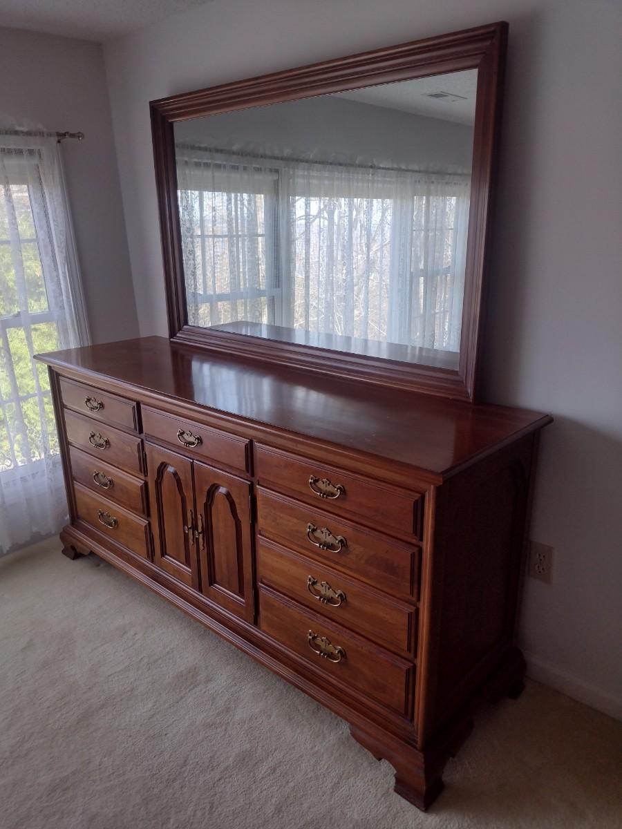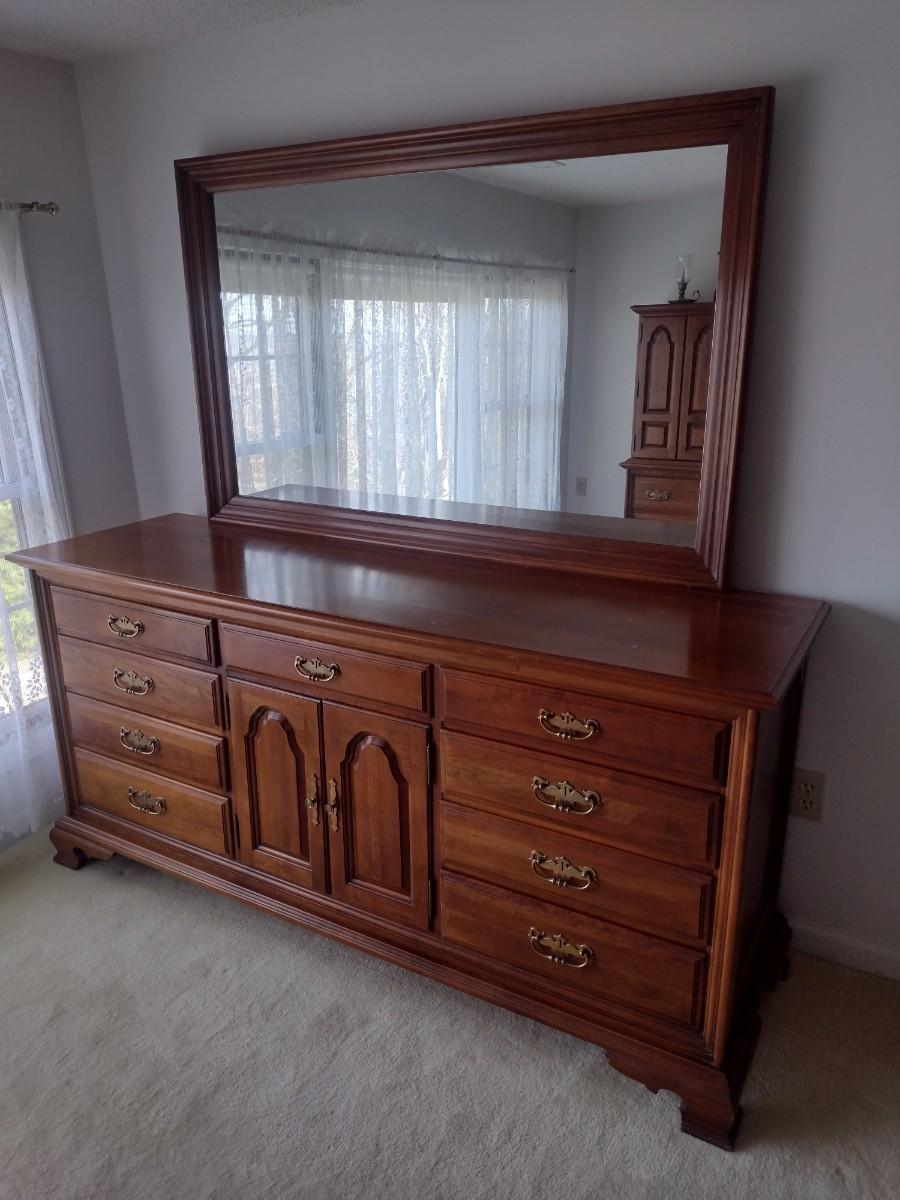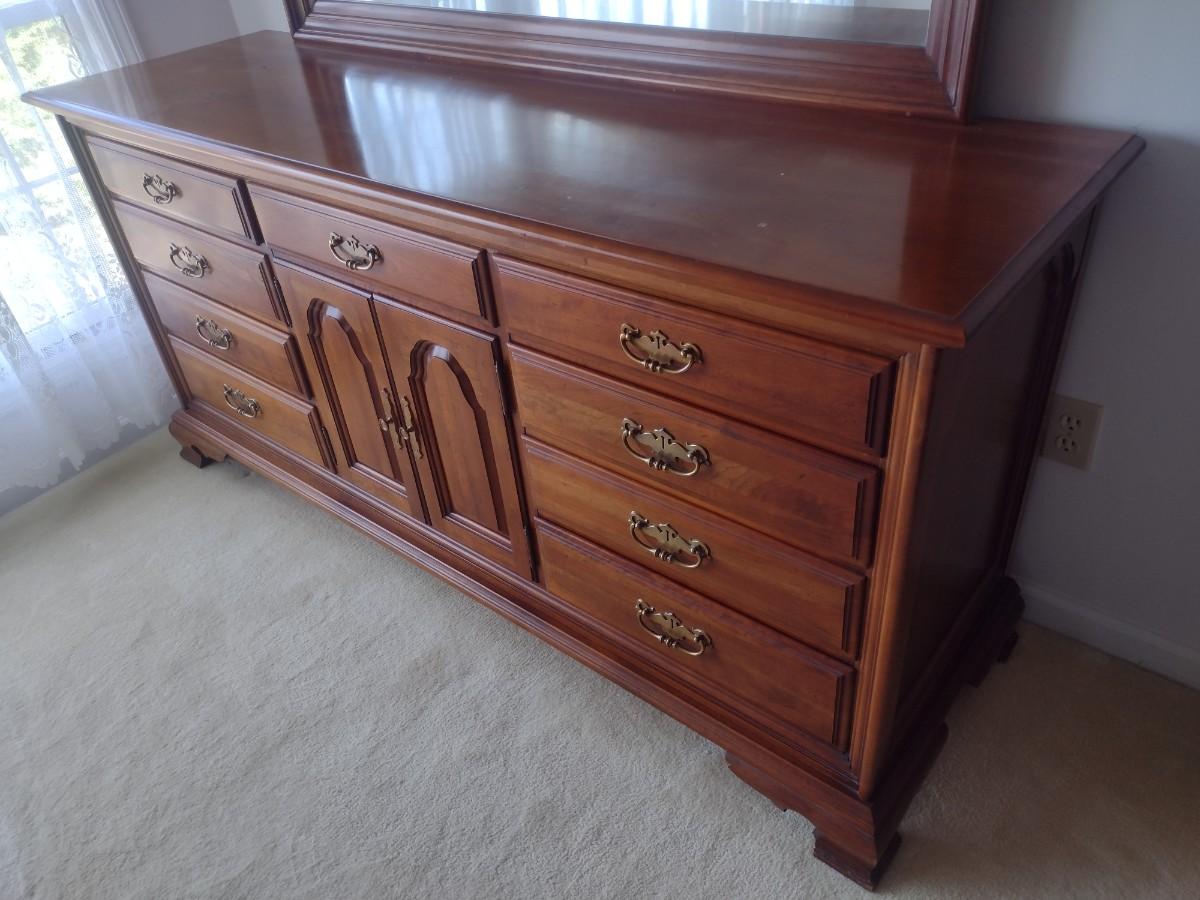 Thomasville Cherry Finish 9 Drawer Stretch Dresser with Sweater Drawers and Mirror