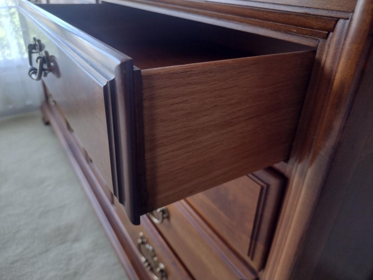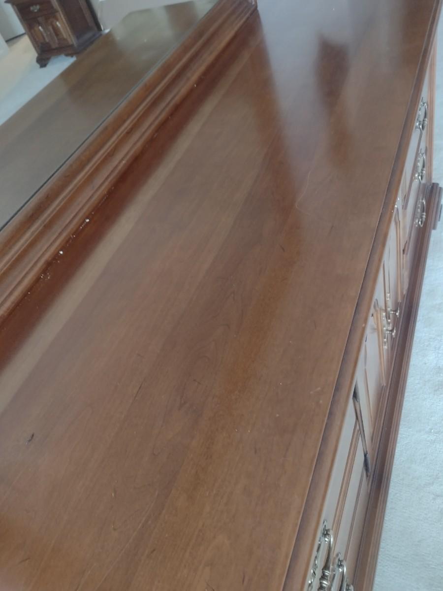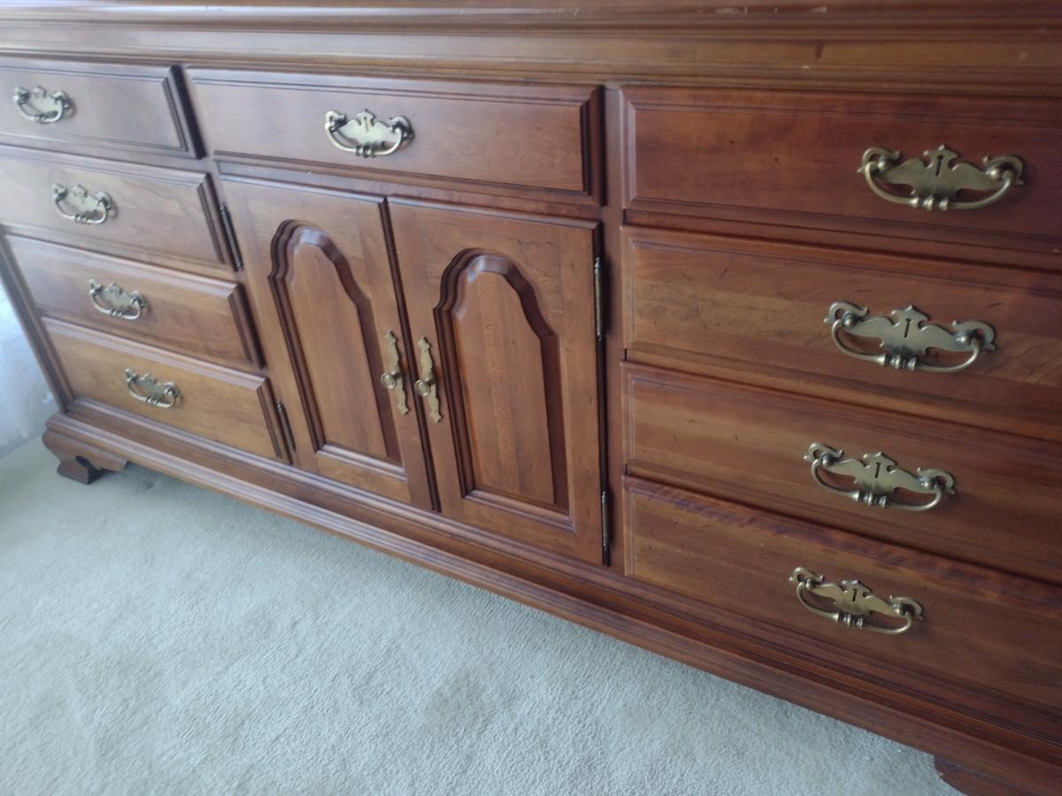 Thomasville Cherry Finish 9 Drawer Stretch Dresser with Sweater Drawers and Mirror