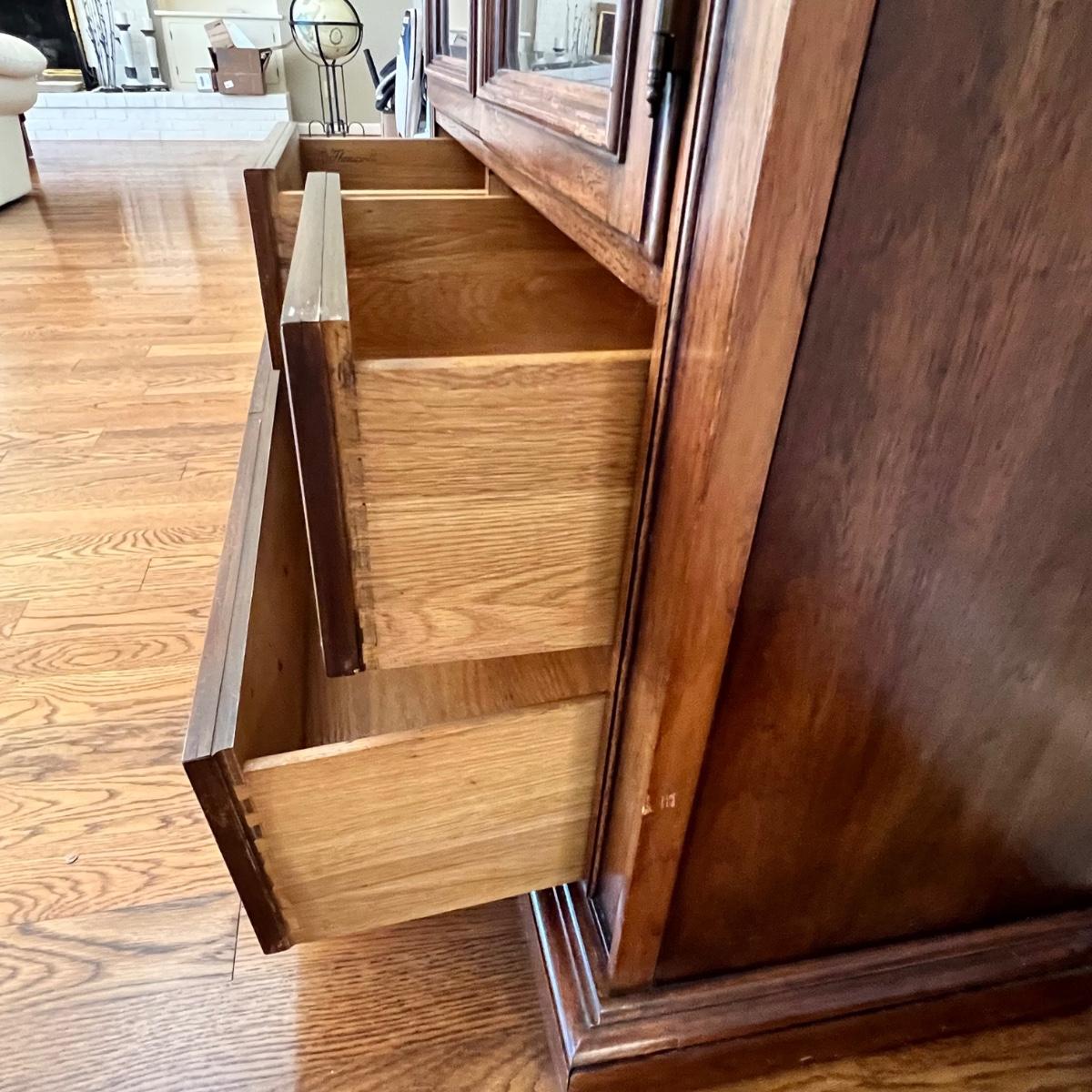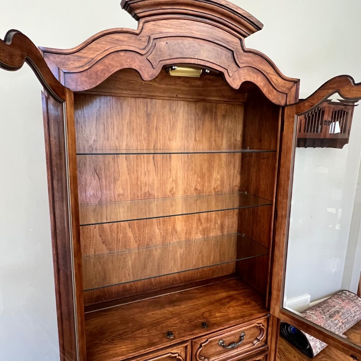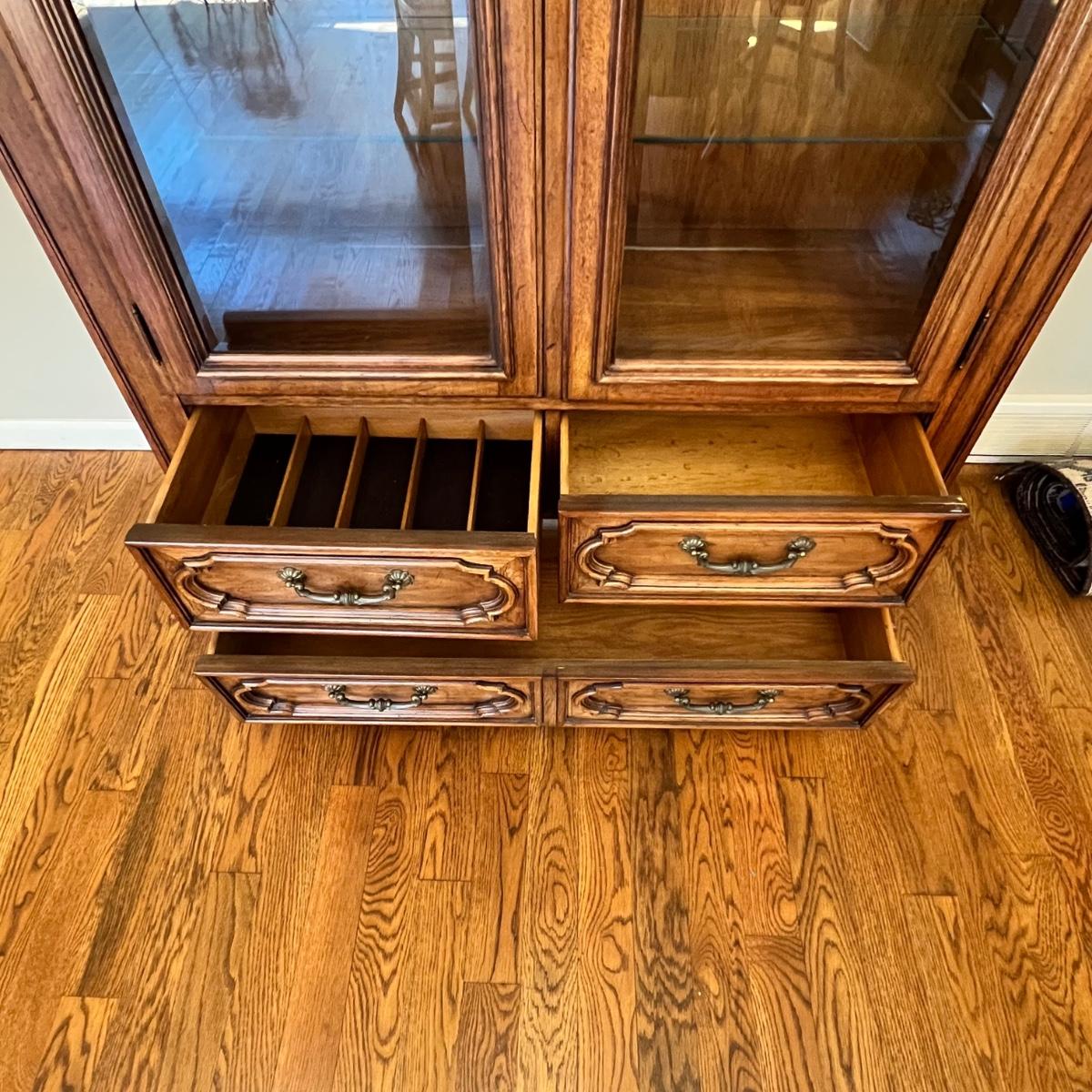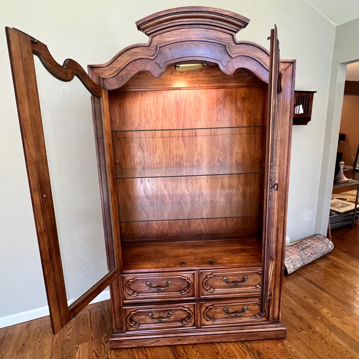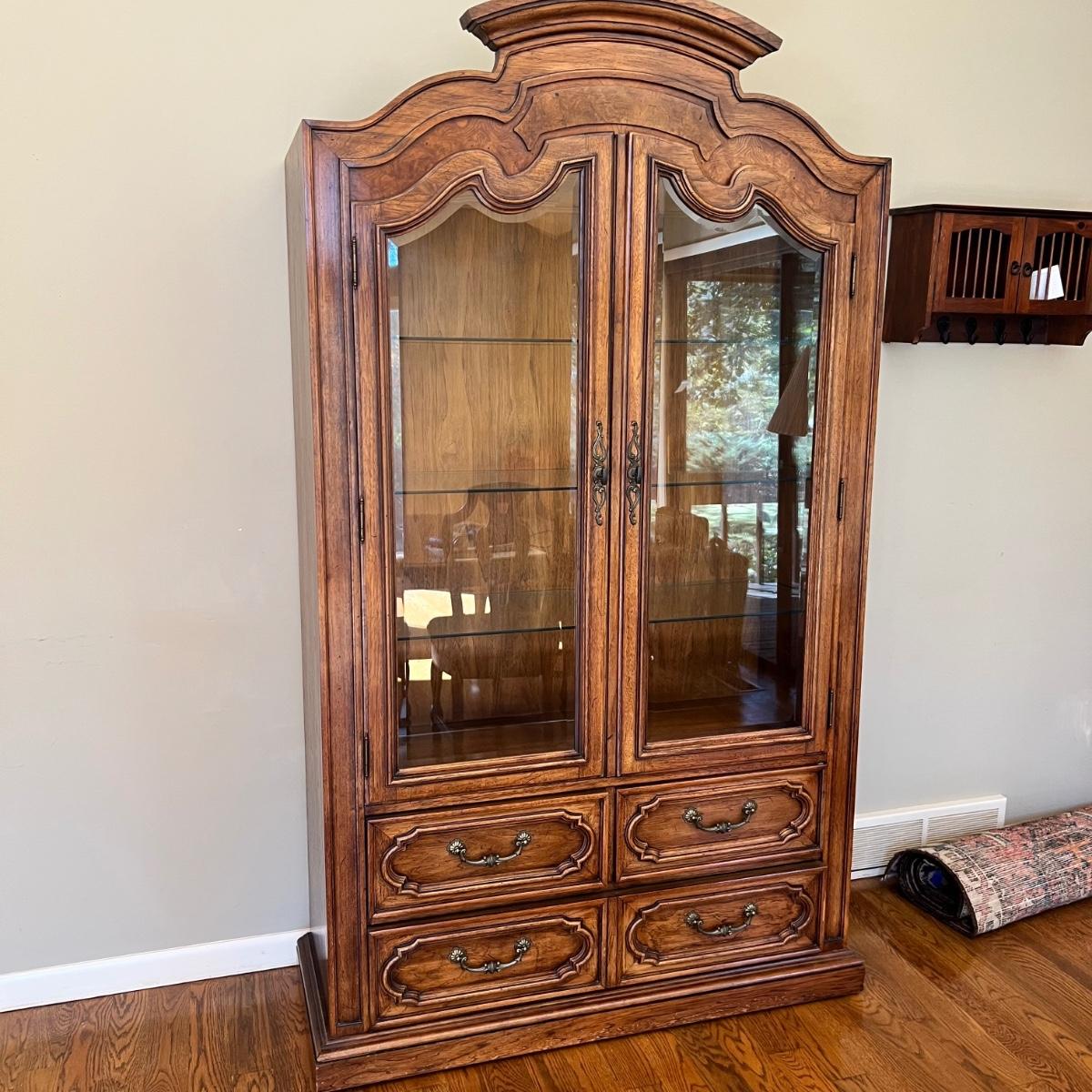Handsome solid wood china cabinet features three dovetailed drawers and adjustable glass shelves with plate rails. These glass shelves can be removed for transport. Note that this is one unit.