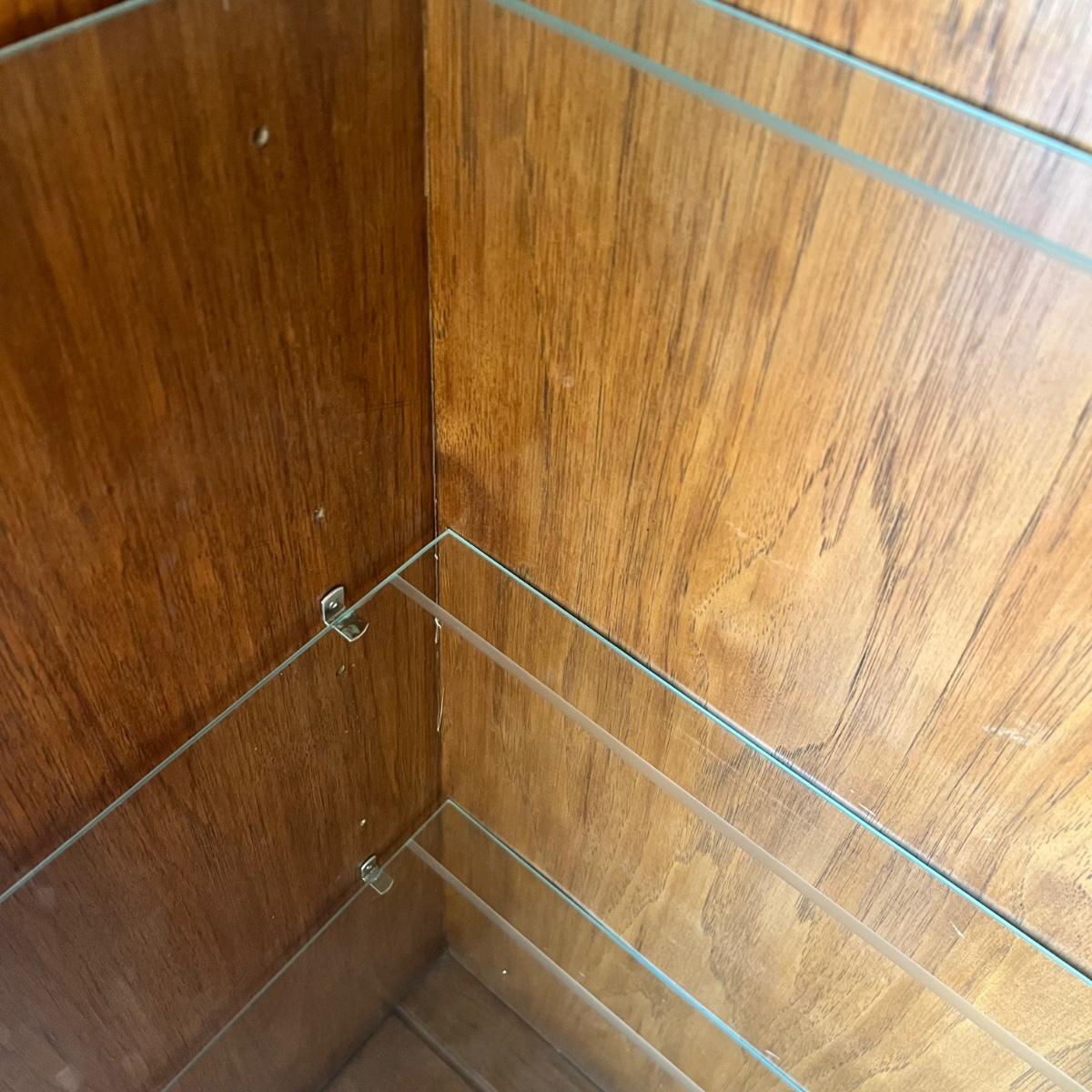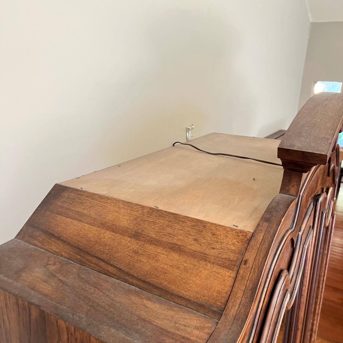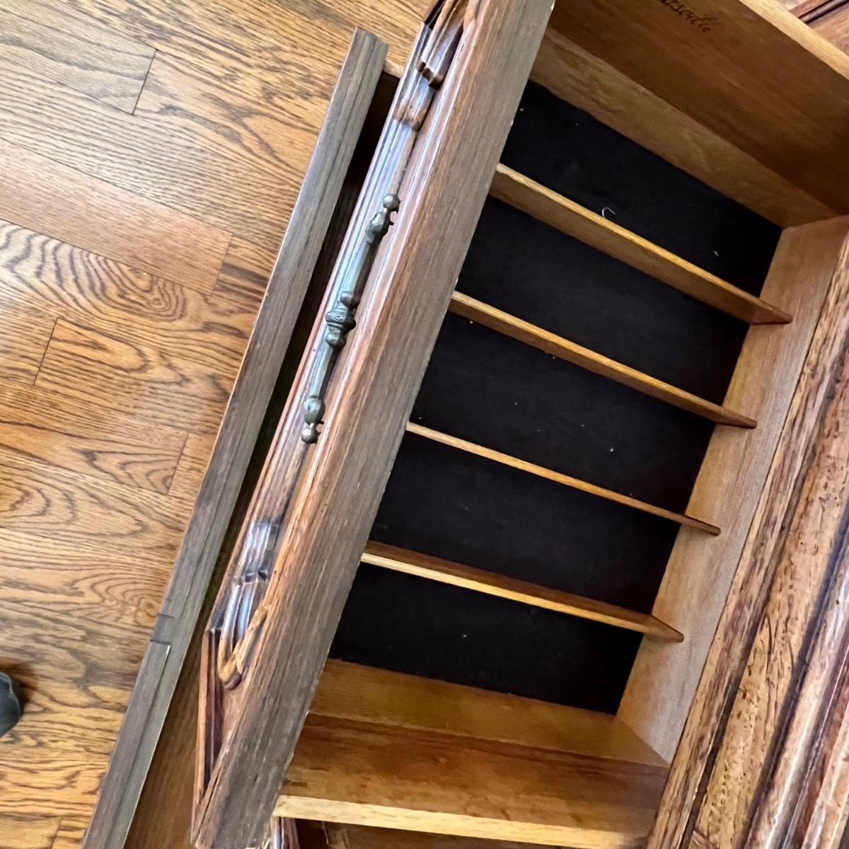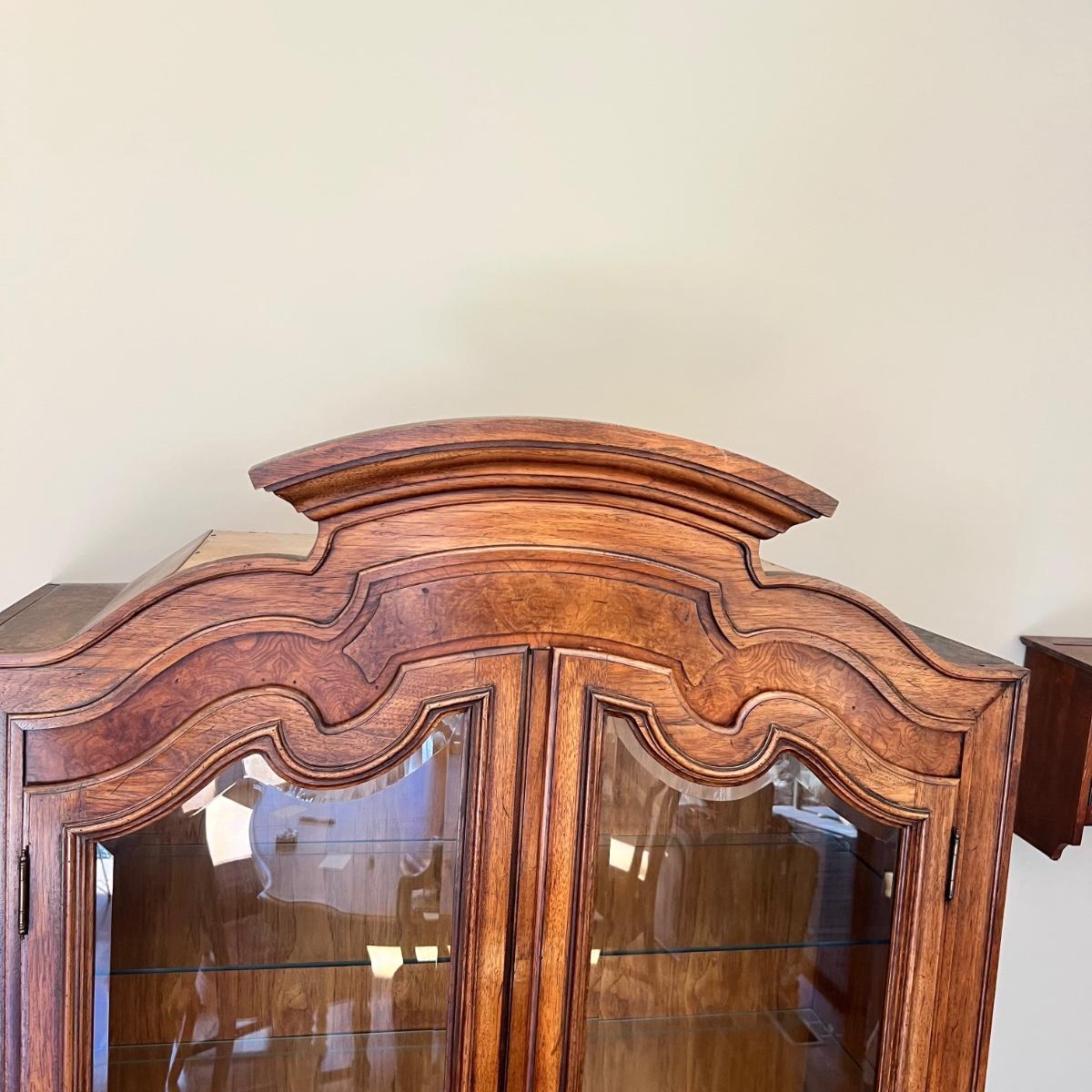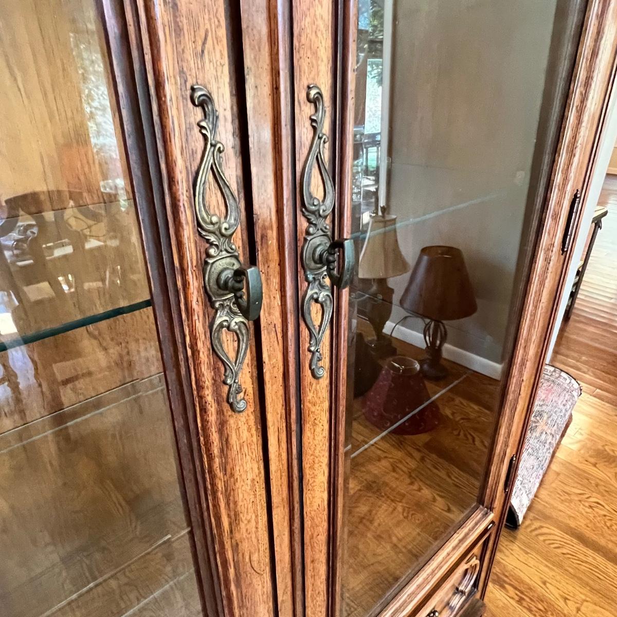 Handsome solid wood china cabinet features three dovetailed drawers and adjustable glass shelves with plate rails. These glass shelves can be removed for transport. Note that this is one unit.