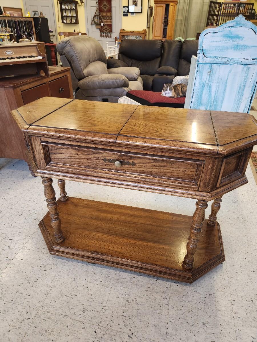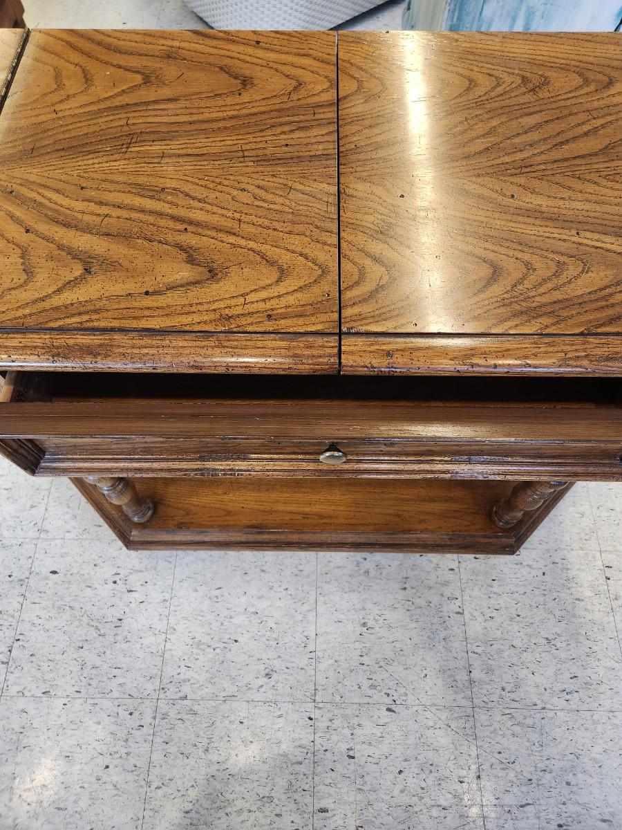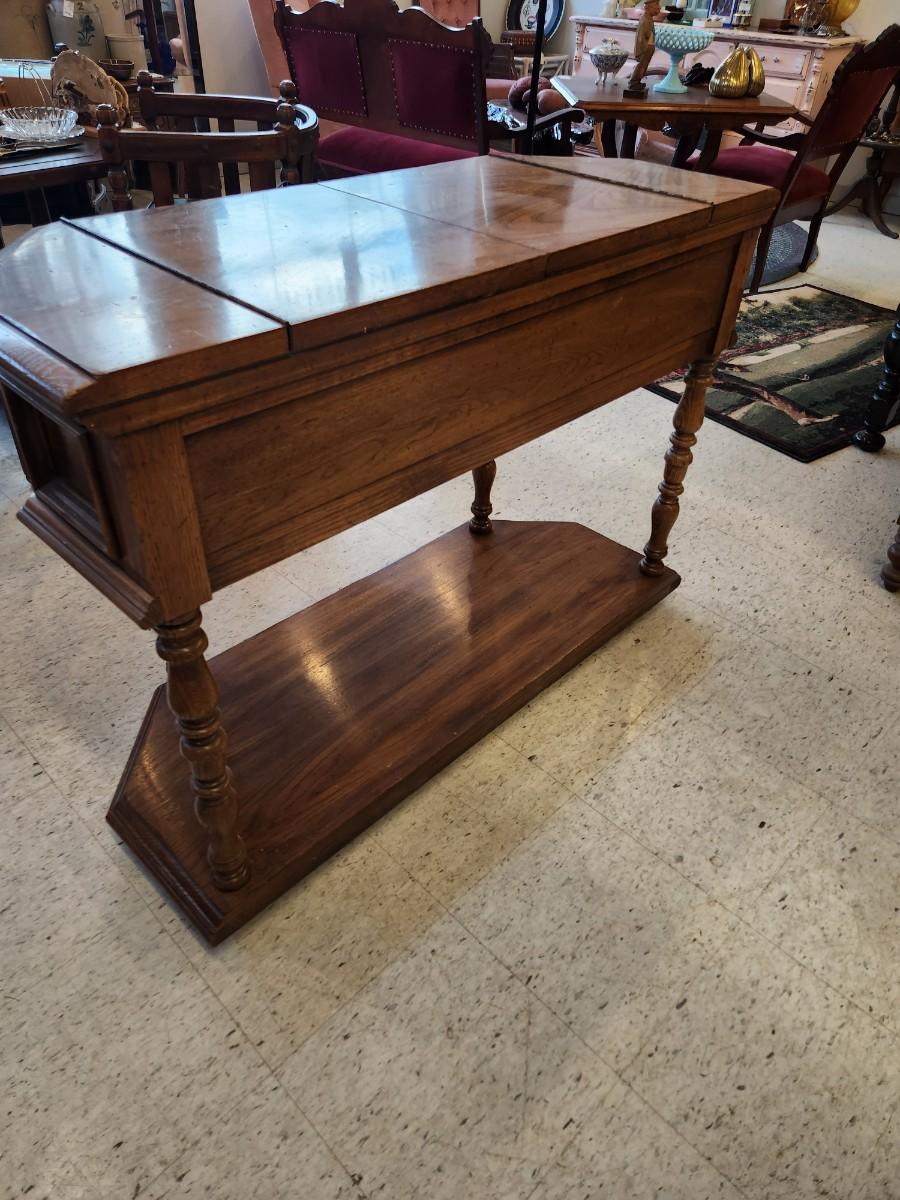 Interesting server with hinged top revealing a Formica serving surface that is heat and moisture resistant. Neat piece that matches the china cabinet in previous lot