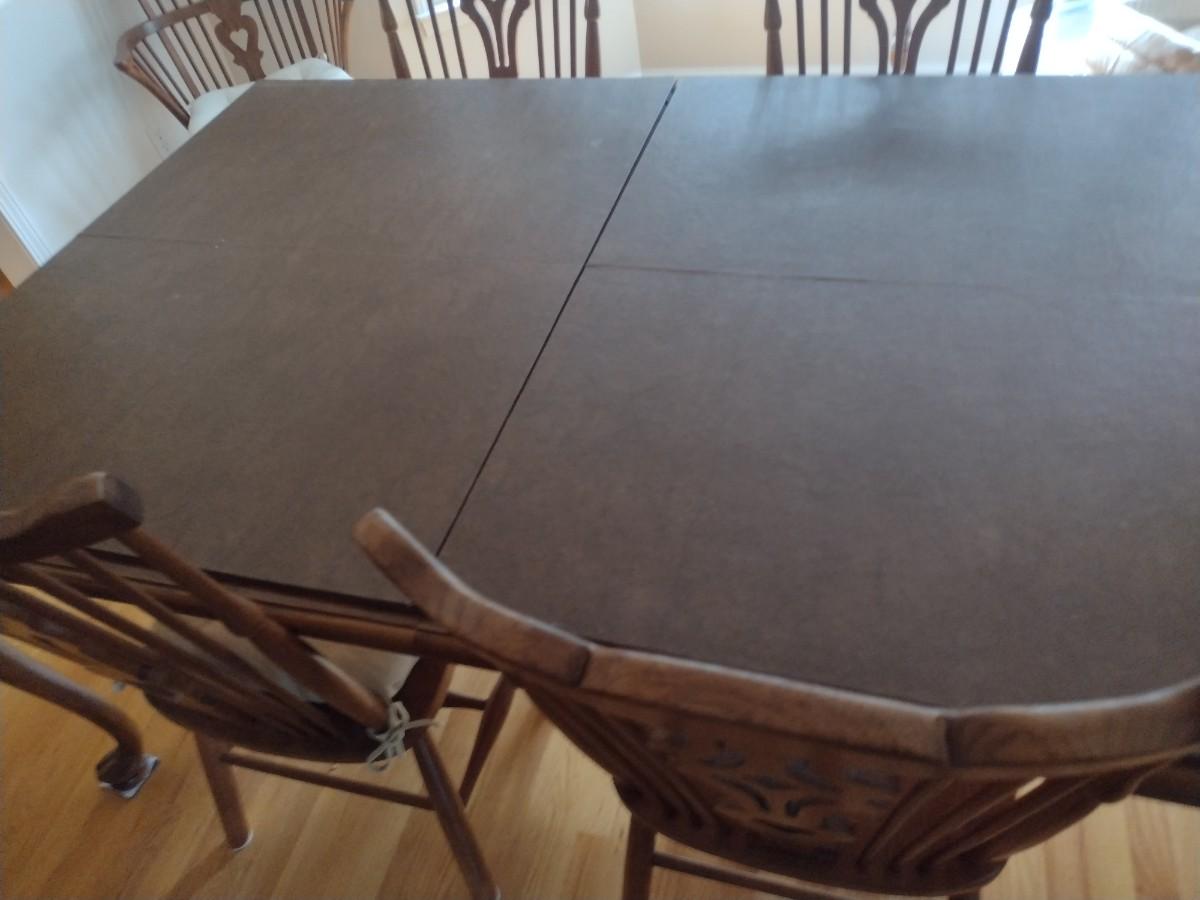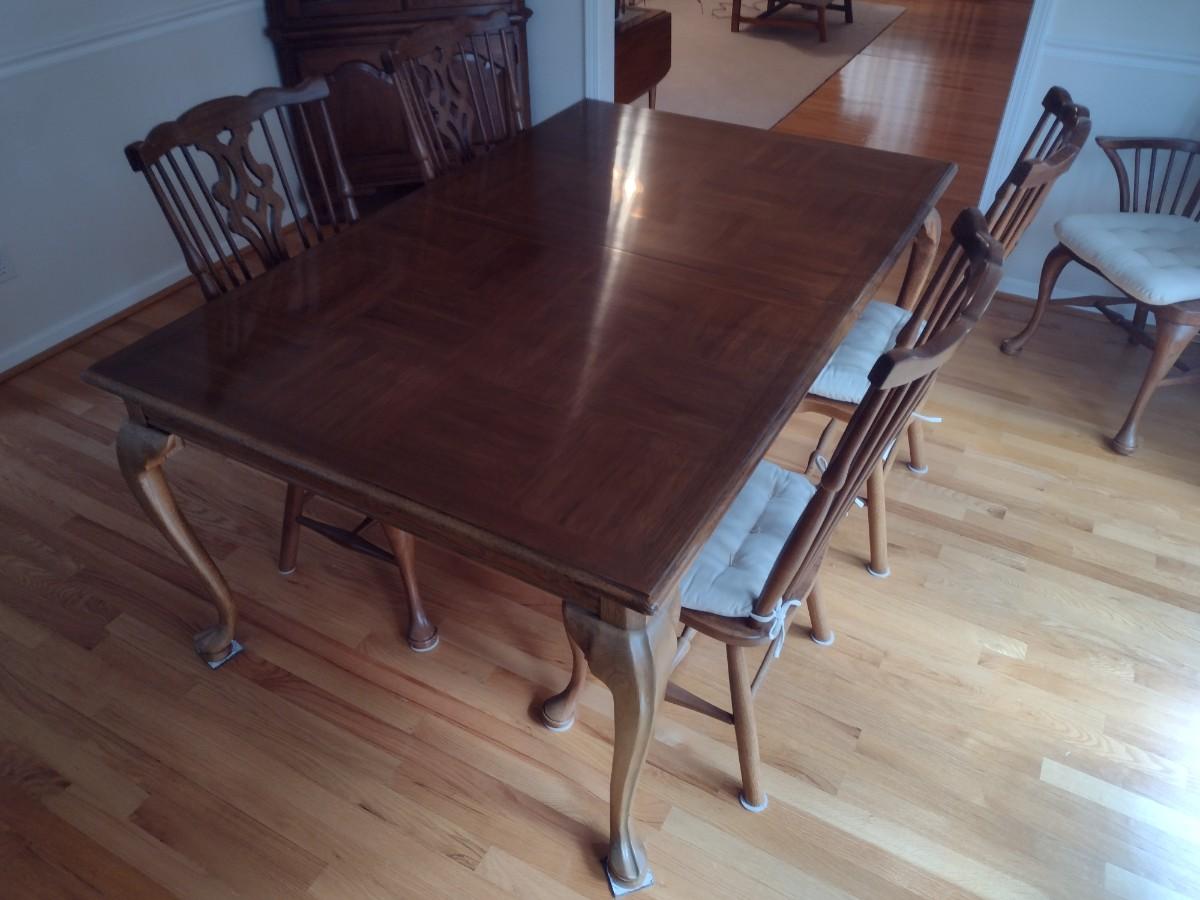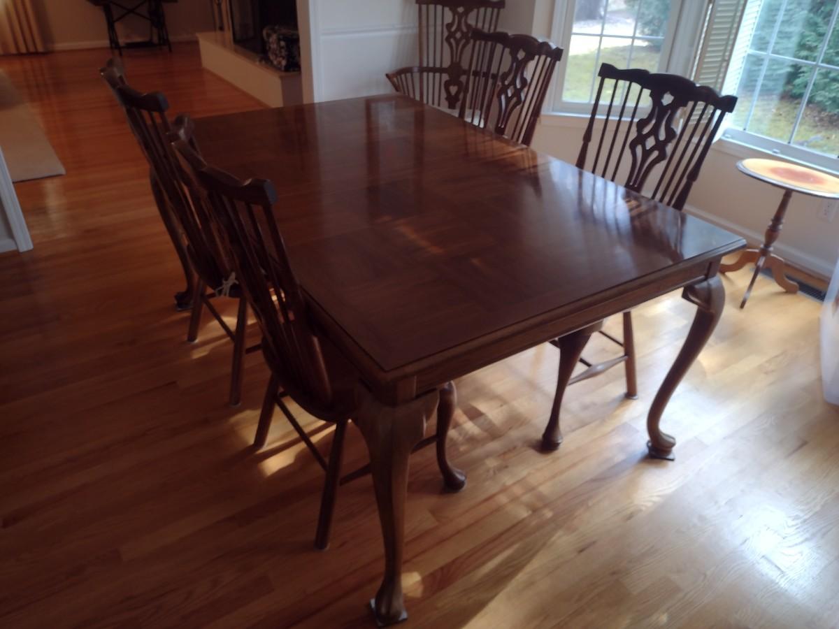 Thomasville Dining Table and Six Matching Chairs with Two Carver Chairs and Two Leaf Inserts and Cover Item stored within feet of driveway for easy and quick load.