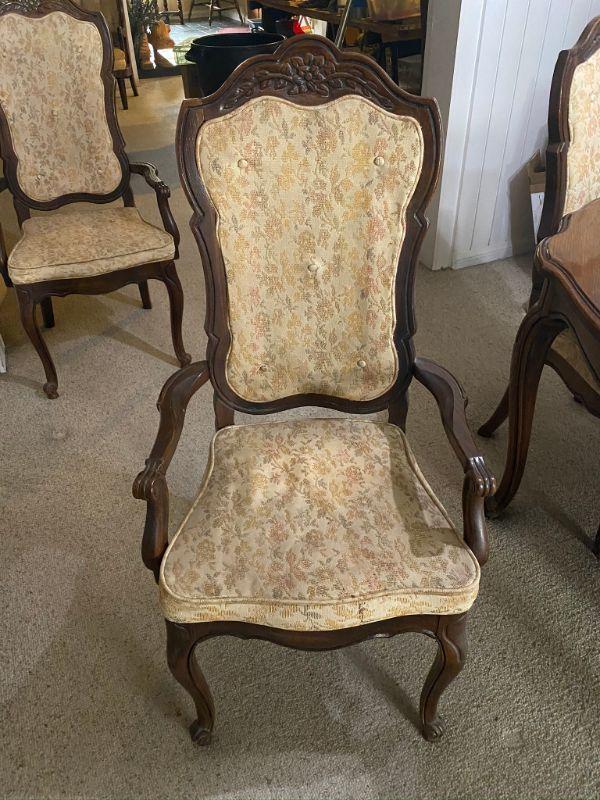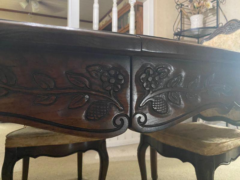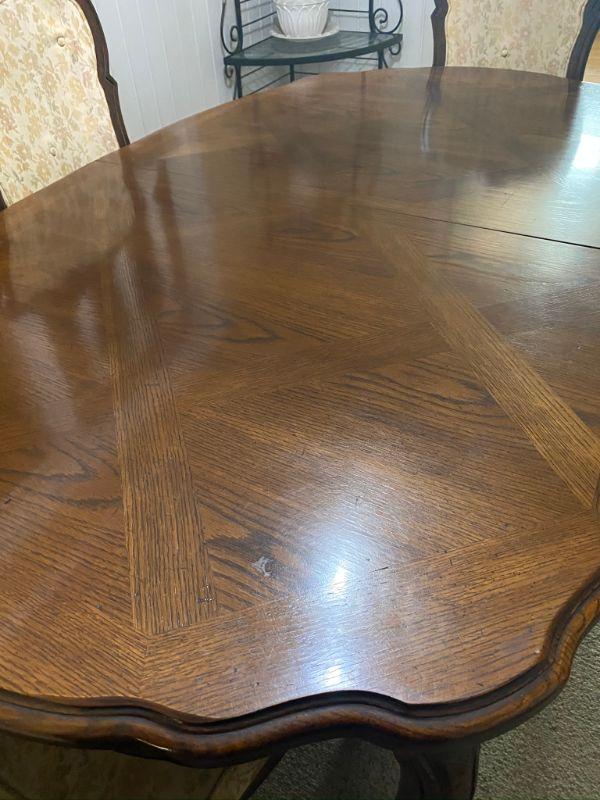 Thomasville dining room table & chairs set. Comes with 4 side chairs and 2 arm chairs. Currently table is at 45”w x 65”l x 30”t. There is extra leaves to expand the table. Good Condition.