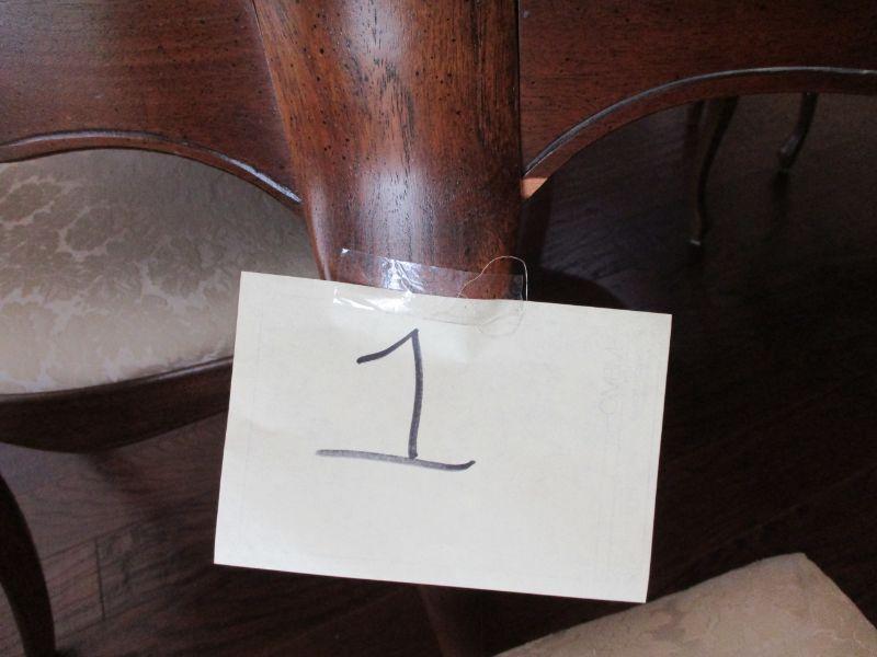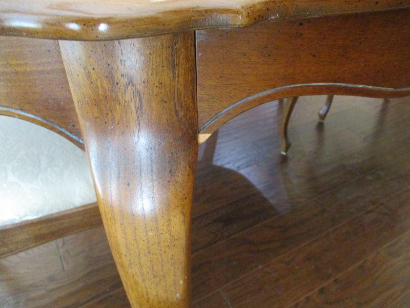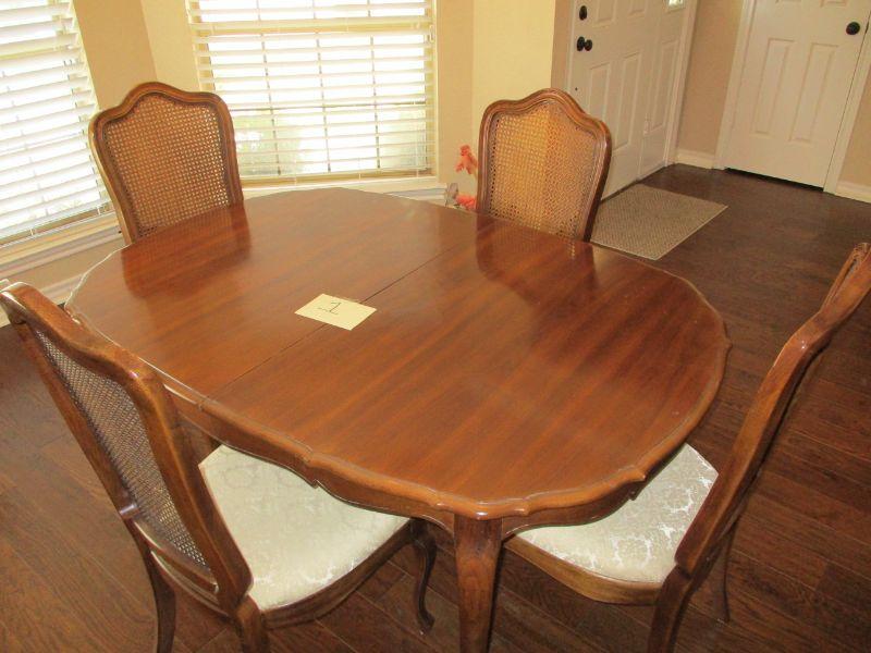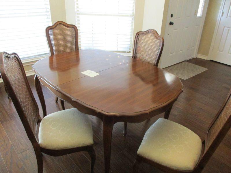 Thomasville formal dining table with one leaf. Includes 4 white upholstered chairs. Original upholstery. Floral design. Pecan Wood. Great condition. Measures 41in width/60in length without the leaf.