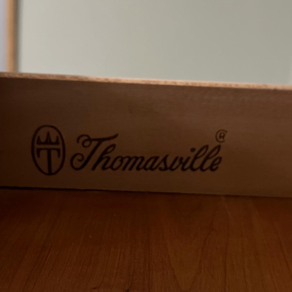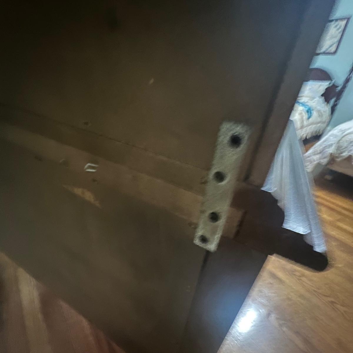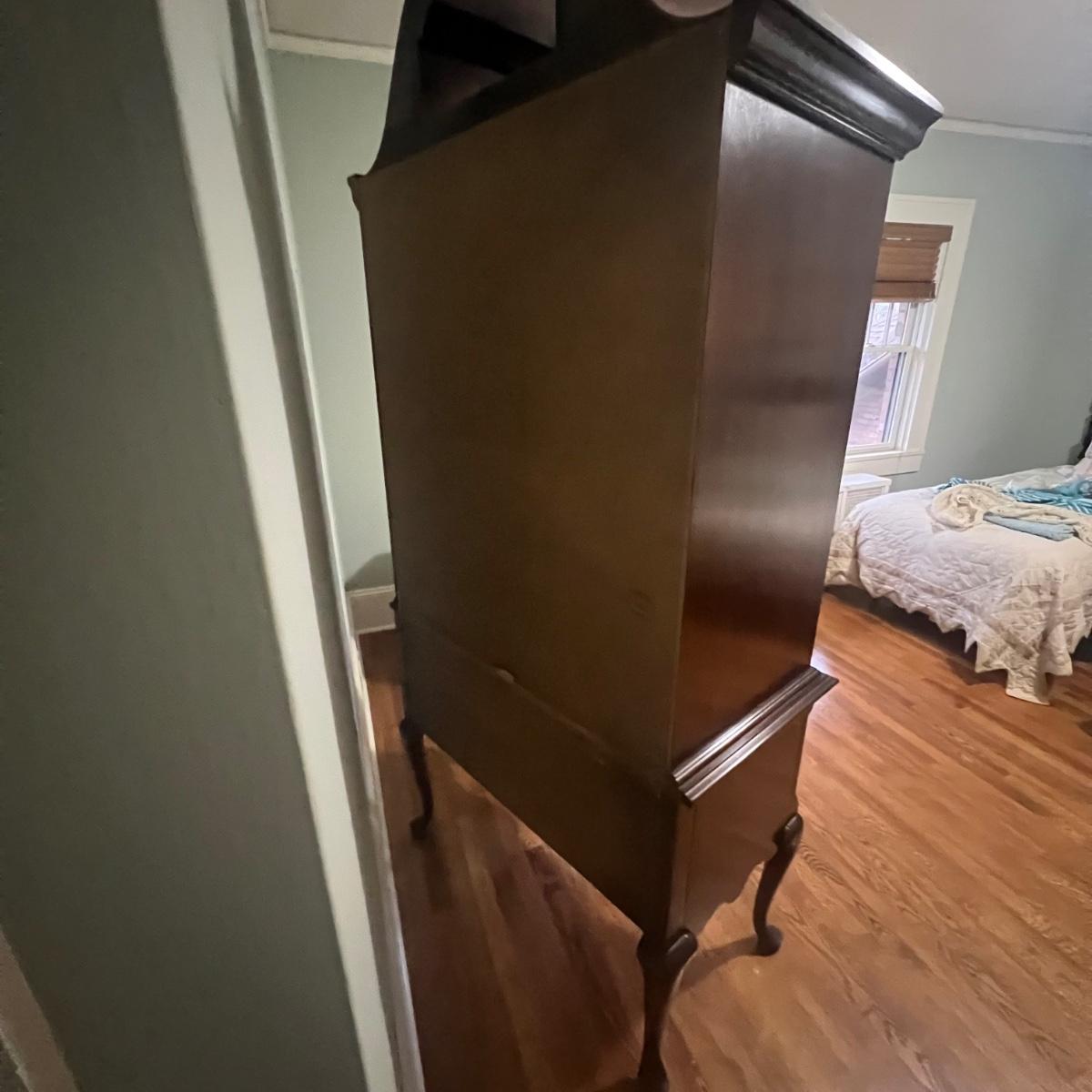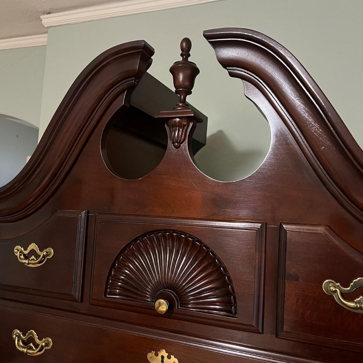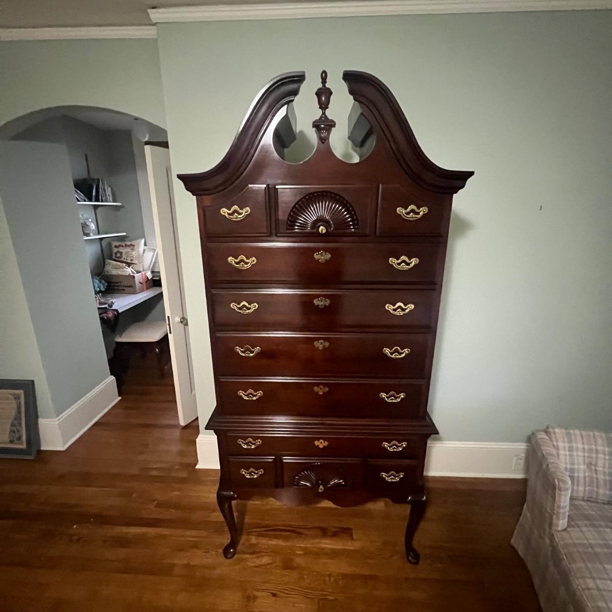 Beautiful solid wood dresser, possibly cherry wood. 11 dovetail drawers with brass handles. Appears to be two sections, Phillip’s head screwdriver needed to separate.