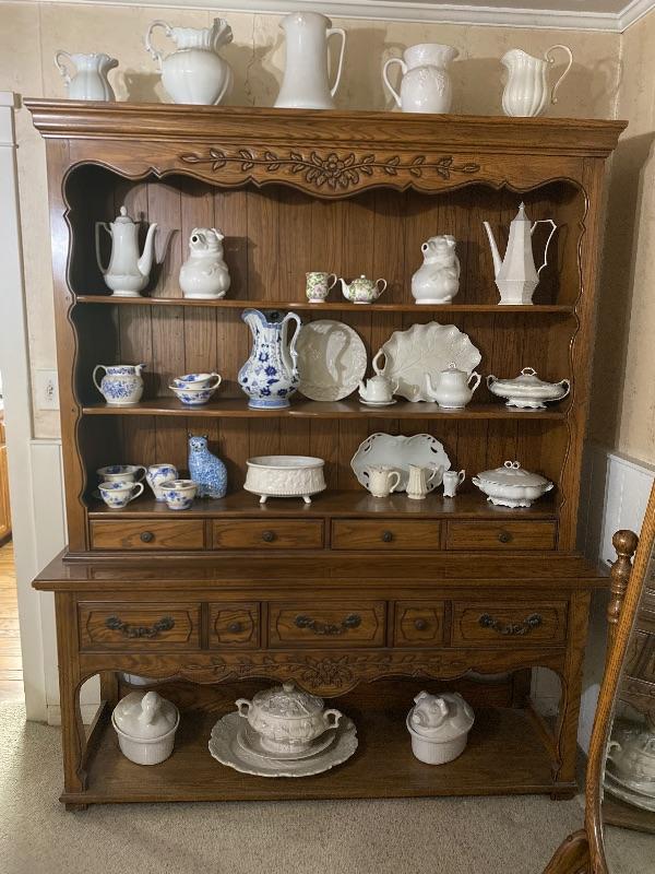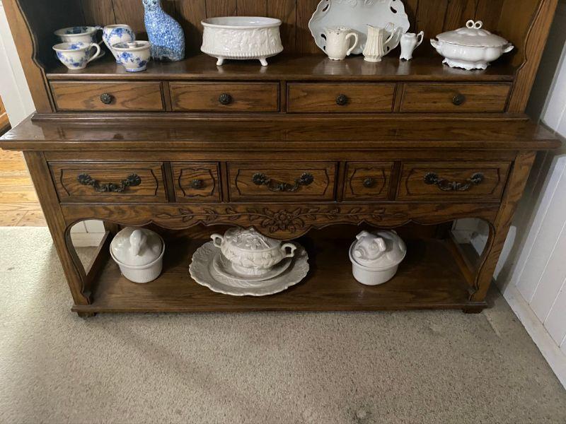 Thomasville open front hutch buffet. Floral carved accent. Large at 66”w & 81”t. The bottom is 18”d, while the top is 11.5”d. 5 drawers total. In good condition. *Contents not included*