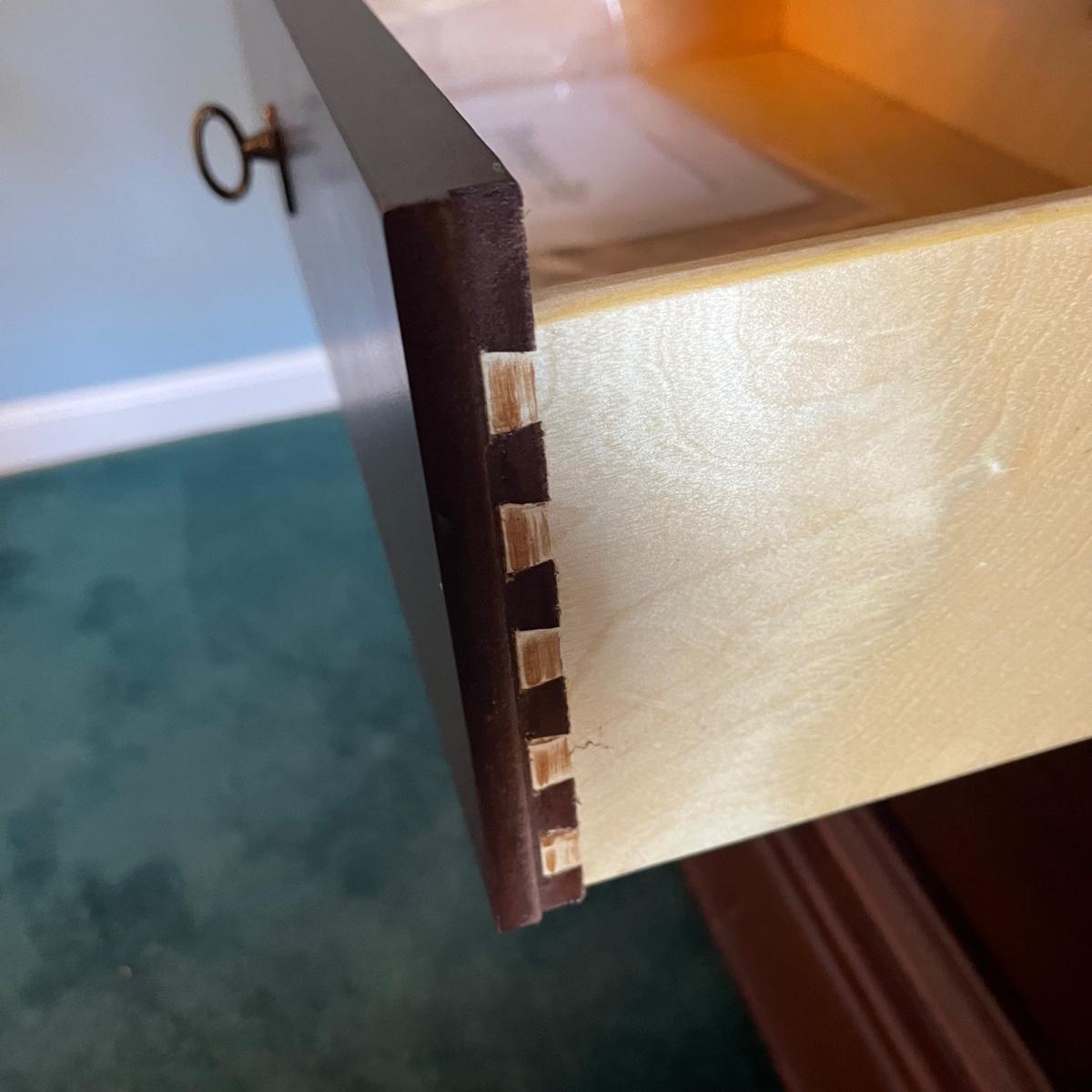 Wooden two drawer Thomasville night stand. The drawers feature dovetailing and decorative drawer pulls.