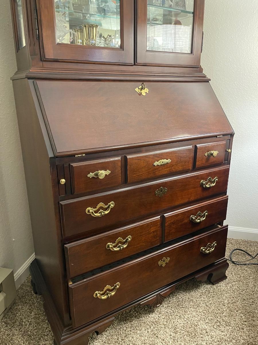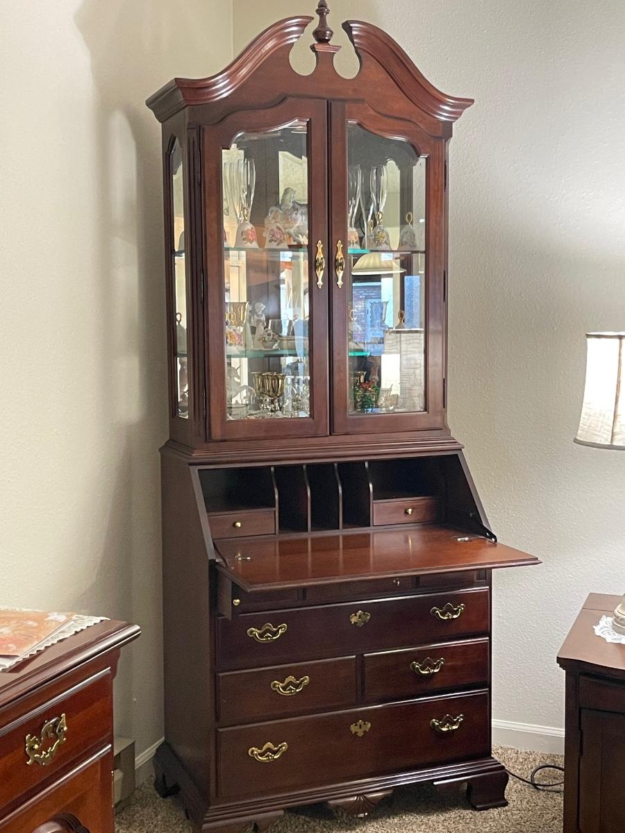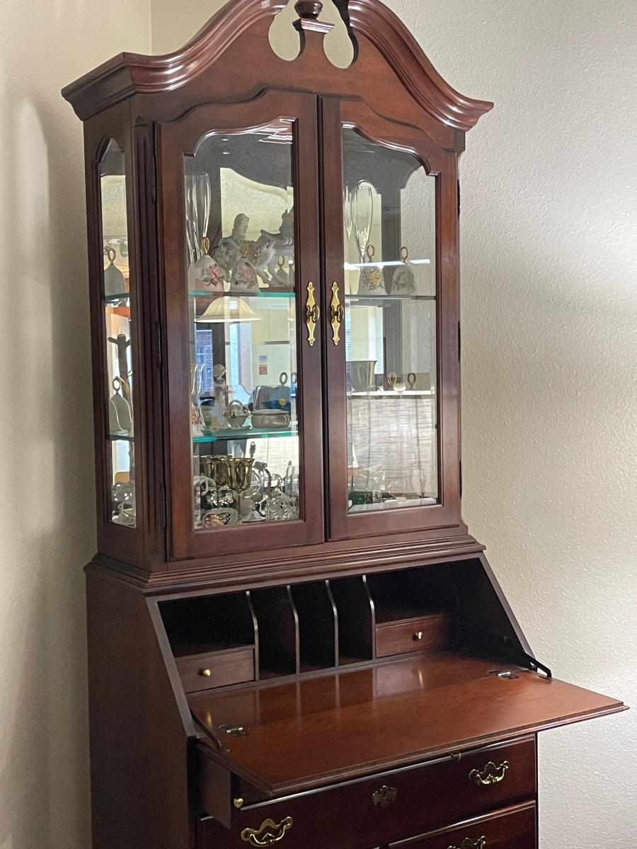 Elegant Thomasville secretary desk with an upper glass display hutch