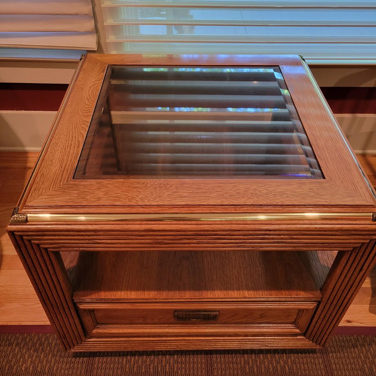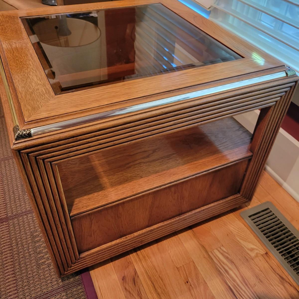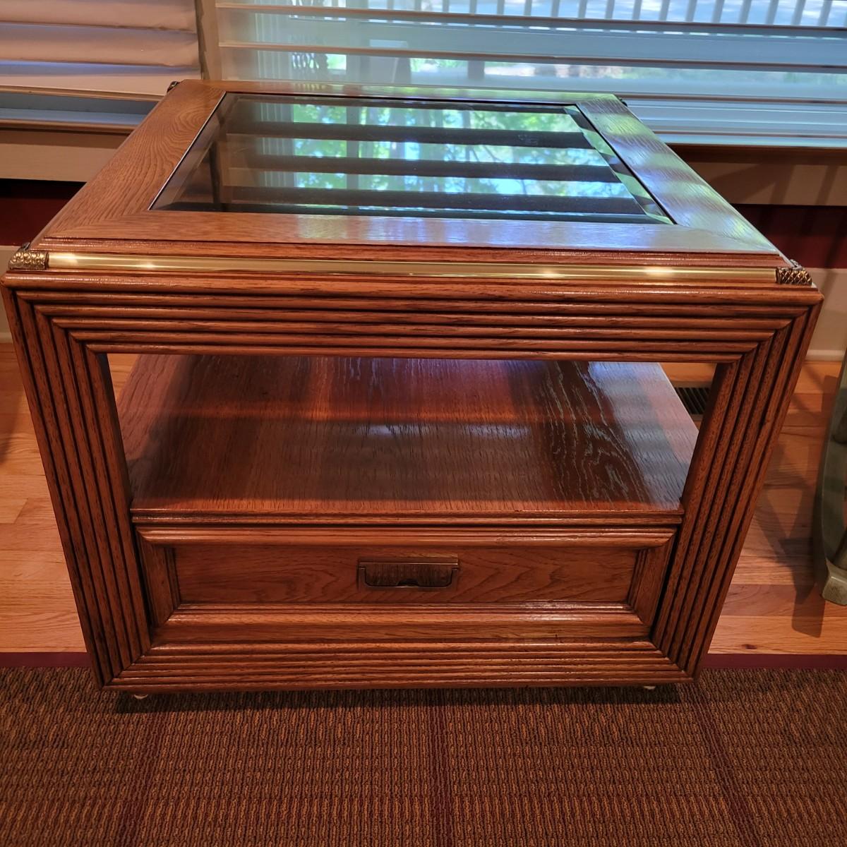 A Thomasville side table with a beveled tempered glass insert and golden accents. This table appears to be solid oak and has a dovetailed drawer with a brass handle. It measures approximately 26" x 26" x 21.5"H. Local pickup only. Winning bidder must bring assistance to help move and load this item due to its weight and/or size.