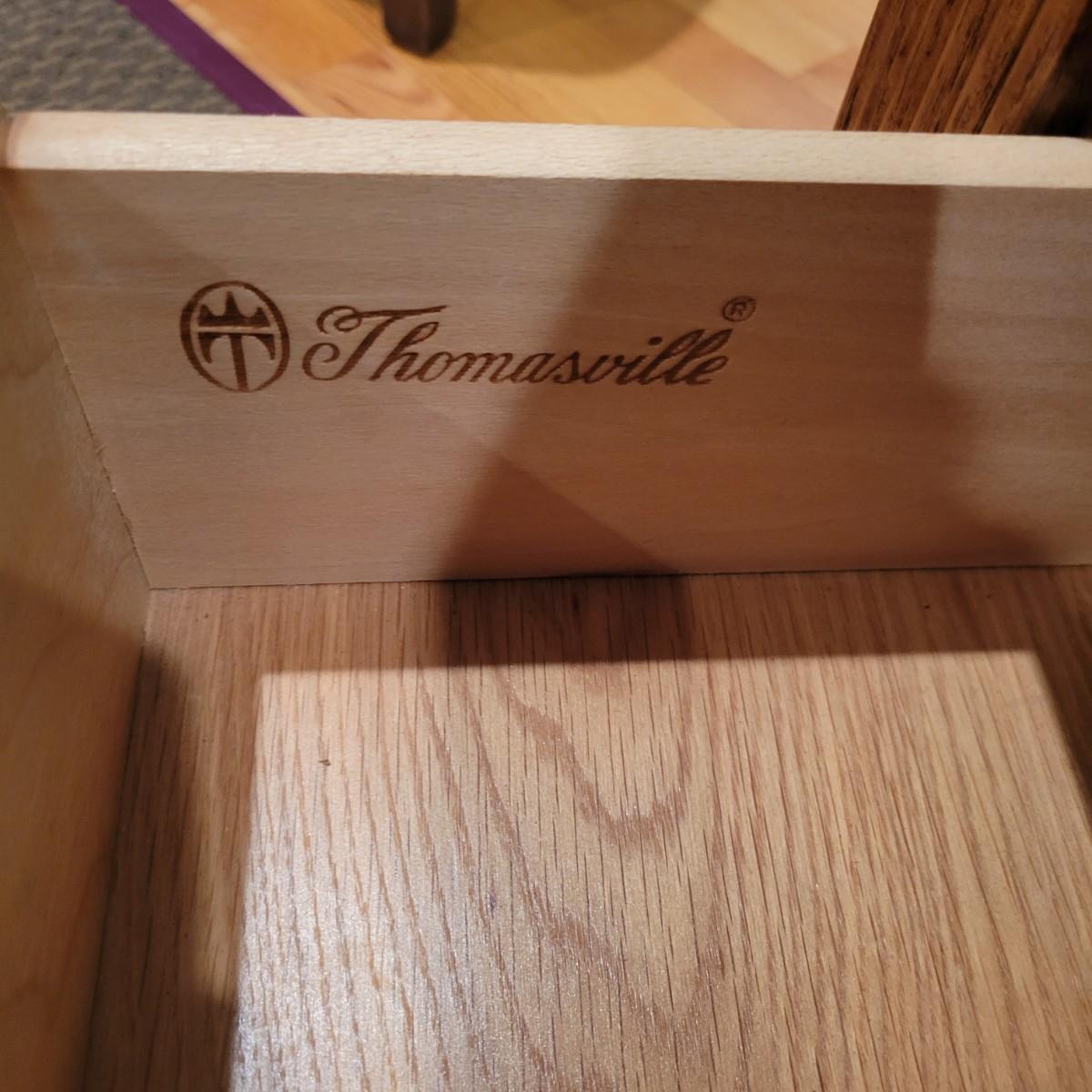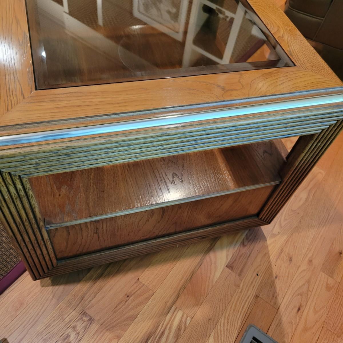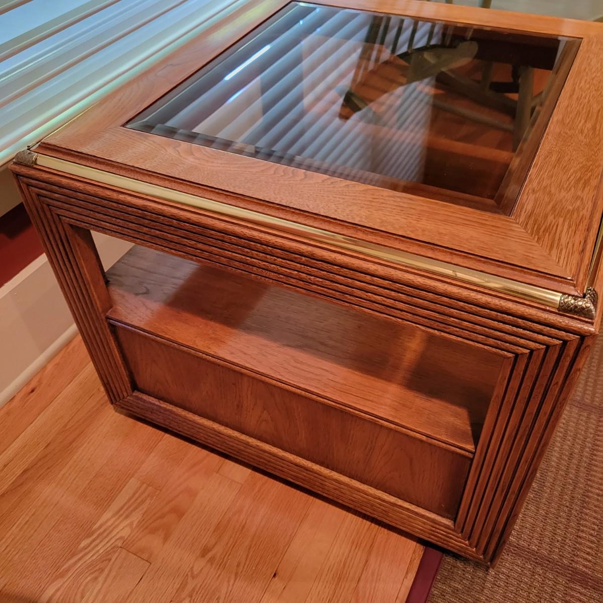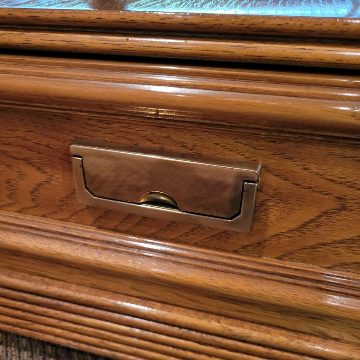 A Thomasville side table with a beveled tempered glass insert and golden accents. This table appears to be solid oak and has a dovetailed drawer with a brass handle. It measures approximately 26" x 26" x 21.5"H. Local pickup only. Winning bidder must bring assistance to help move and load this item due to its weight and/or size.