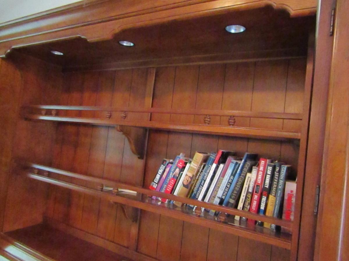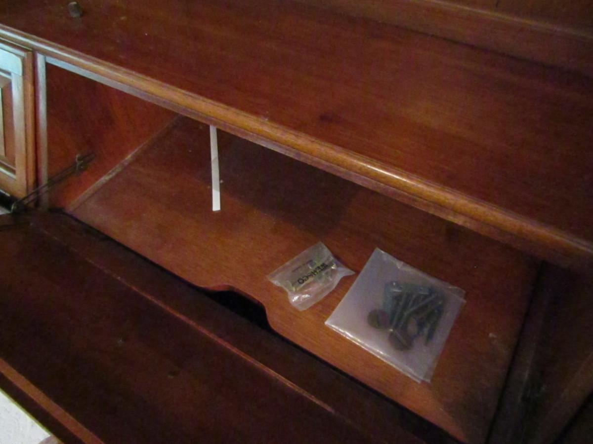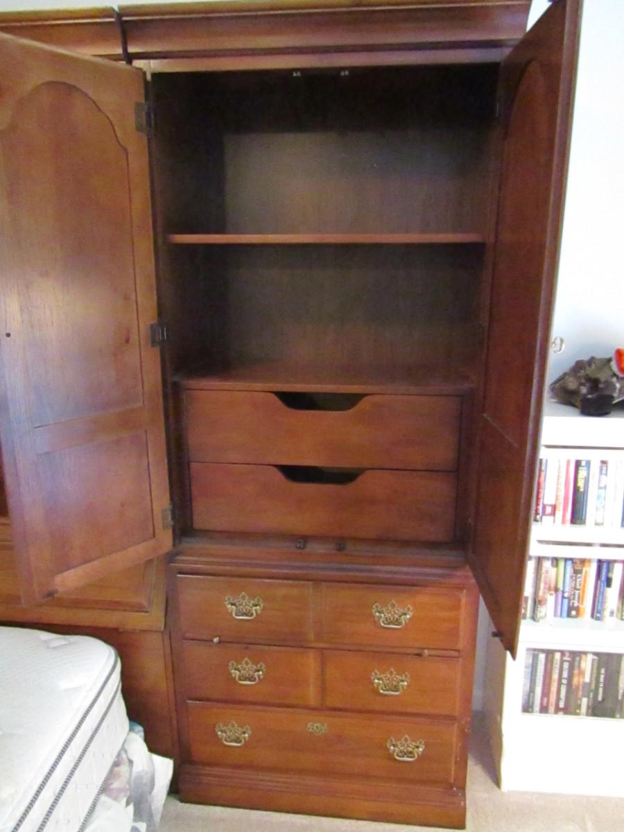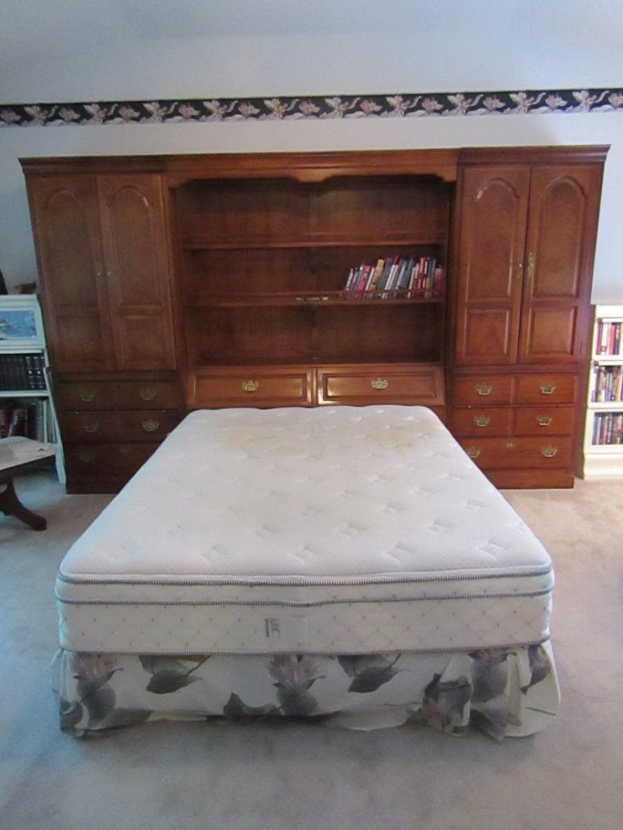 Thomasville Solid Wood Headboard with Storage and Queen Size Bed. Current mattress is approx 58" wide and has some staining.