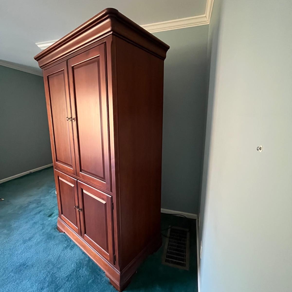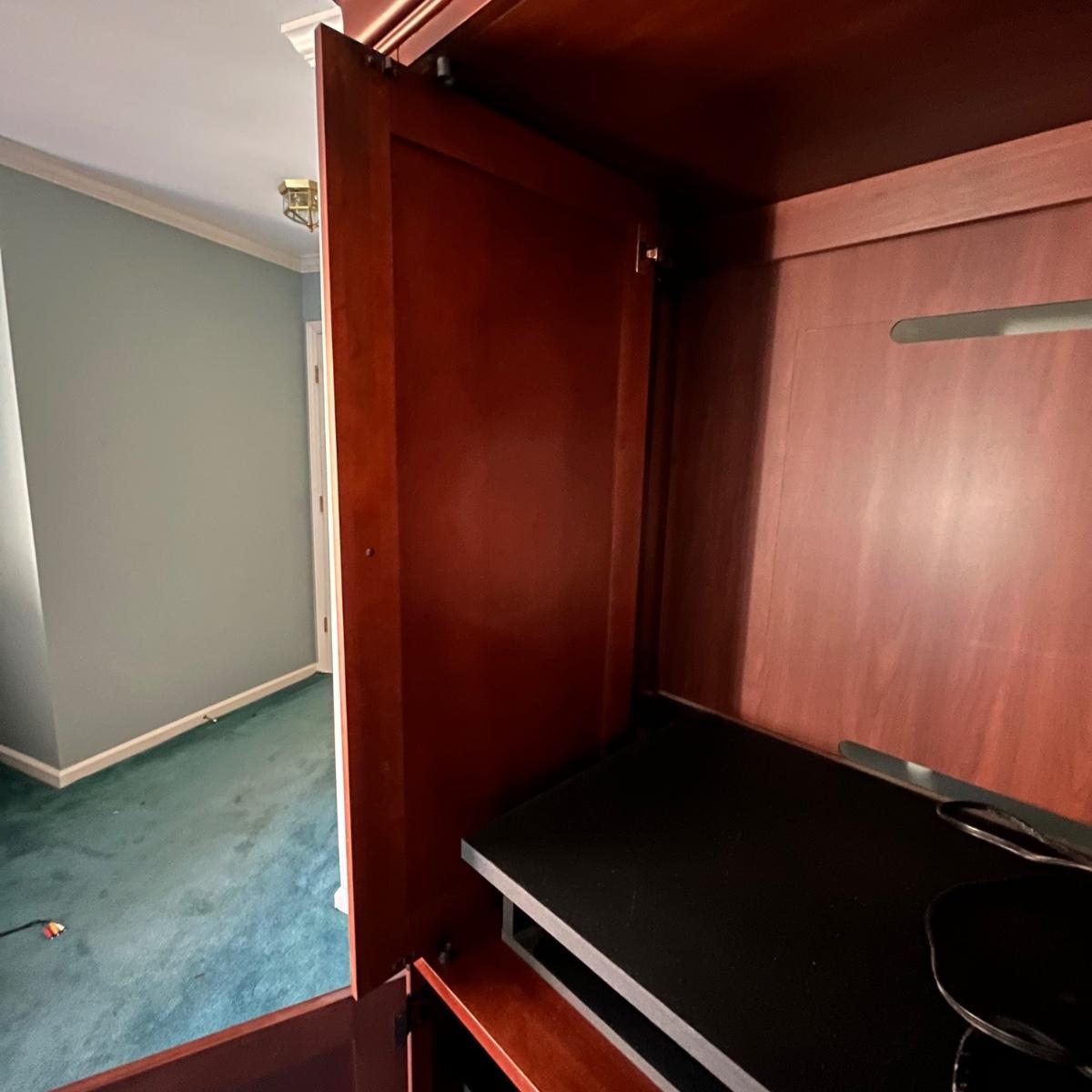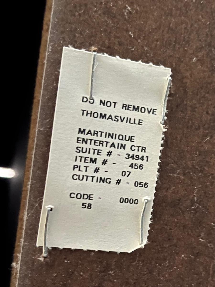 This is a lovely Thomasville entertainment center with two sets of doors. The upper section would house a tv and has gliding doors that slide into the inner side of the cabinet. The lower doors open onto a set of shelves. Shelves are adjustable.
