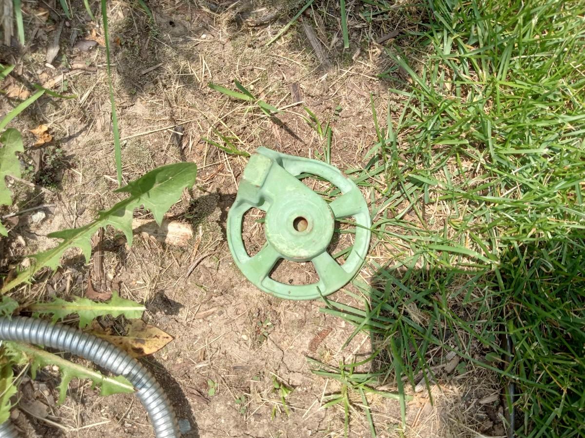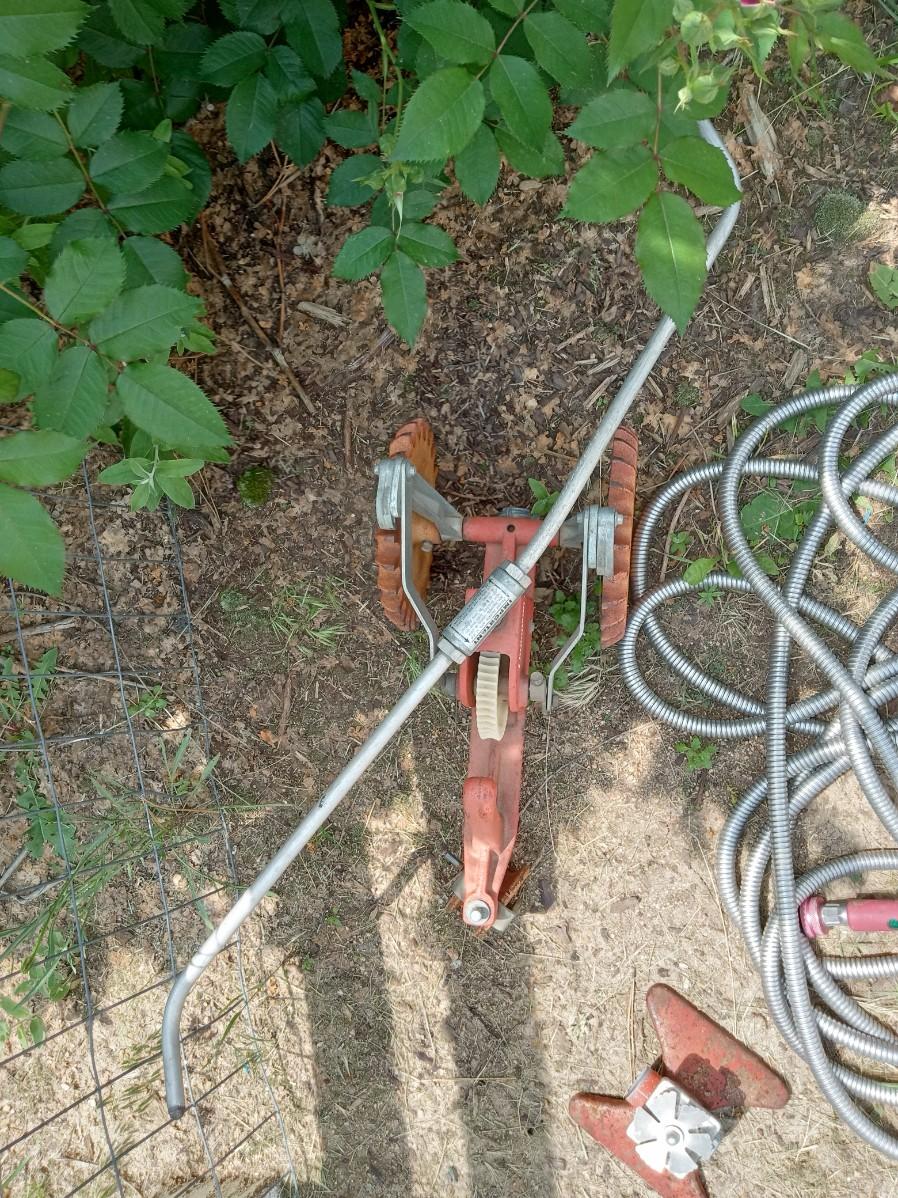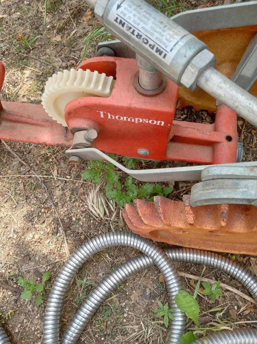 THOMPSON TRACTOR SPRINKLER, 2 OTHER METAL SPRINKLERS AND A METAL FLEXIBLE GARDEN HOSE