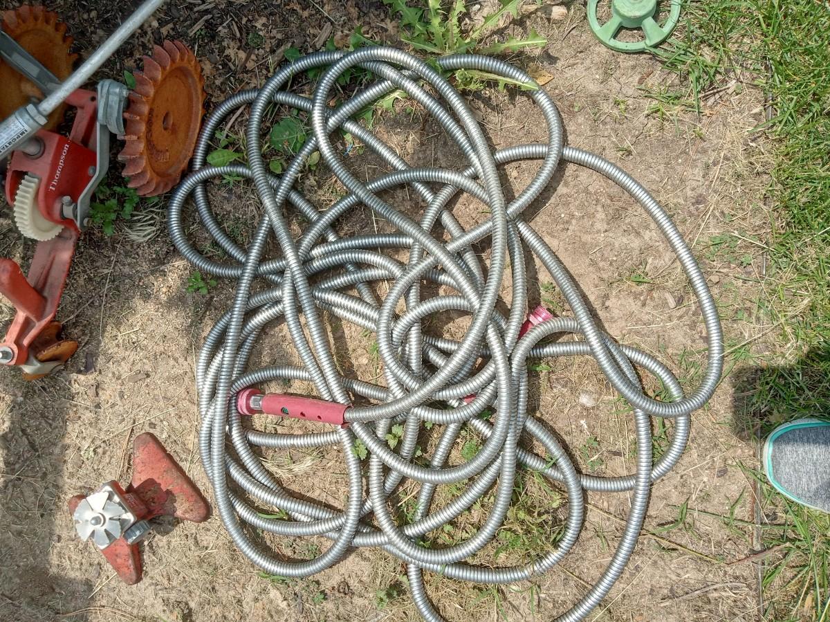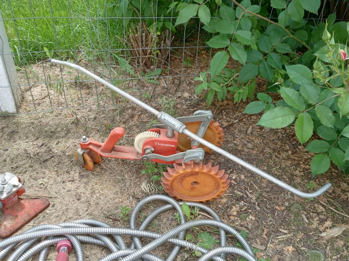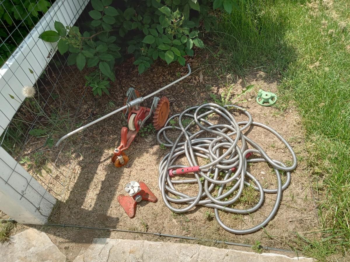 THOMPSON TRACTOR SPRINKLER, 2 OTHER METAL SPRINKLERS AND A METAL FLEXIBLE GARDEN HOSE