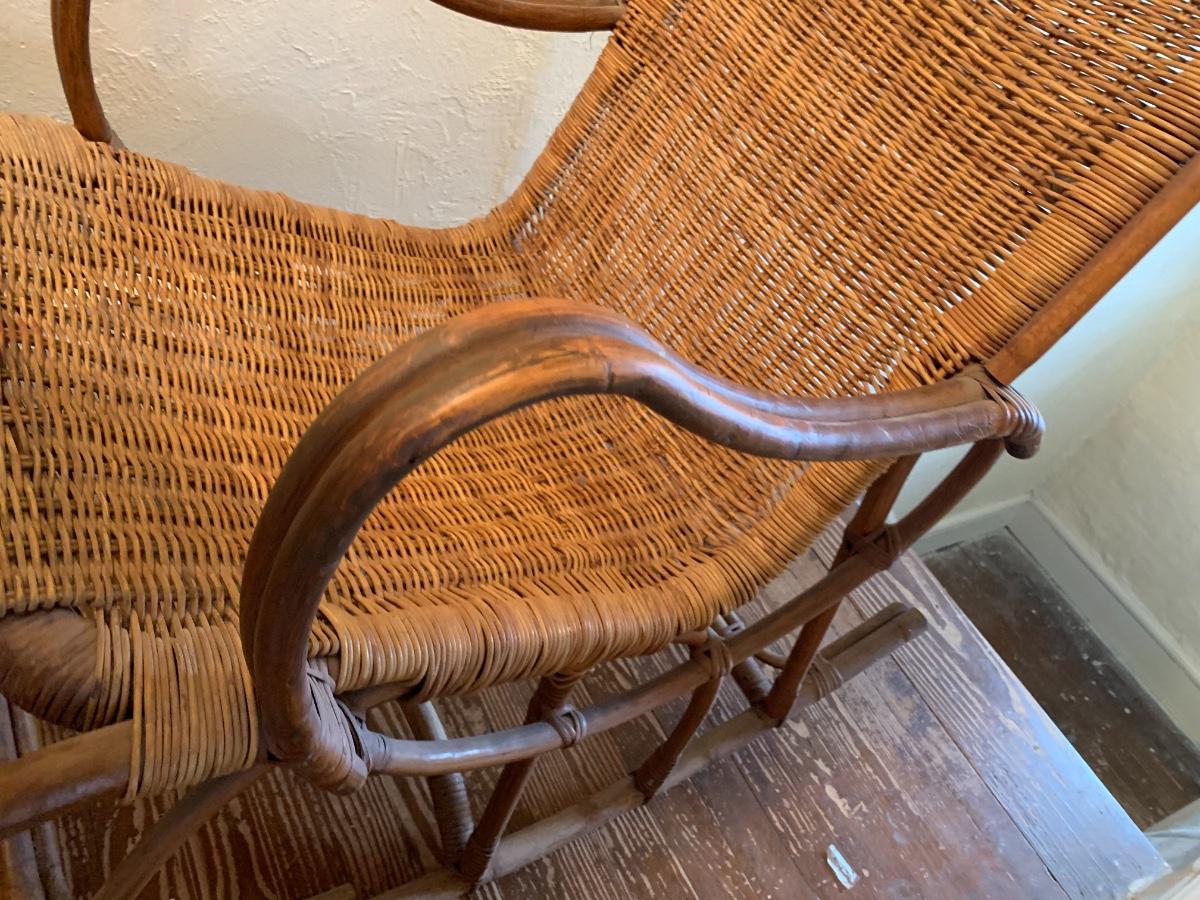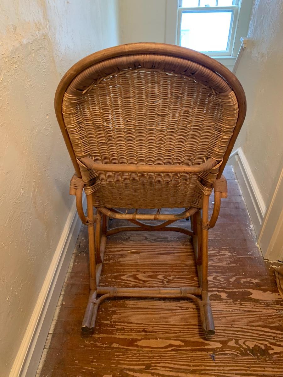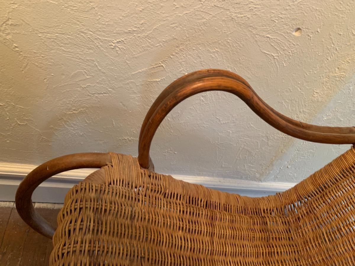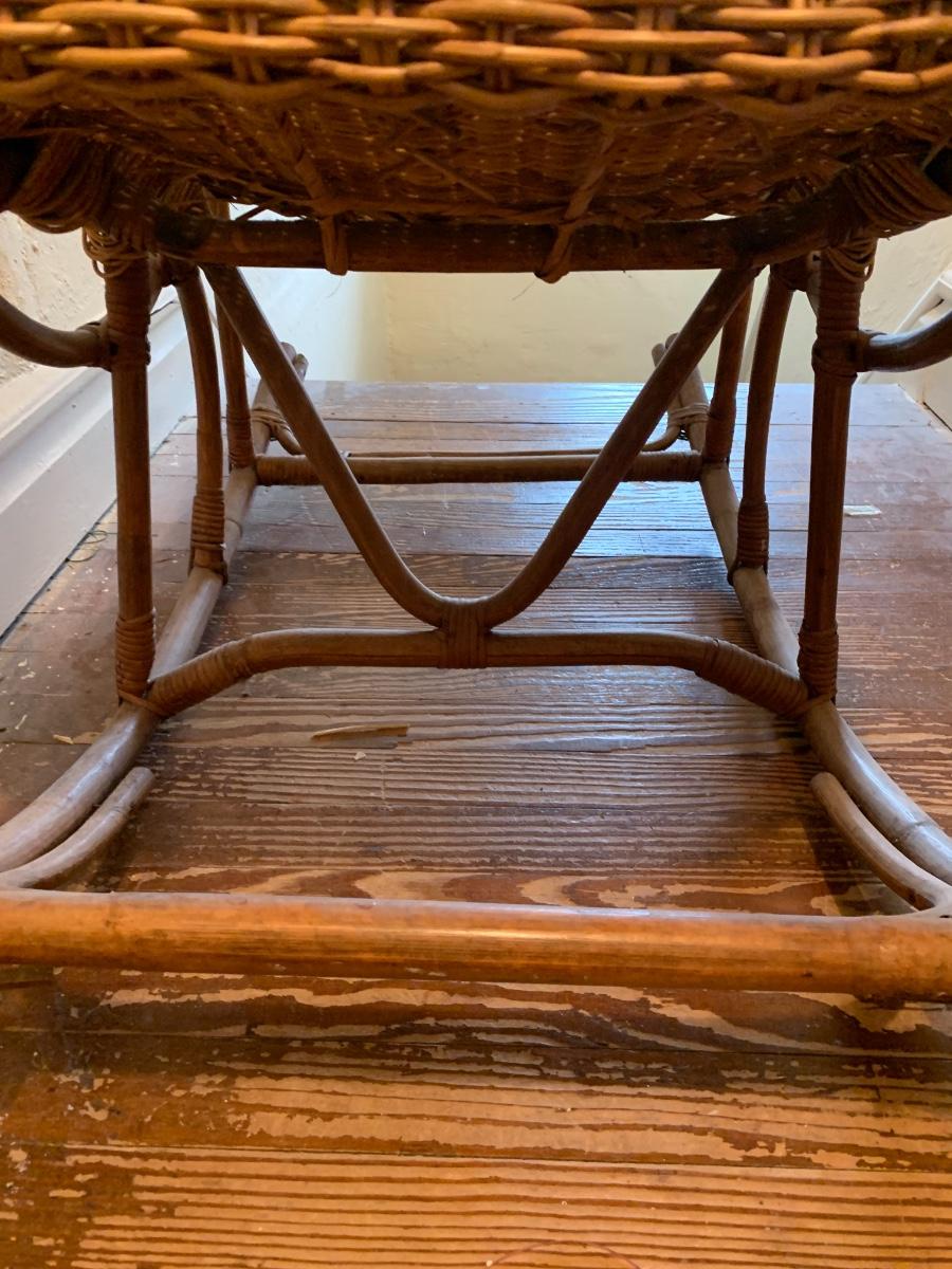 This piece is in good vintage condition and the frame is extremely solid. The wood and cane show some wear from age/use. Any signs of damage in photos, one loose piece of rattan on top, and some unwinding on one side on 1 rocker
