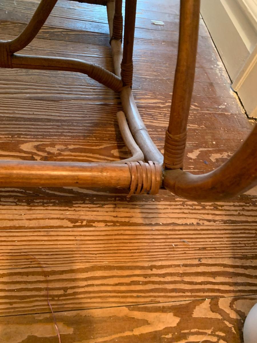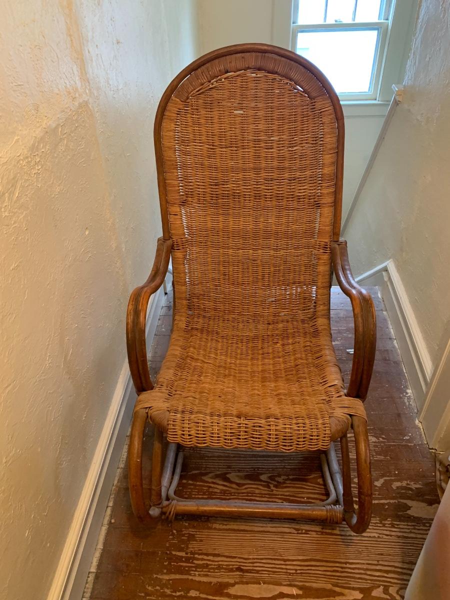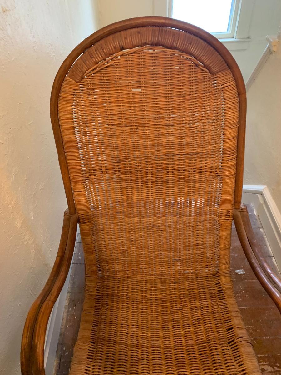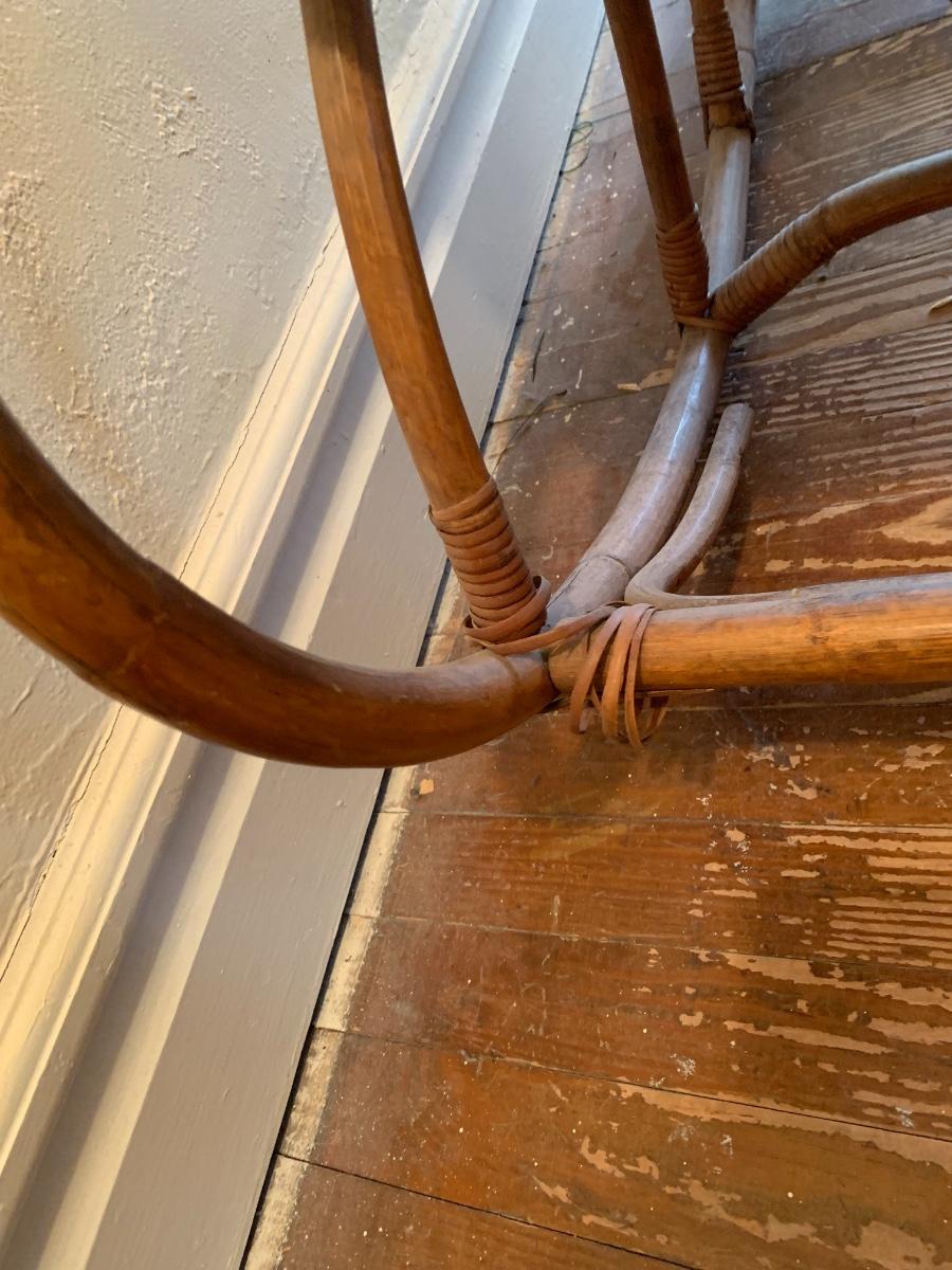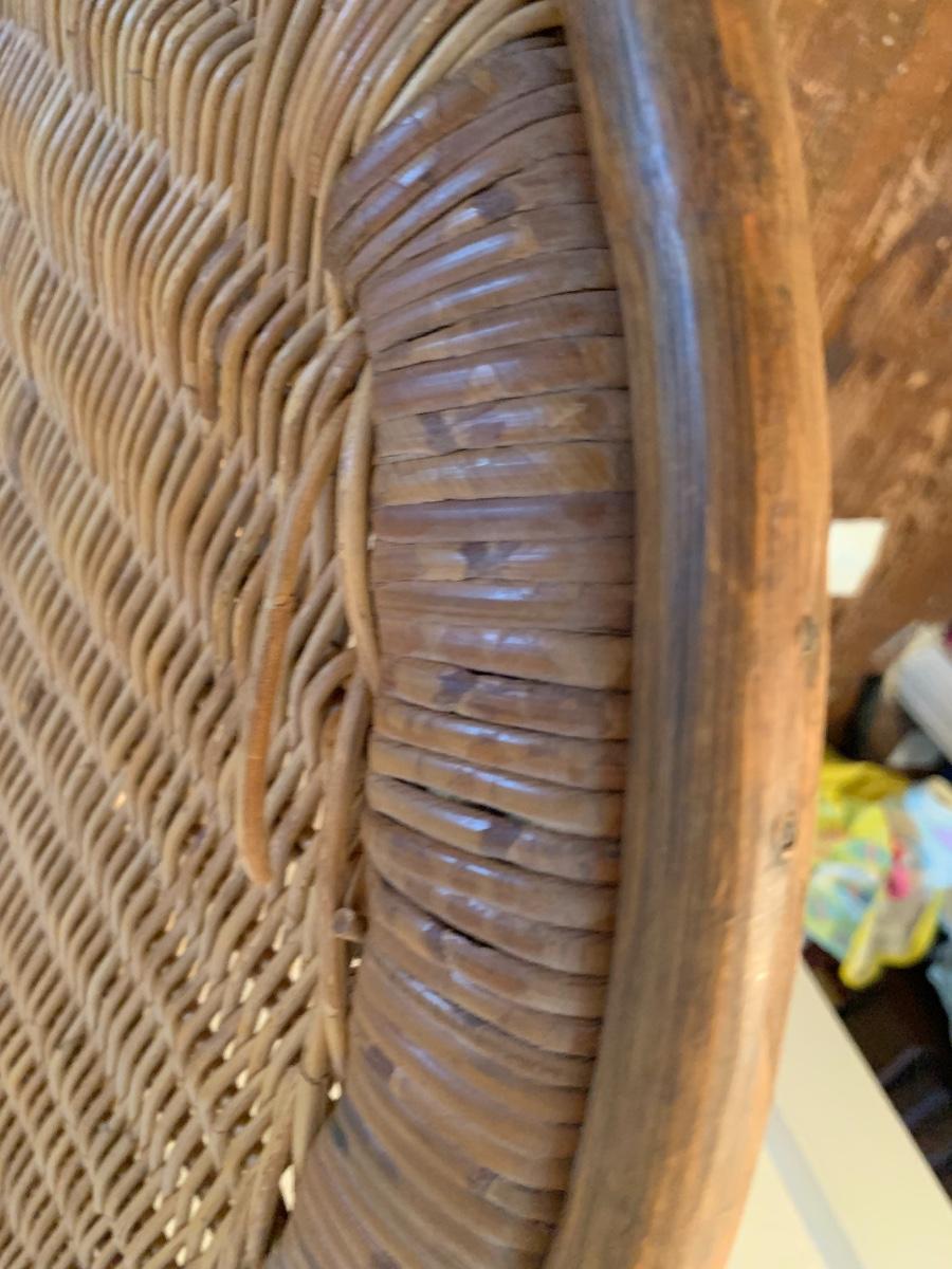 This piece is in good vintage condition and the frame is extremely solid. The wood and cane show some wear from age/use. Any signs of damage in photos, one loose piece of rattan on top, and some unwinding on one side on 1 rocker