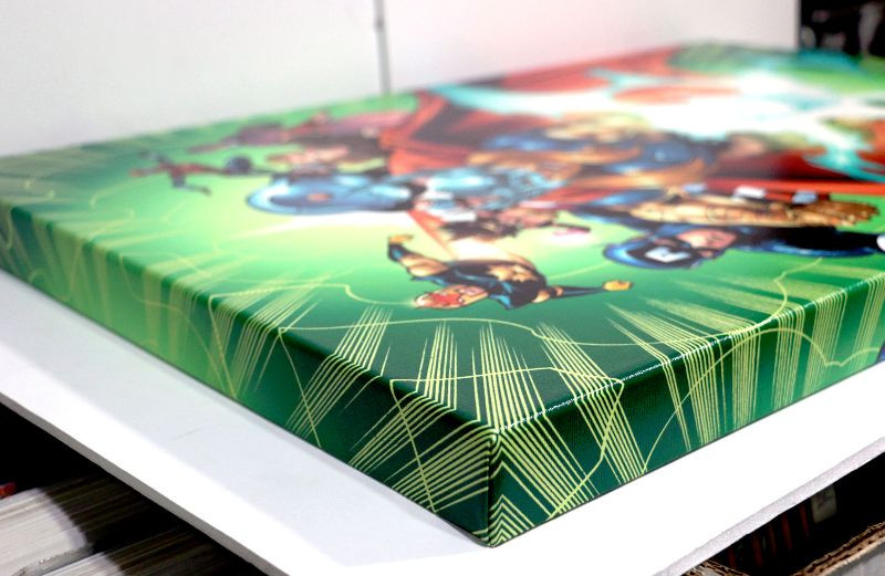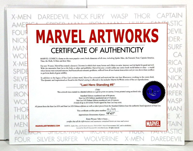 A piece of comic book history, this limited edition of 99 artwork on canvas, from original art by Patrick Olliffe, depicts the classic characters: Thor, Captain America and Spider woman among many others. "Last Hero Standing #5" is an extremely limited edition giclee on canvas by Patrick Olliffe presented by Marvel Artworks and numbered #91/99! This piece comes stretched on frame and ready to hang. Includes Certificate of Authenticity! Measures approx. 18" x 27". Mine - New condition!