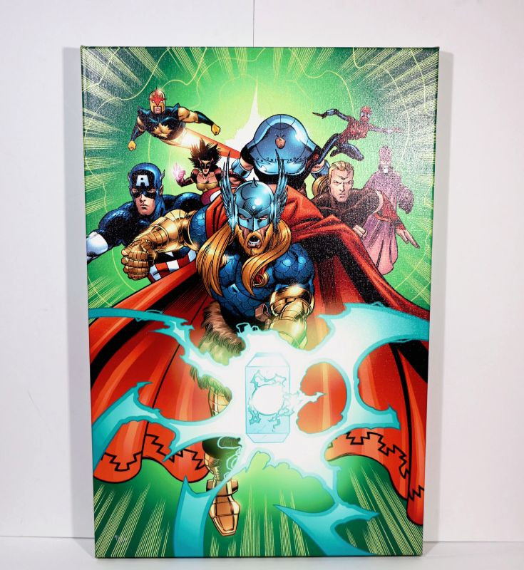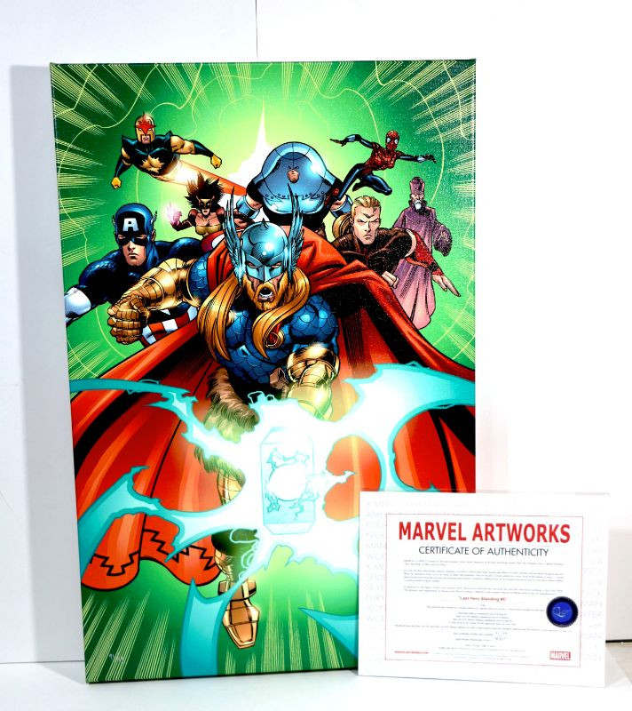 A piece of comic book history, this limited edition of 99 artwork on canvas, from original art by Patrick Olliffe, depicts the classic characters: Thor, Captain America and Spider woman among many others. "Last Hero Standing #5" is an extremely limited edition giclee on canvas by Patrick Olliffe presented by Marvel Artworks and numbered #91/99! This piece comes stretched on frame and ready to hang. Includes Certificate of Authenticity! Measures approx. 18" x 27". Mine - New condition!