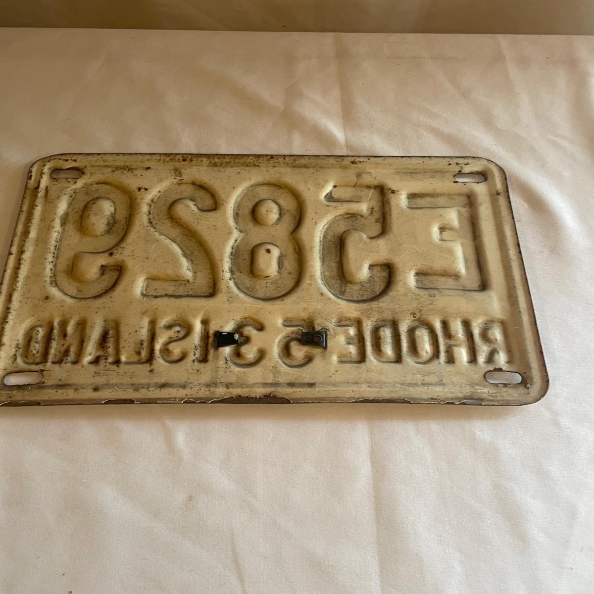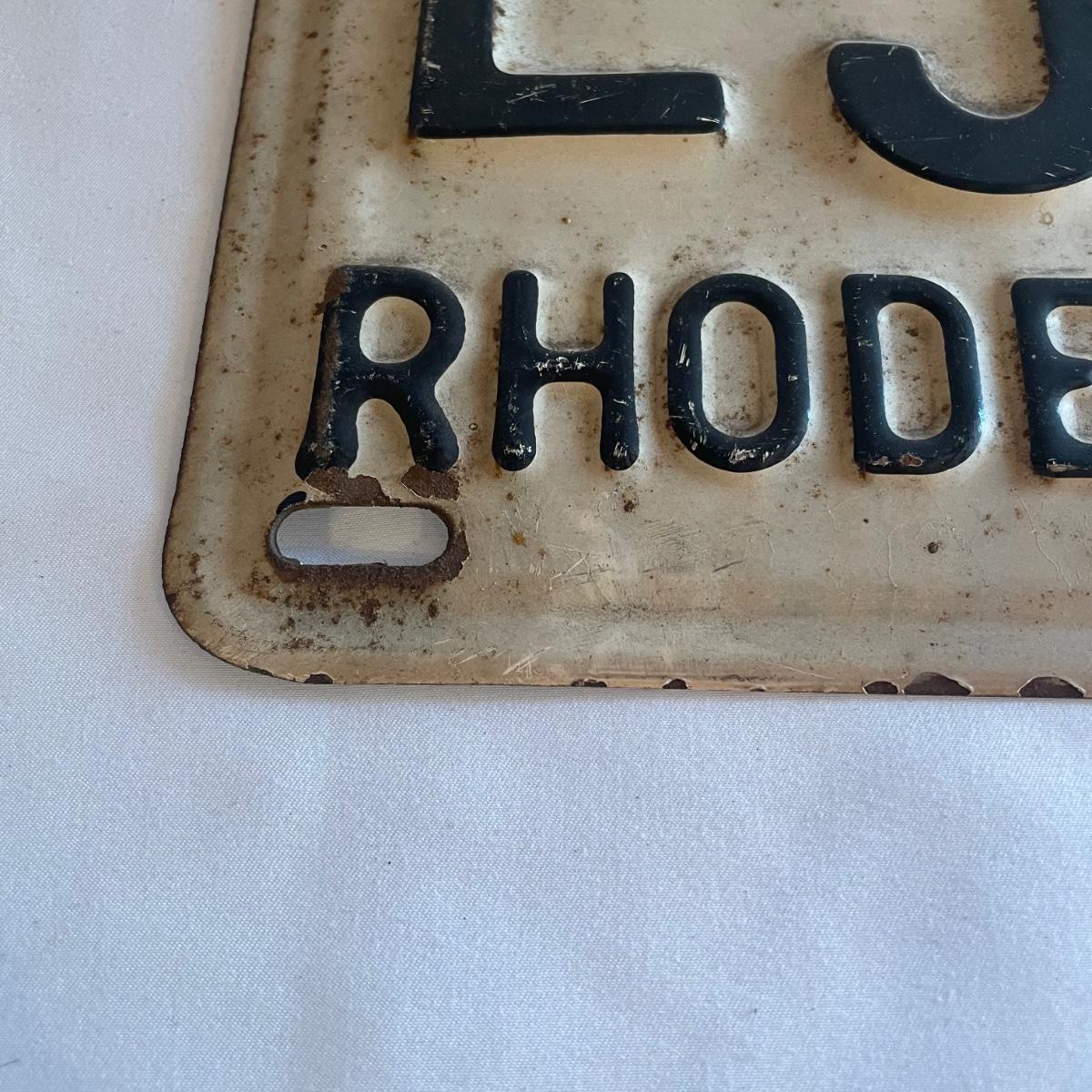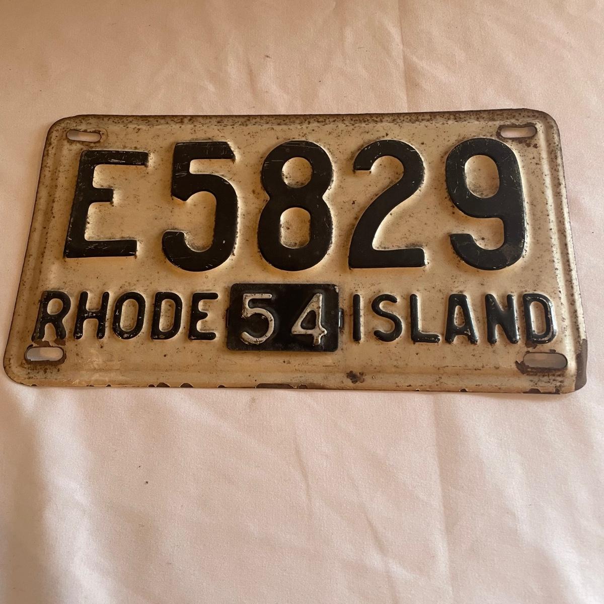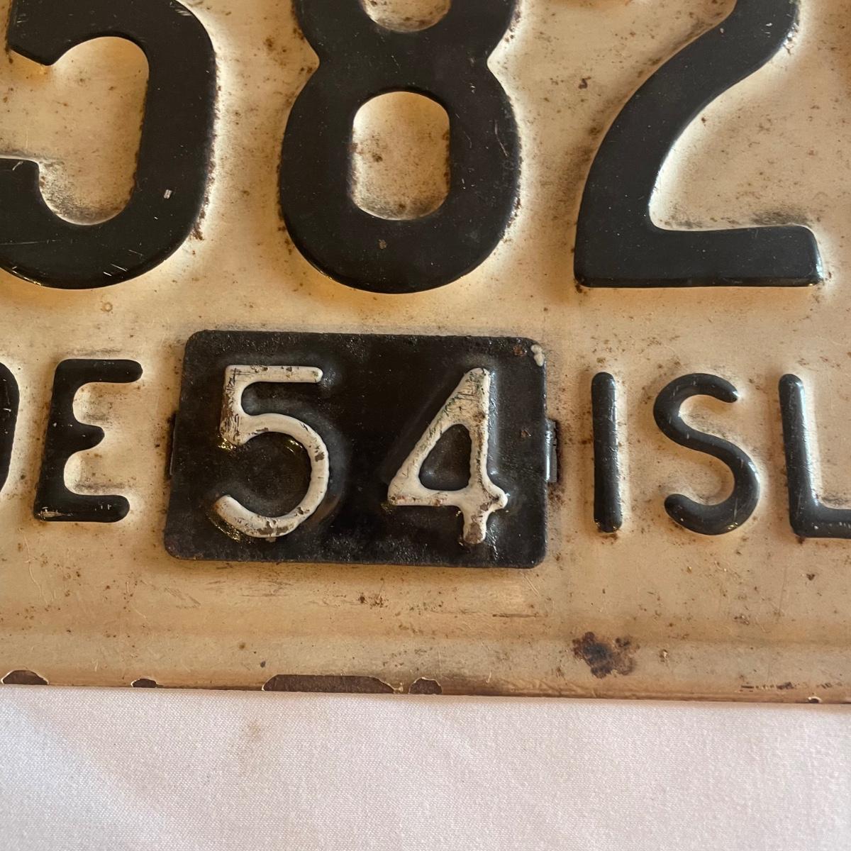 This 1954 metal license plate from Rhode Island is in good condition and measures 6” x 11”. The "54" is slightly raised on the plate.