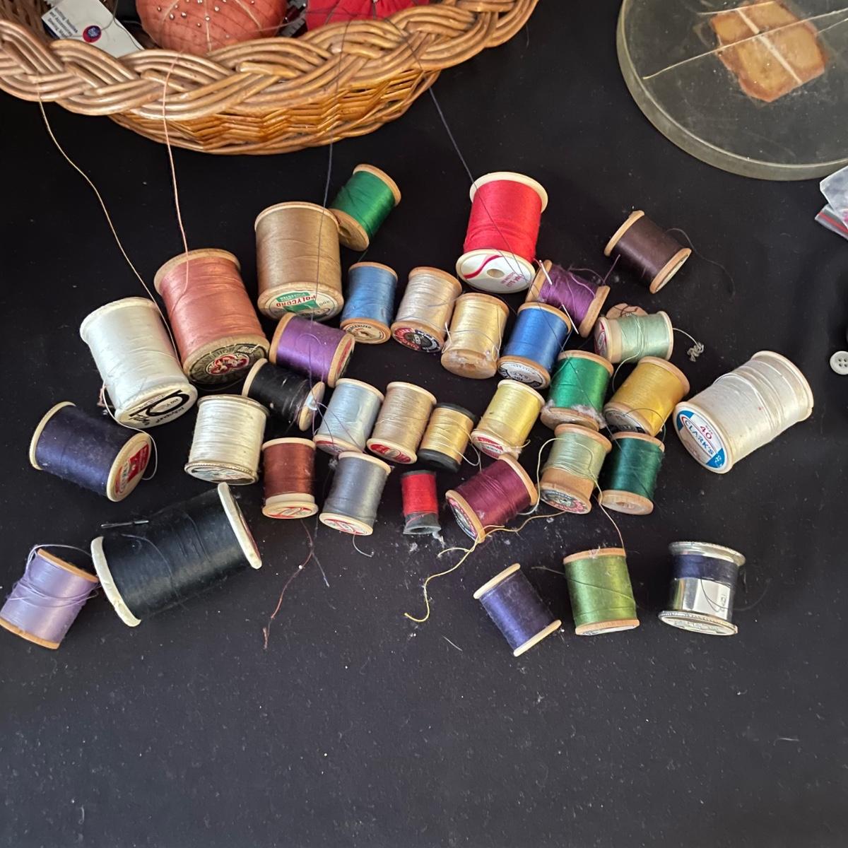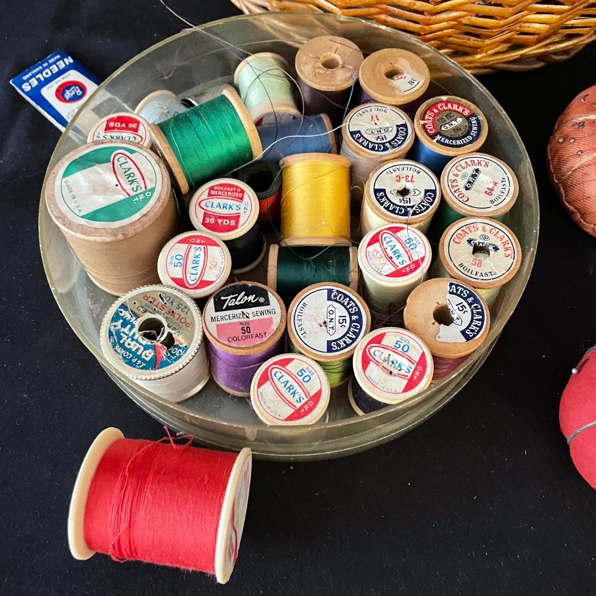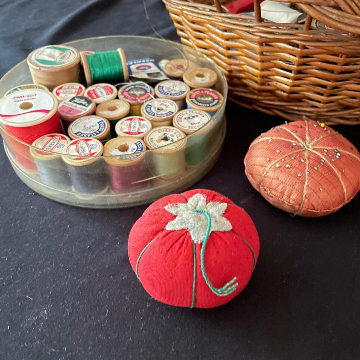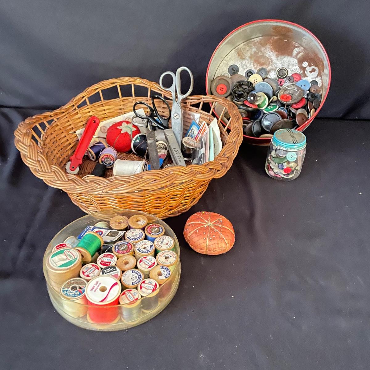 Small sewing lot with lots of thread spools and buttons, snaps, scissors and two pin cushions. See images. Basket and tin included. Shipping available.