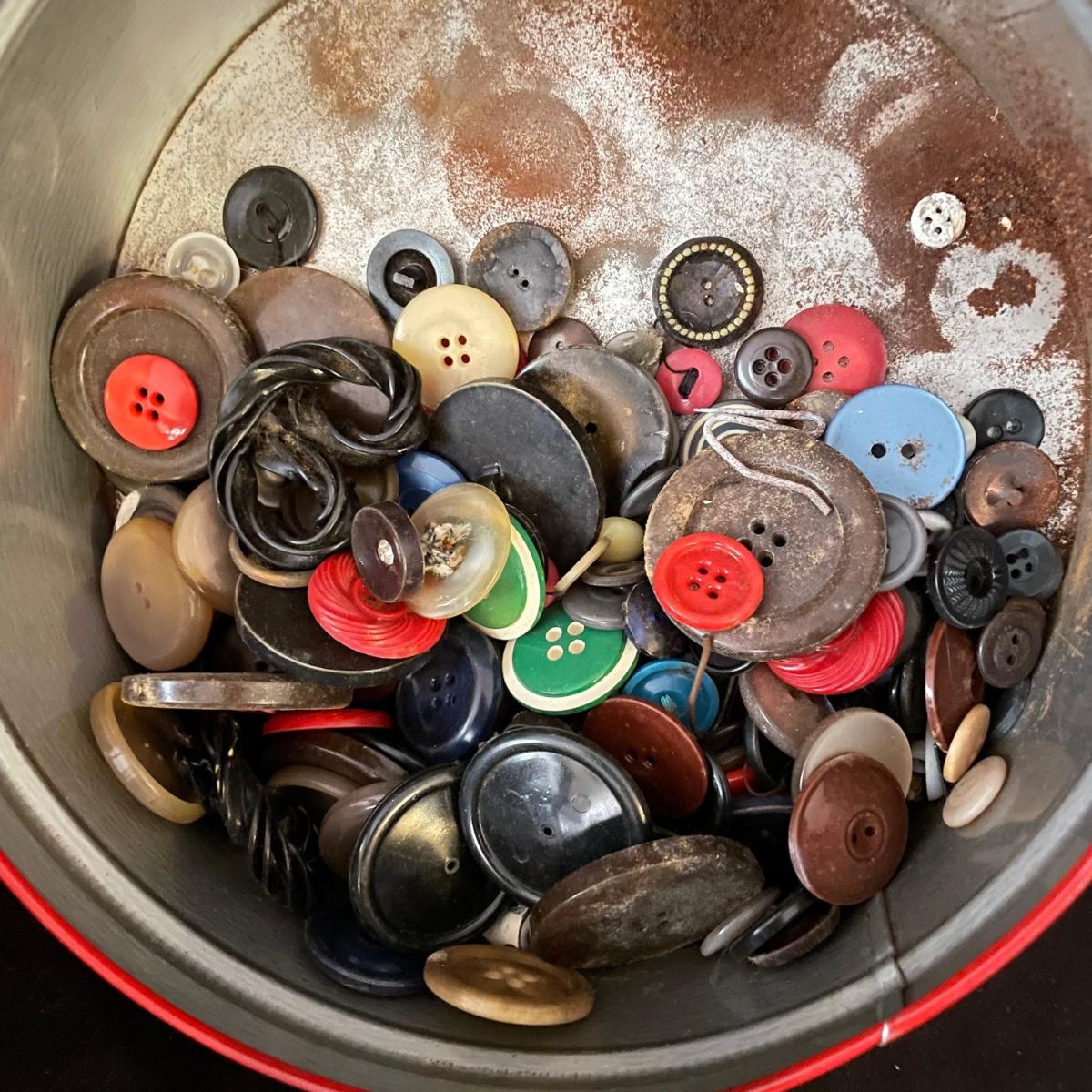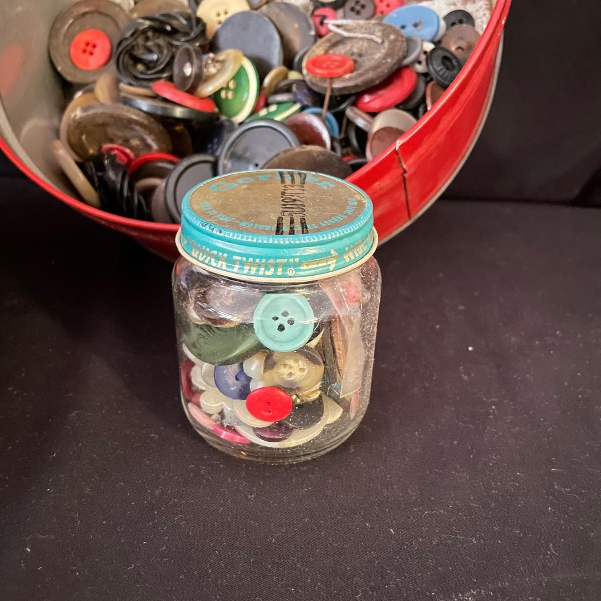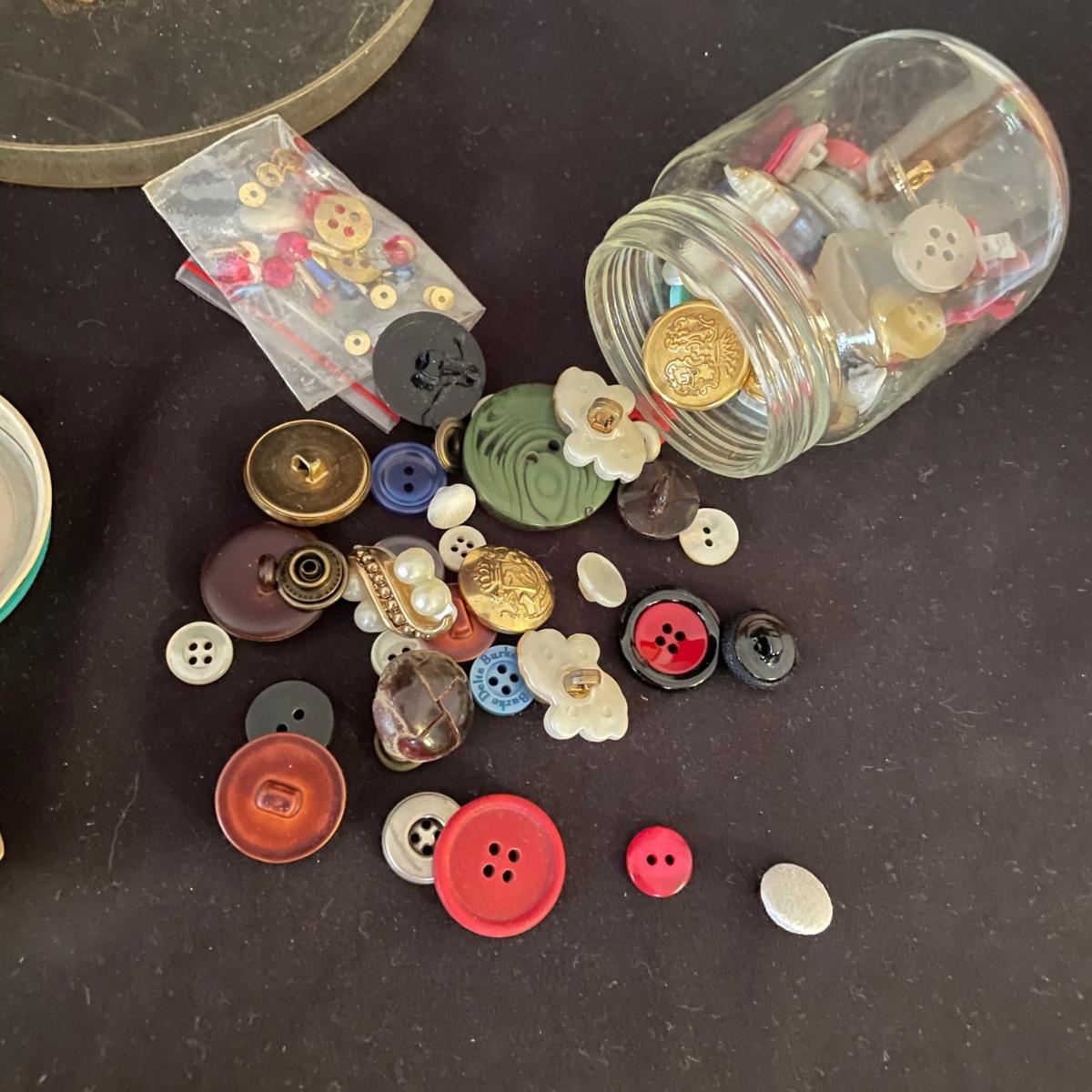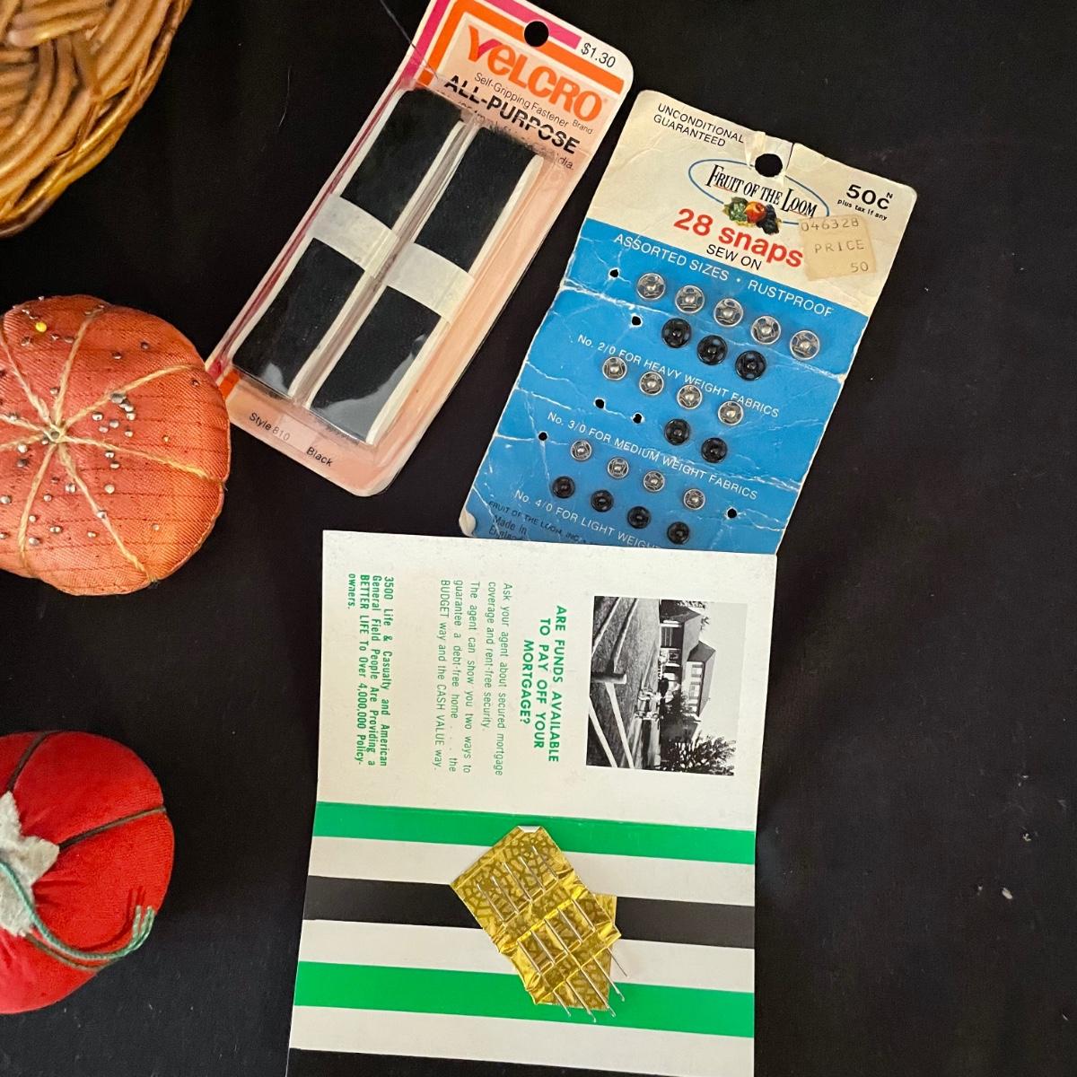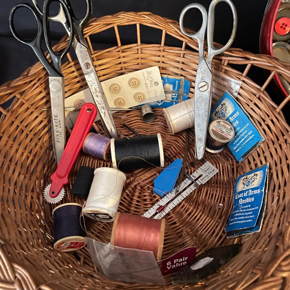 Small sewing lot with lots of thread spools and buttons, snaps, scissors and two pin cushions. See images. Basket and tin included. Shipping available.