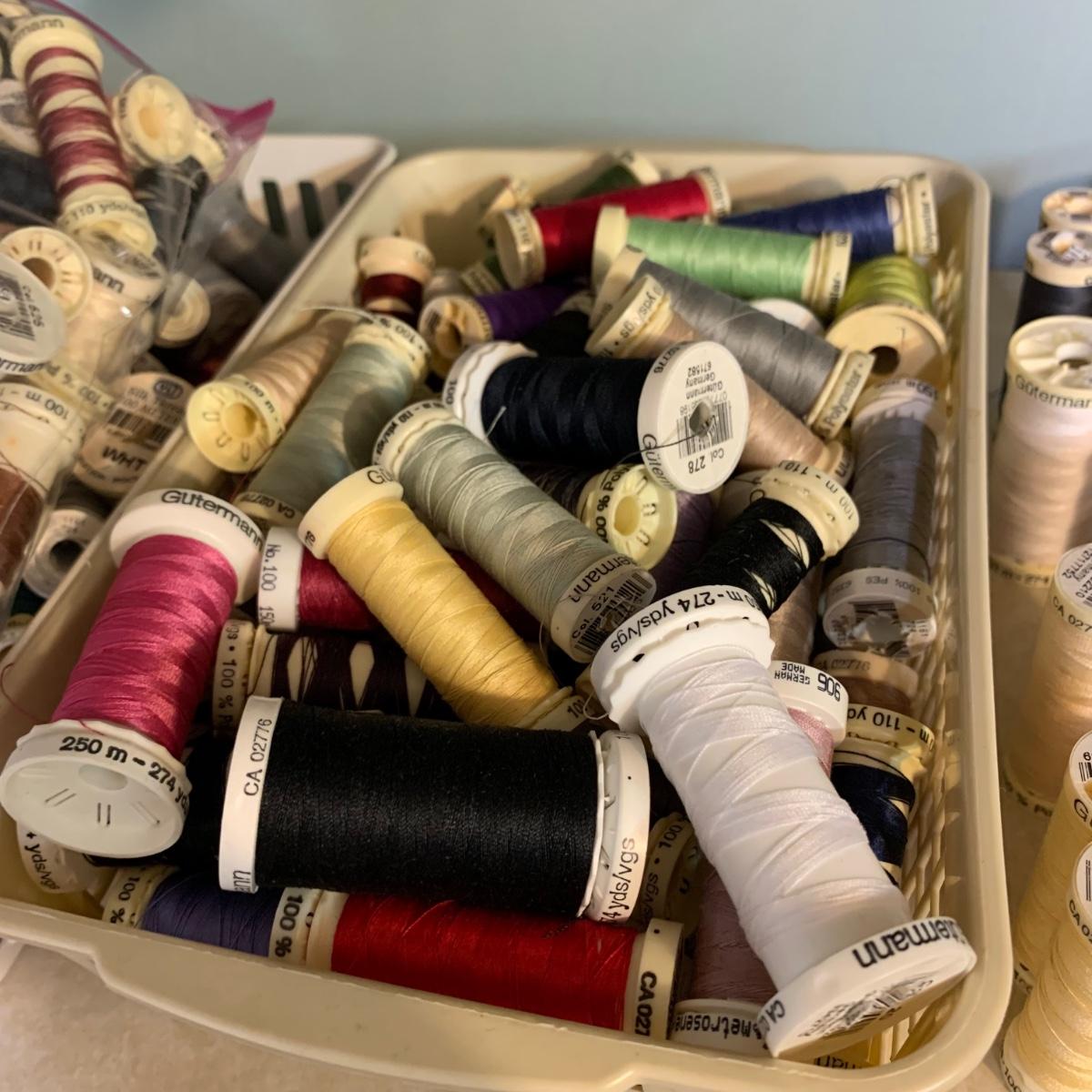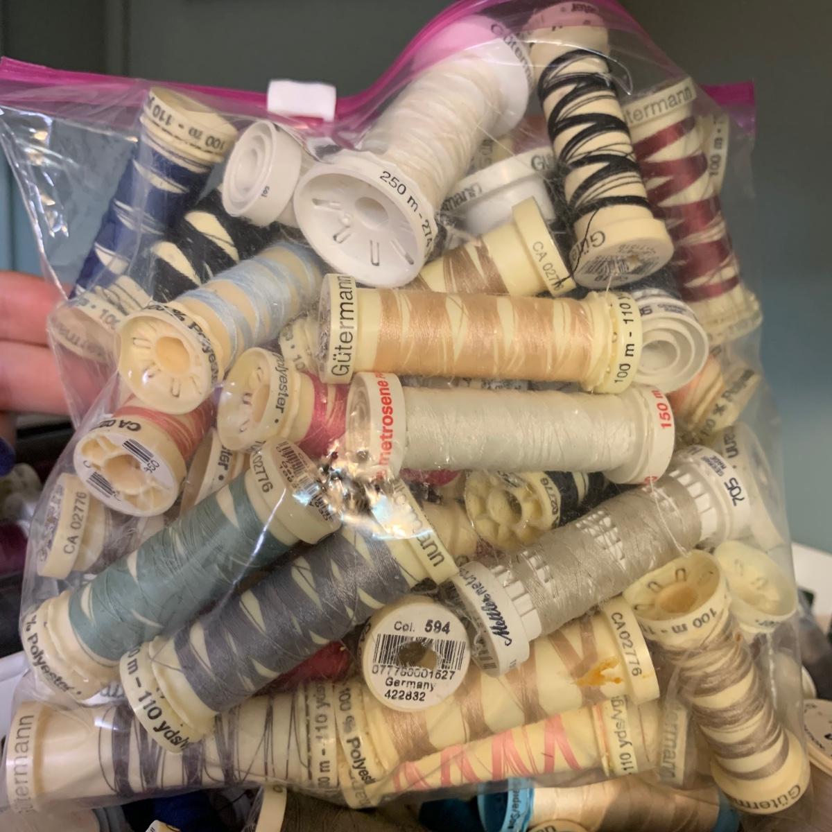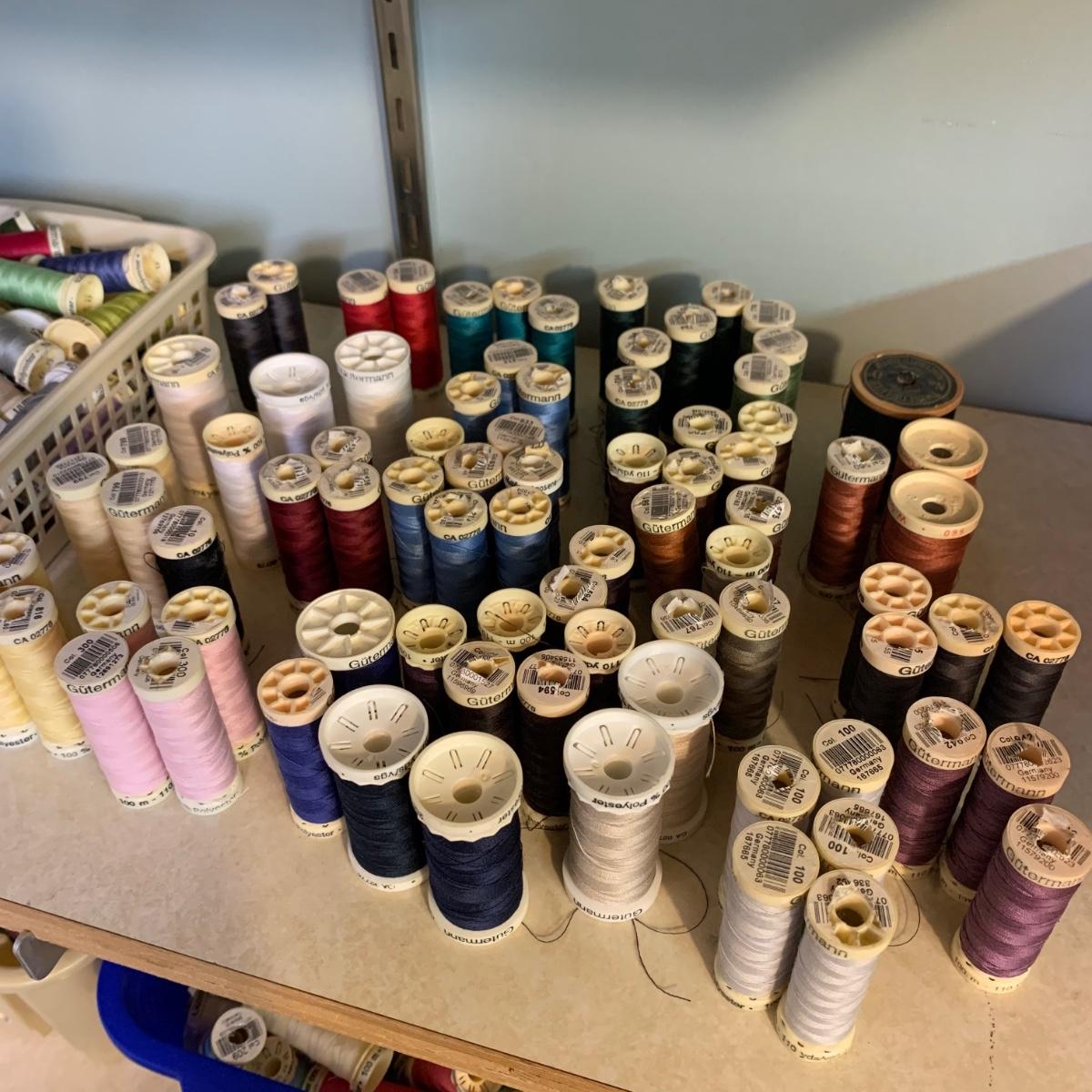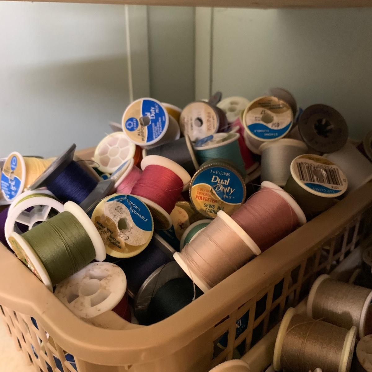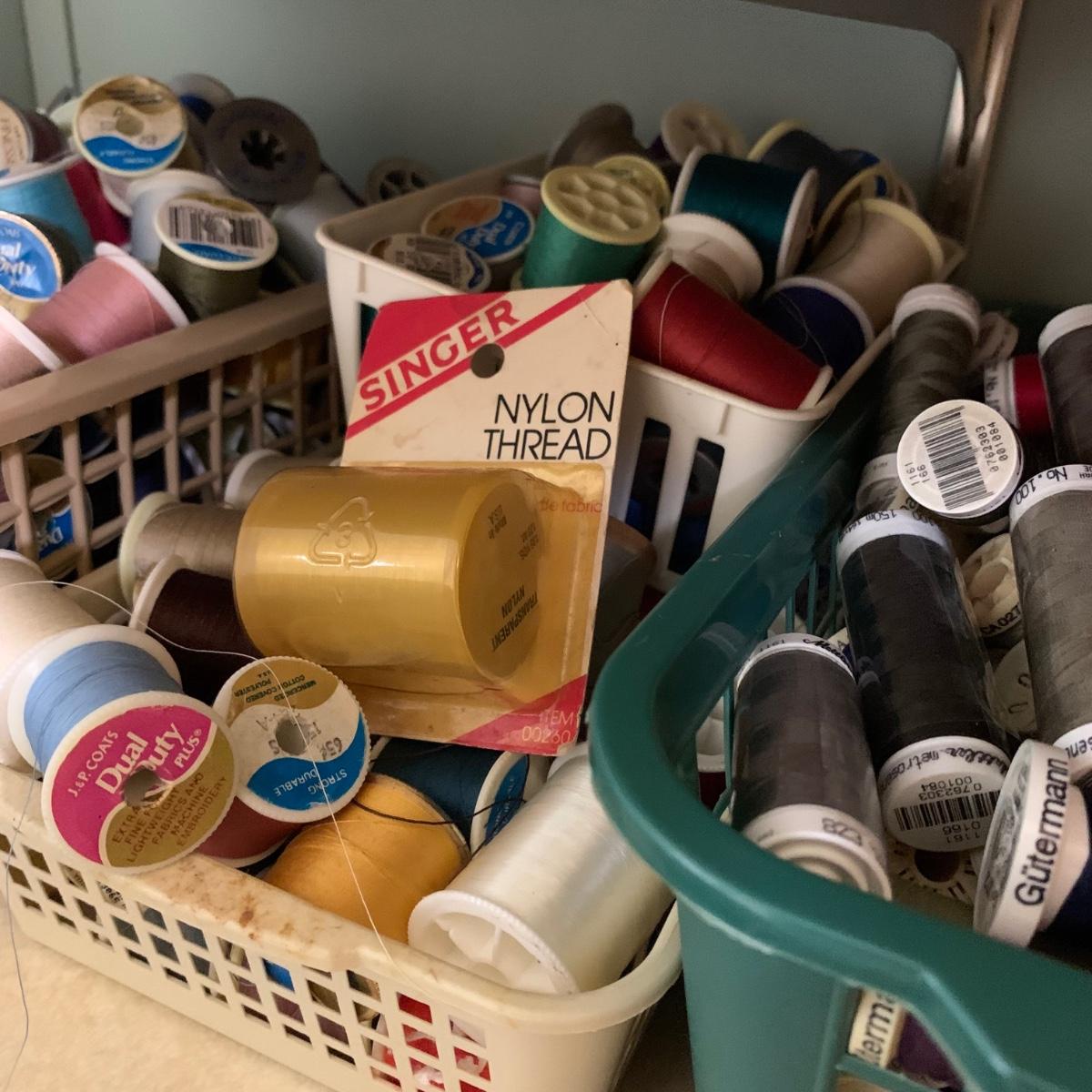All the colors of thread you can imagine! Most threads are polyester or nylon, some cotton. Brands of thread include Gütermann, Mettler, Coats & Clark, and more. There are hundreds of spools included. Many are brand new, some are just slightly used, and some are a bit thin on the spool. Also included are some metal and plastic bobbins, as well as the plastic bins holding the spools in the photos. Local pickup only.
