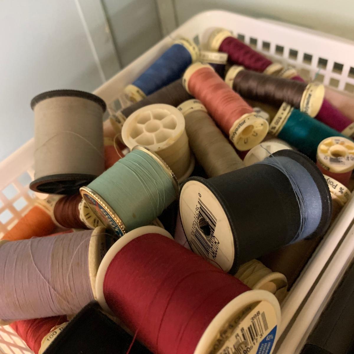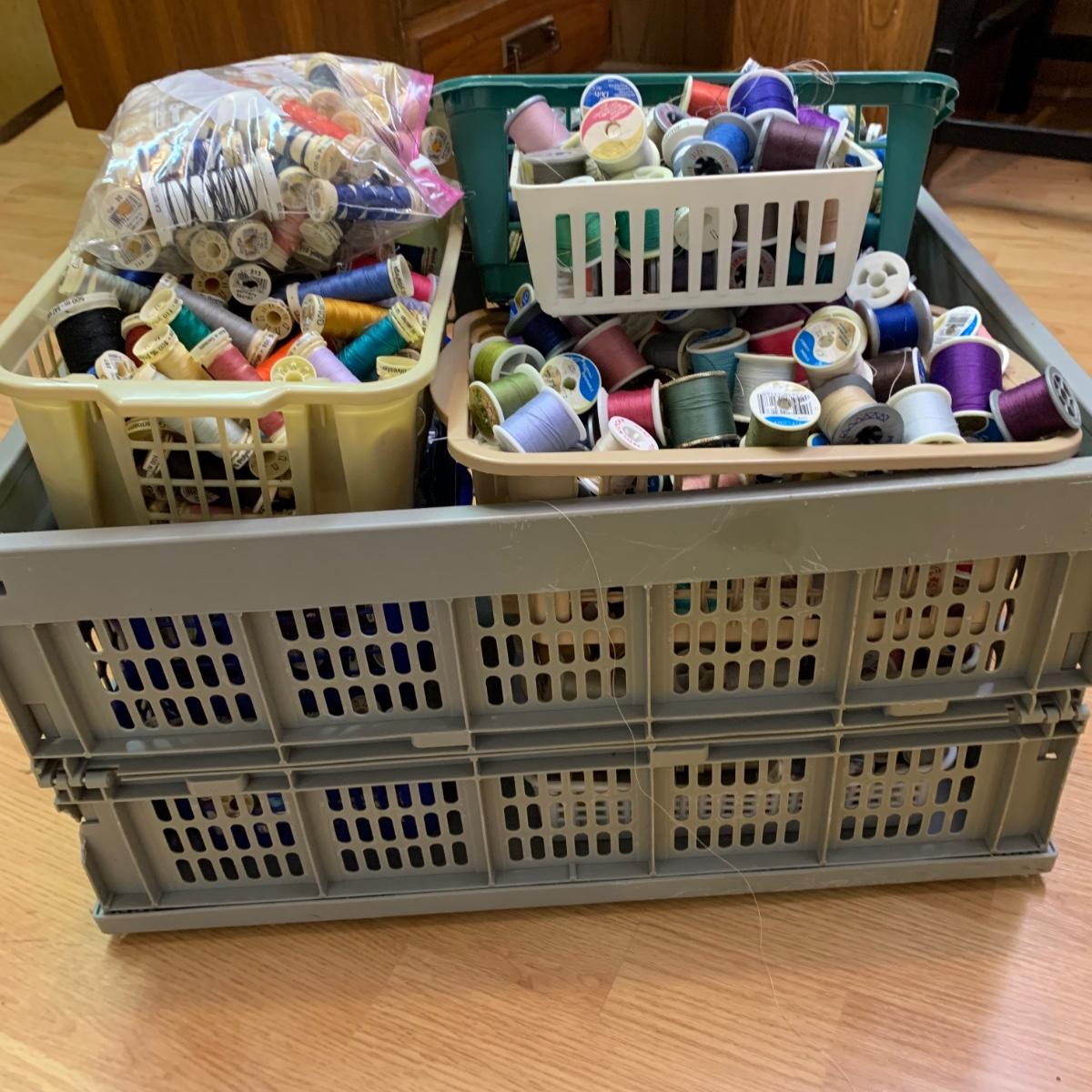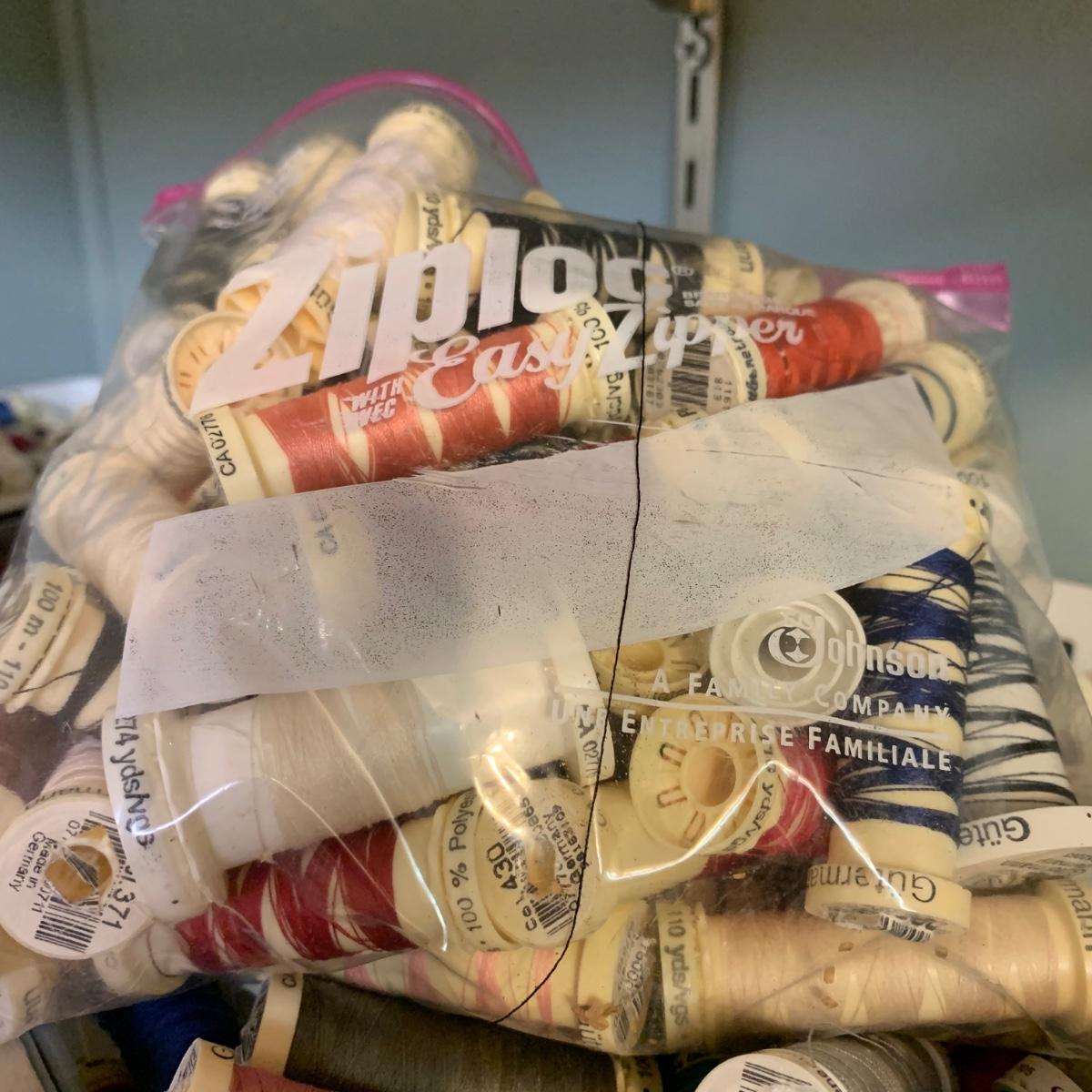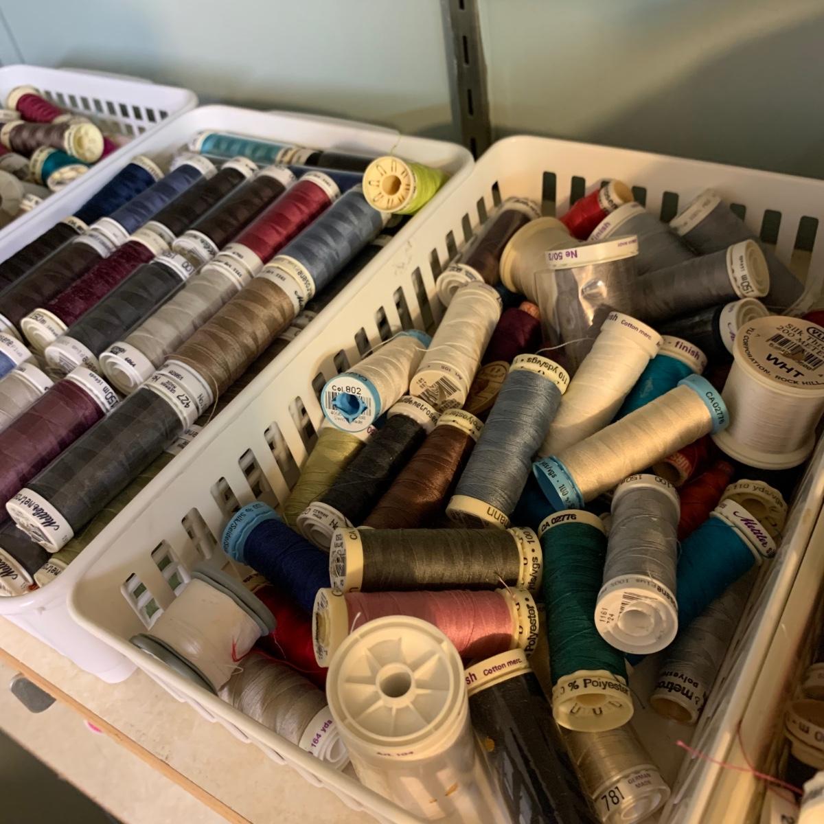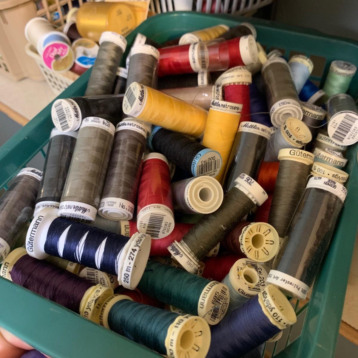 All the colors of thread you can imagine! Most threads are polyester or nylon, some cotton. Brands of thread include Gütermann, Mettler, Coats & Clark, and more. There are hundreds of spools included. Many are brand new, some are just slightly used, and some are a bit thin on the spool. Also included are some metal and plastic bobbins, as well as the plastic bins holding the spools in the photos. Local pickup only.
