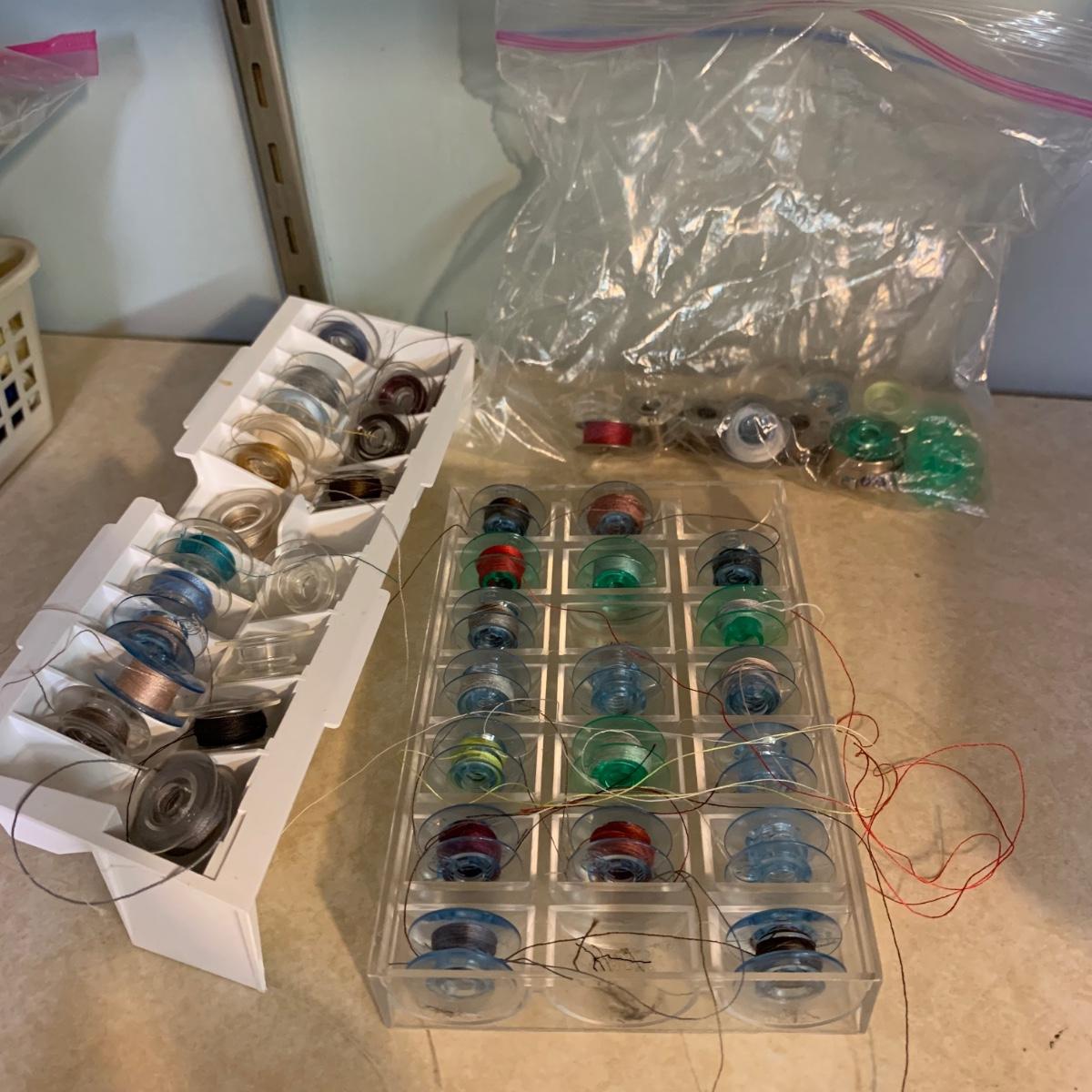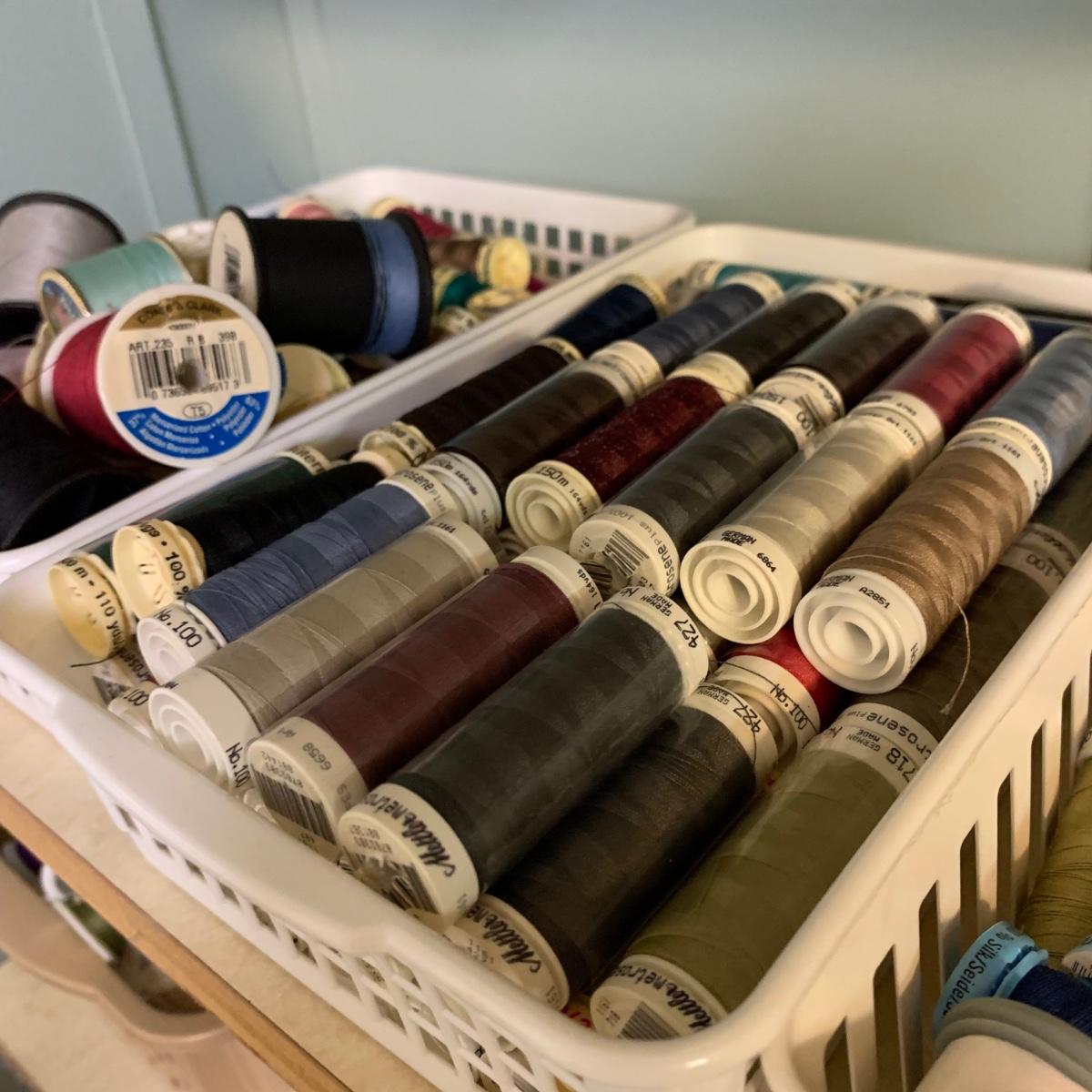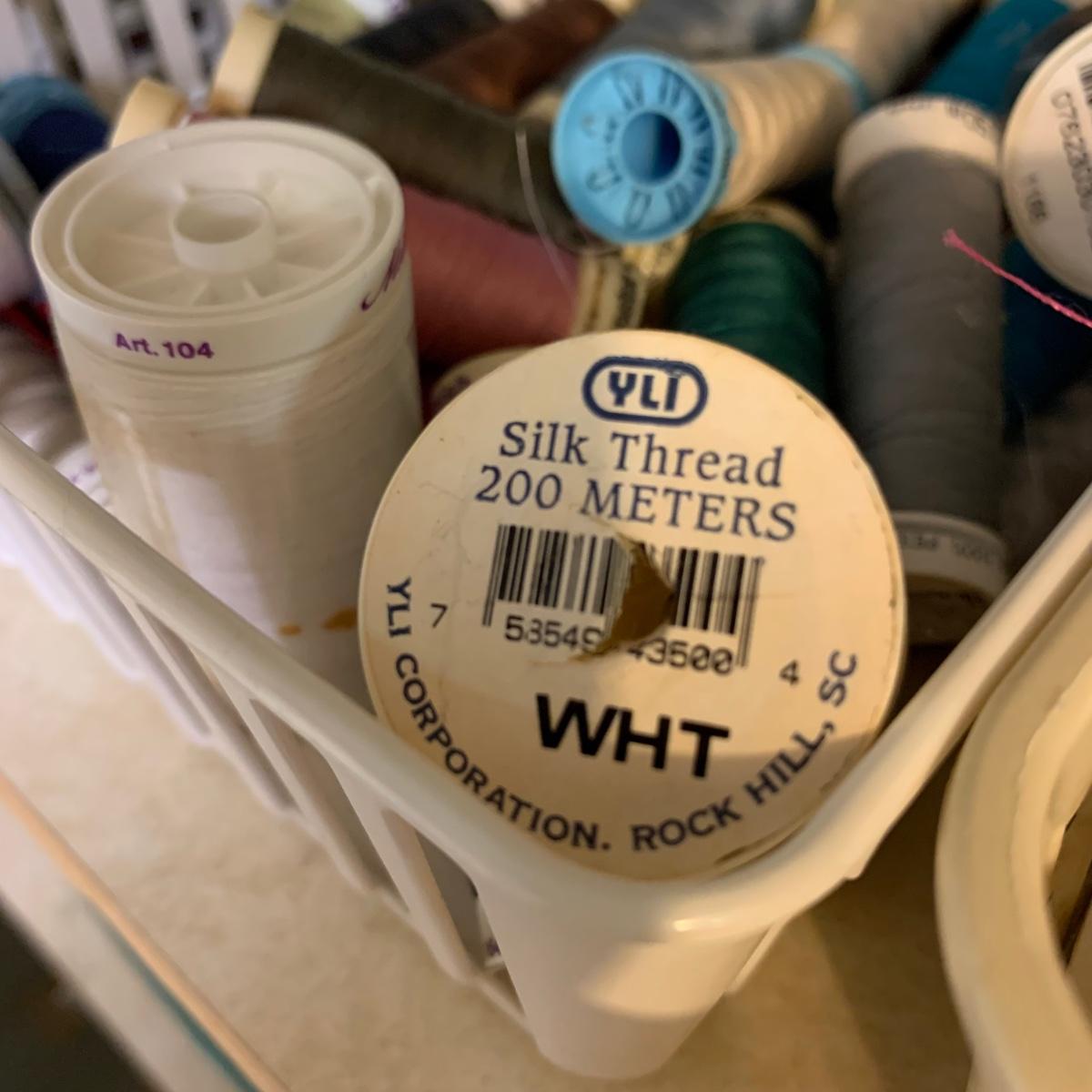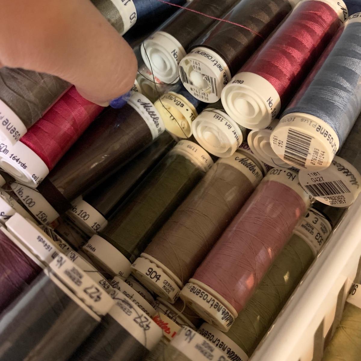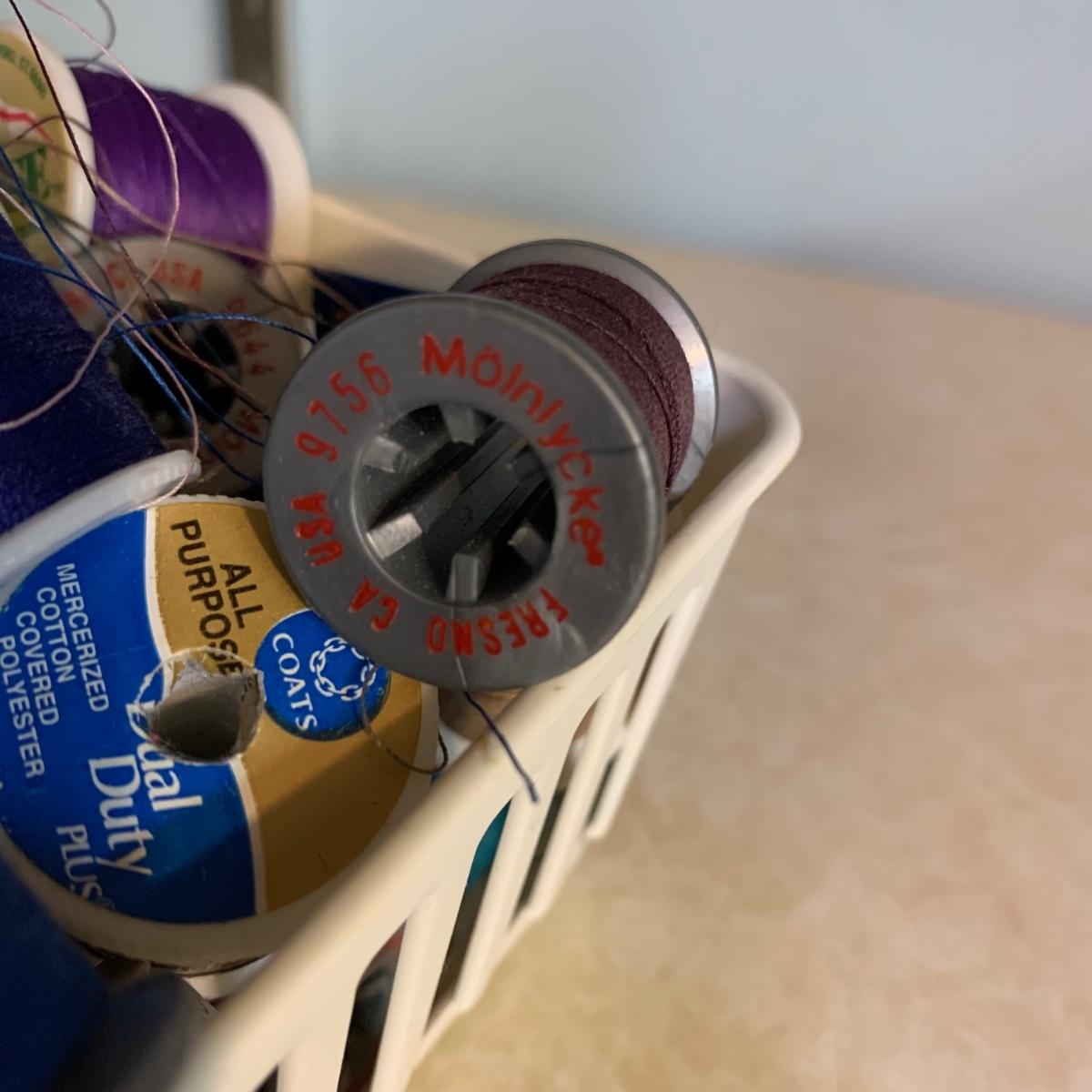 All the colors of thread you can imagine! Most threads are polyester or nylon, some cotton. Brands of thread include Gütermann, Mettler, Coats & Clark, and more. There are hundreds of spools included. Many are brand new, some are just slightly used, and some are a bit thin on the spool. Also included are some metal and plastic bobbins, as well as the plastic bins holding the spools in the photos. Local pickup only.