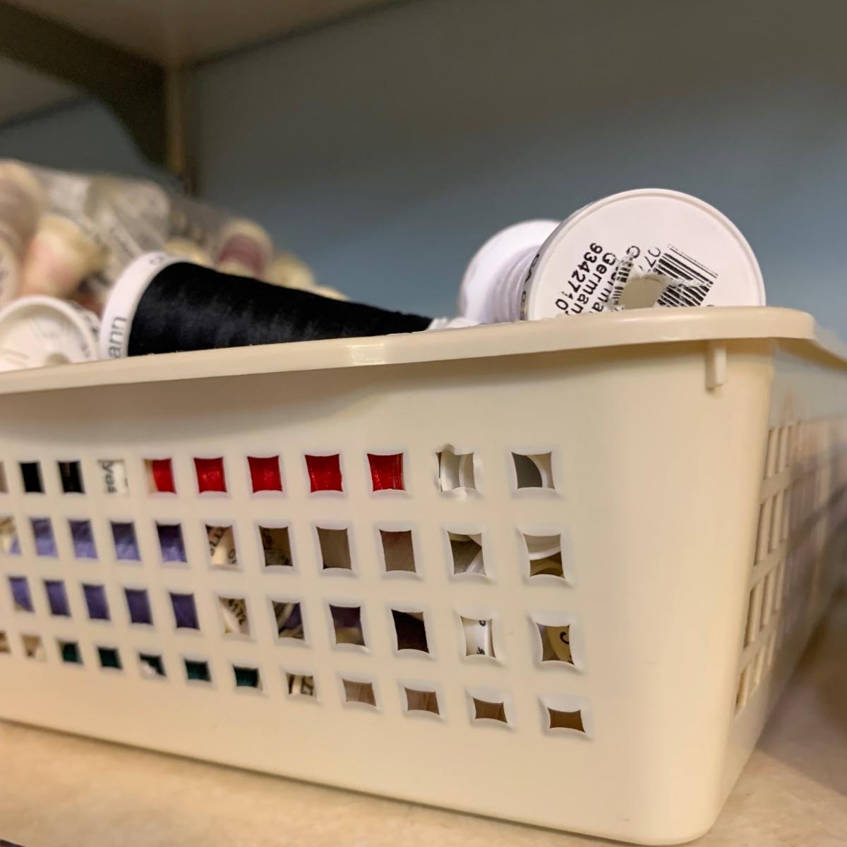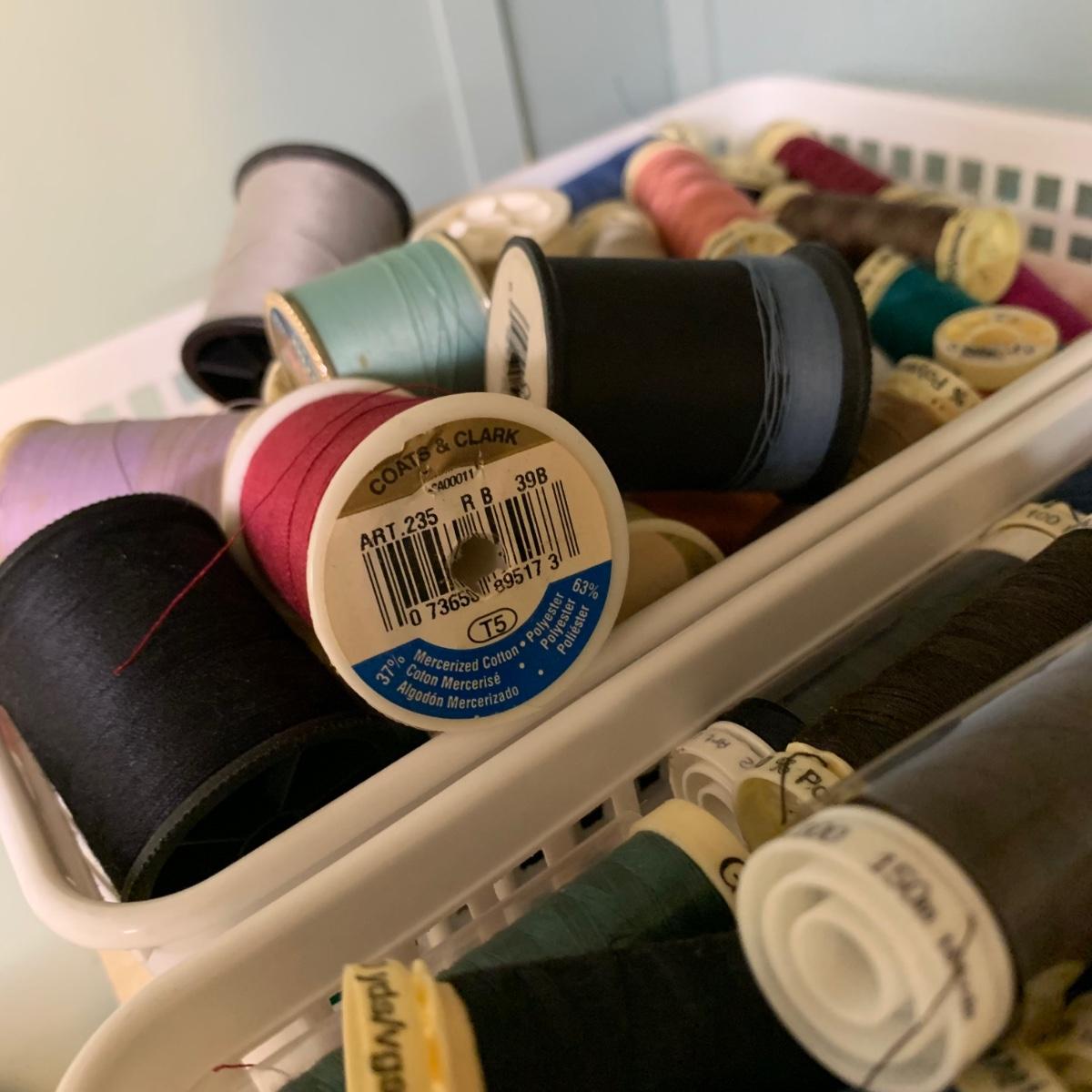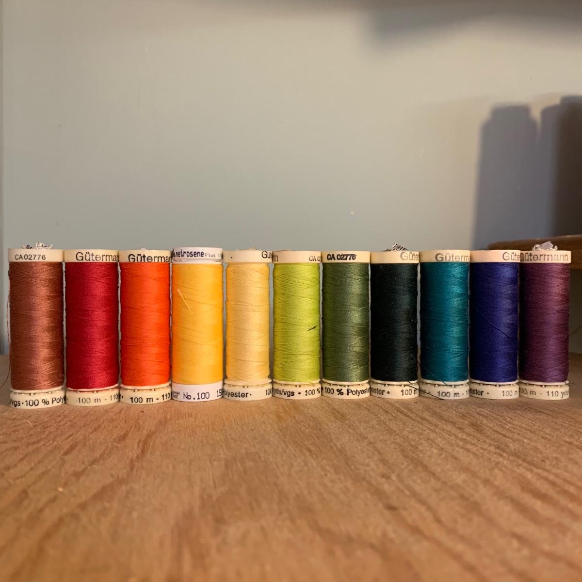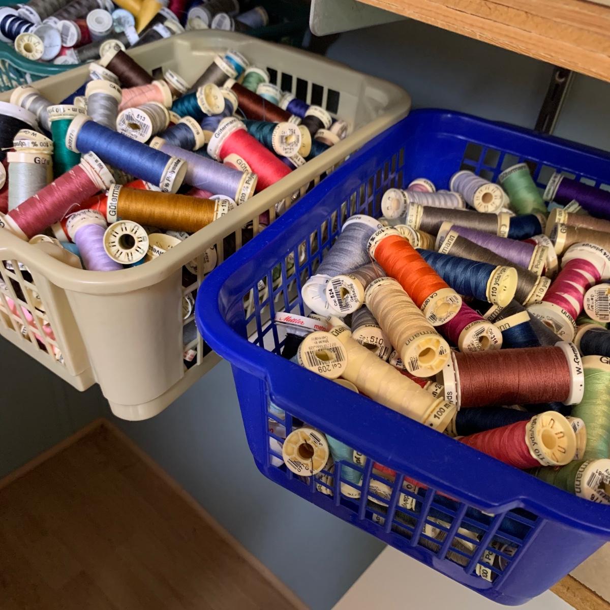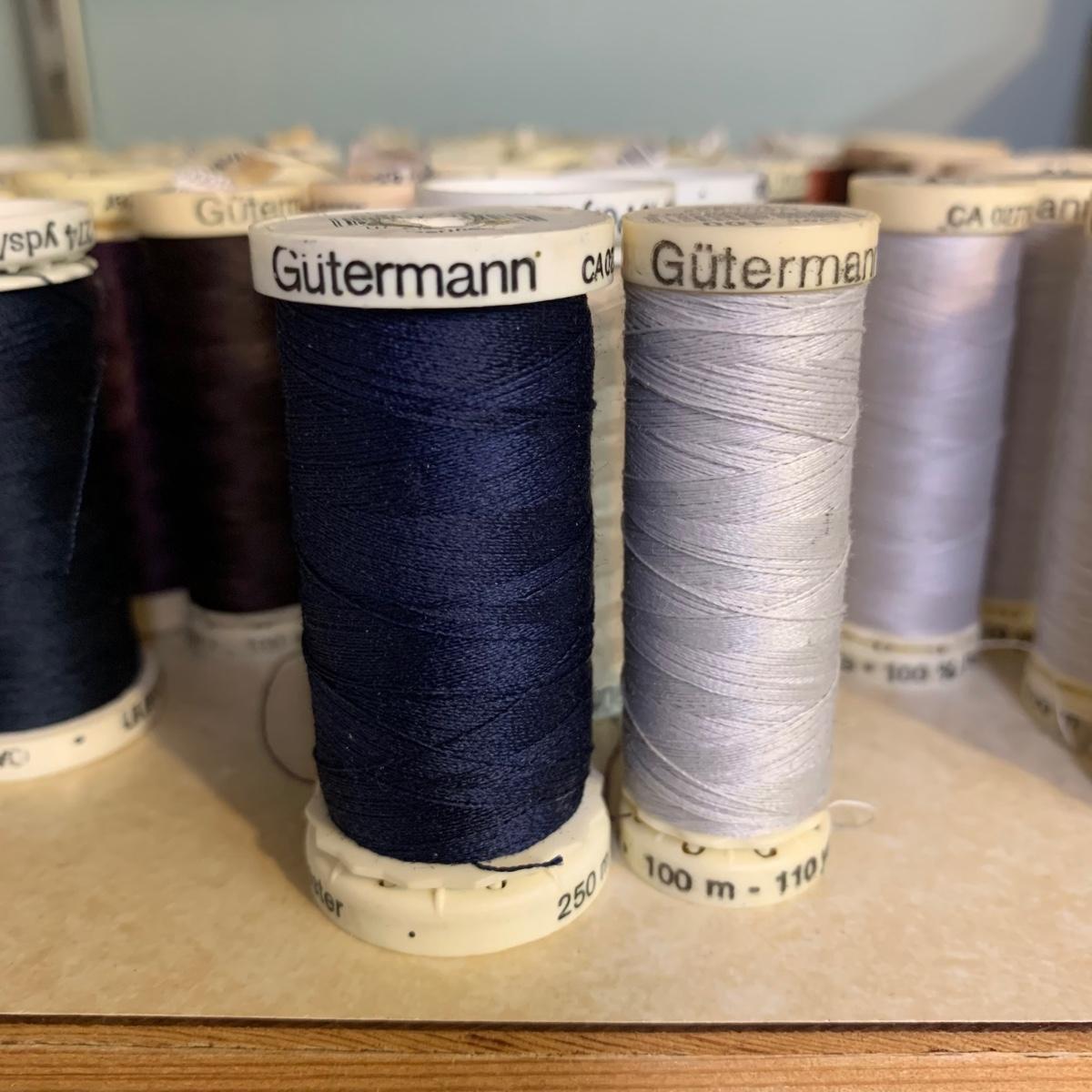 All the colors of thread you can imagine! Most threads are polyester or nylon, some cotton. Brands of thread include Gütermann, Mettler, Coats & Clark, and more. There are hundreds of spools included. Many are brand new, some are just slightly used, and some are a bit thin on the spool. Also included are some metal and plastic bobbins, as well as the plastic bins holding the spools in the photos. Local pickup only.