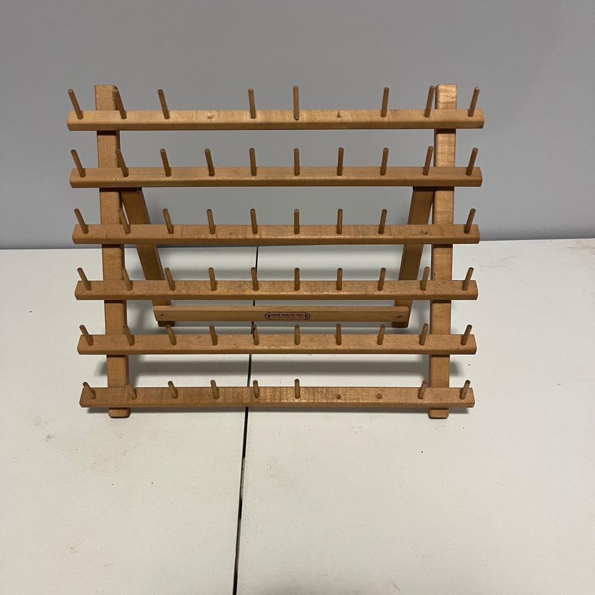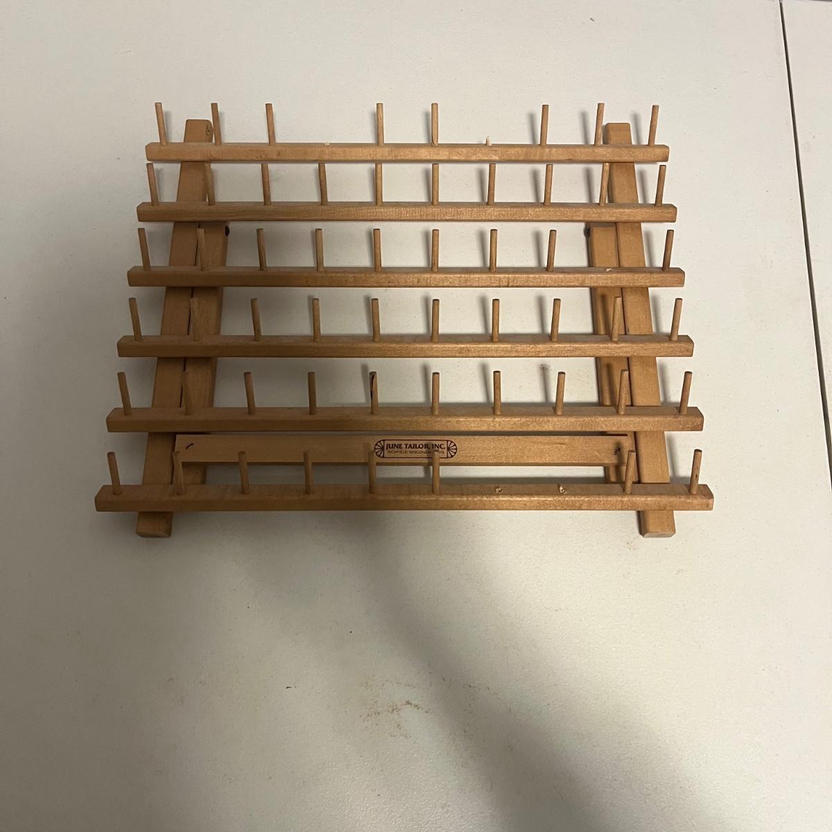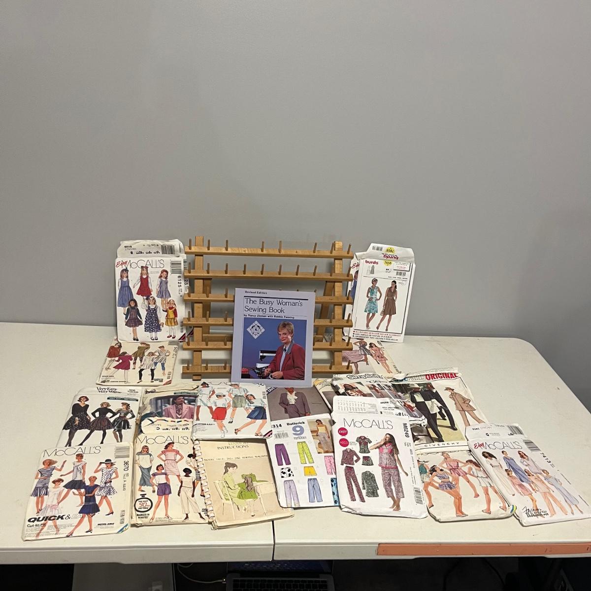 Lot includes over twenty clothing patters and a June Tailor wooden thread holder that measures 16” x 7” x 12”H. Holder has some dowels broken off, see pictures.