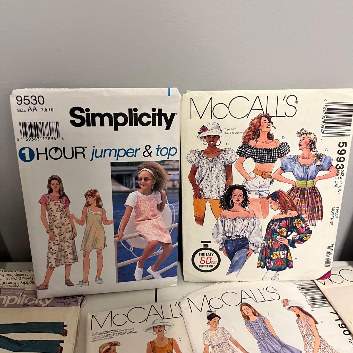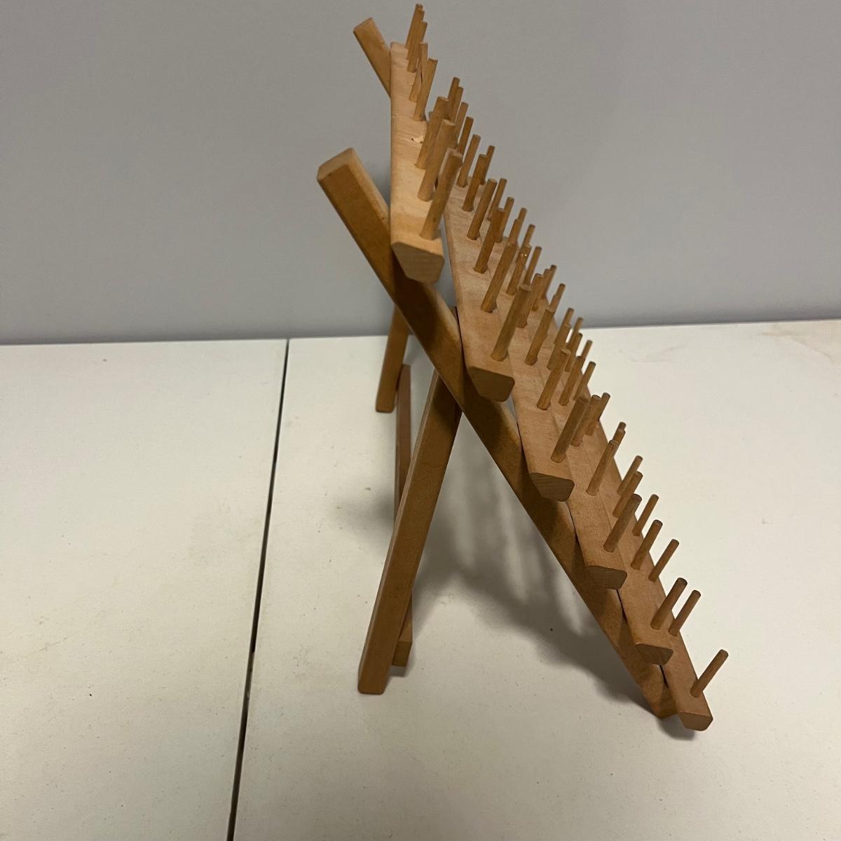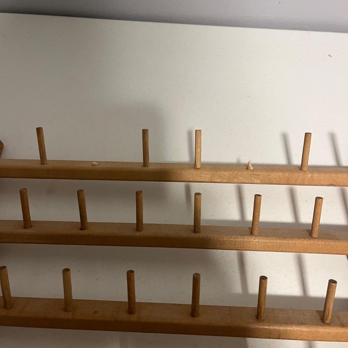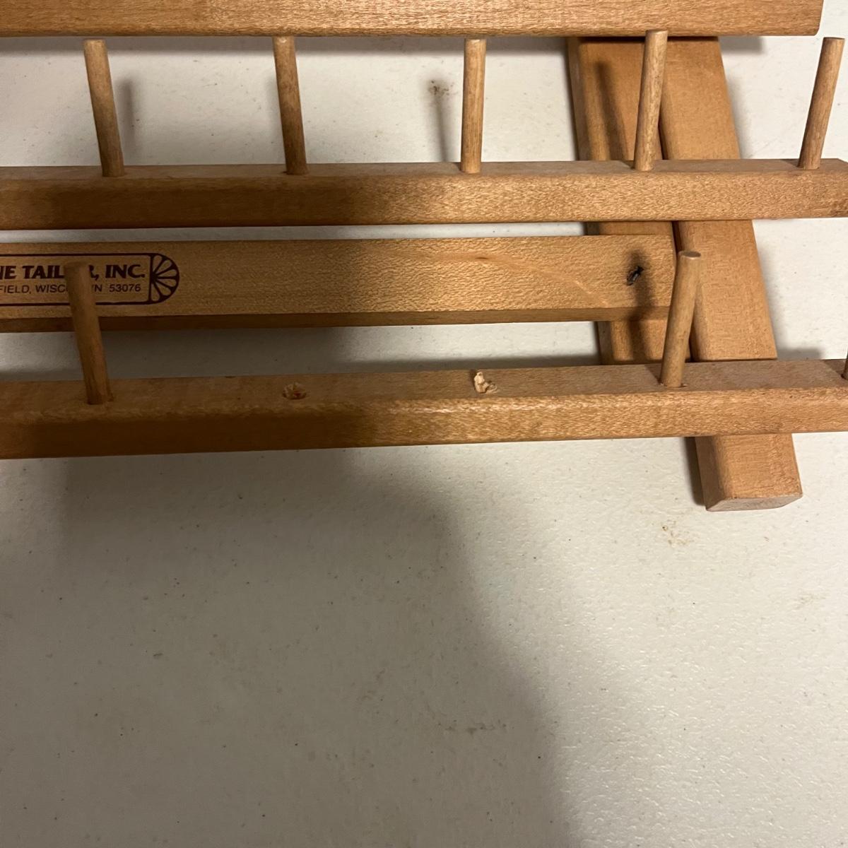 Lot includes over twenty clothing patters and a June Tailor wooden thread holder that measures 16” x 7” x 12”H. Holder has some dowels broken off, see pictures.