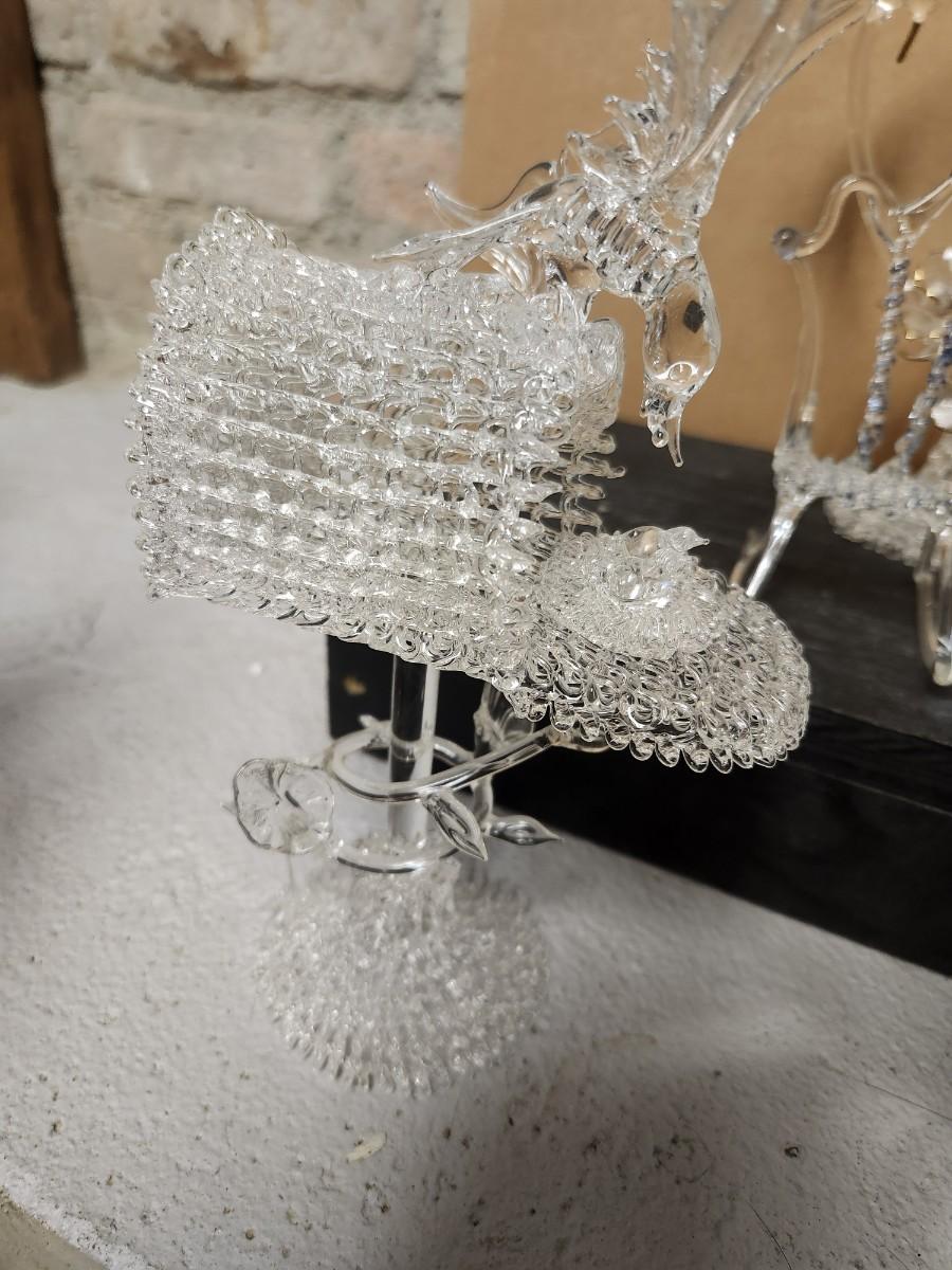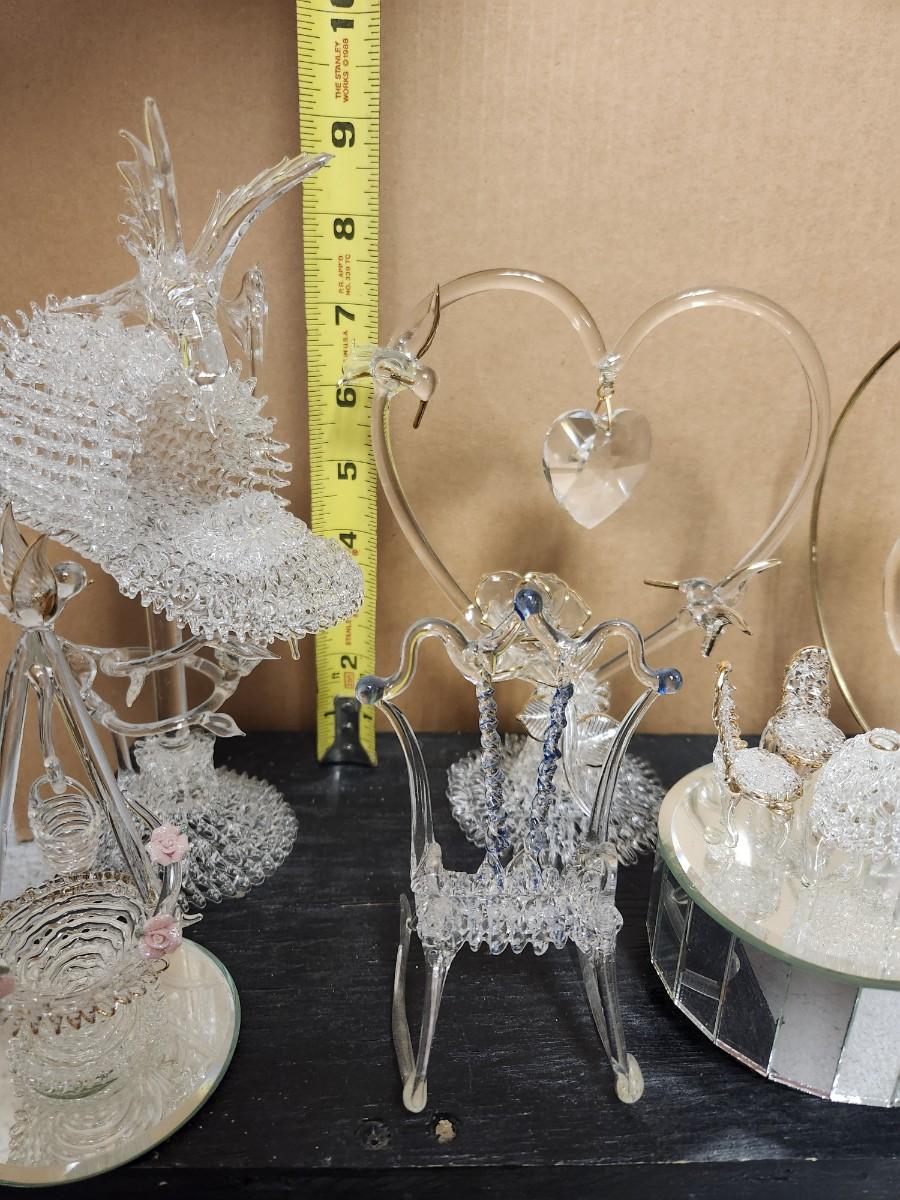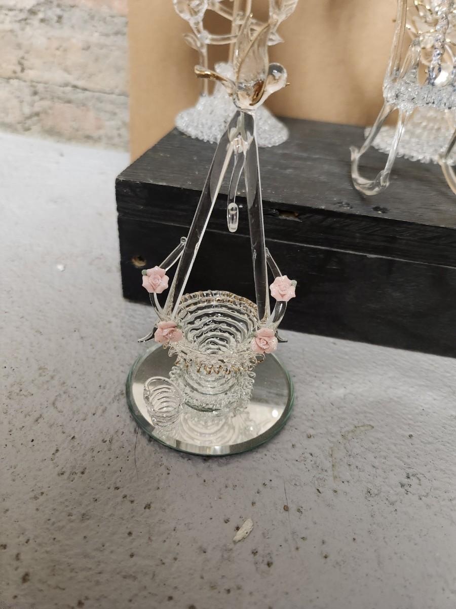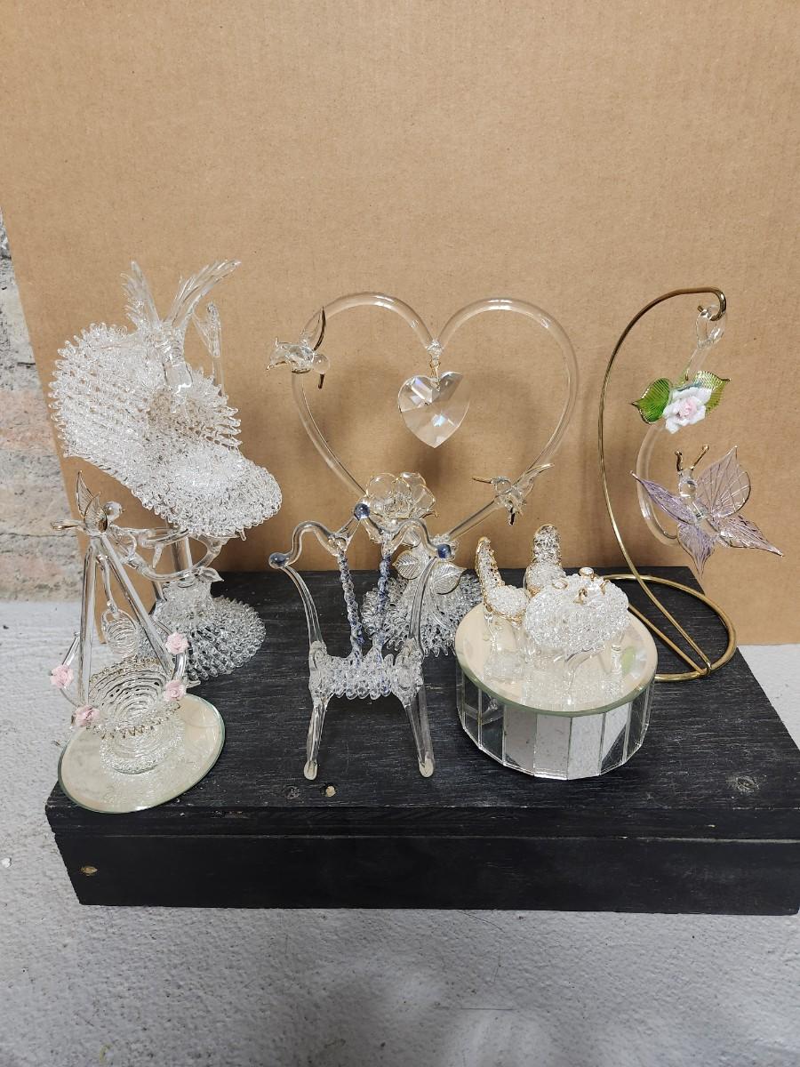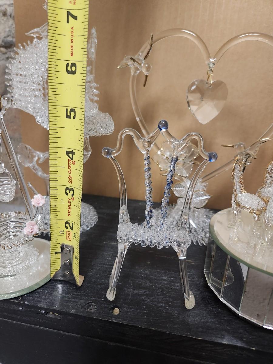 Lot #3 of threaded glass. This on has a hanging butterfly, a mailbox, music box, hanging crystal heart, wishing basket and rocking chair