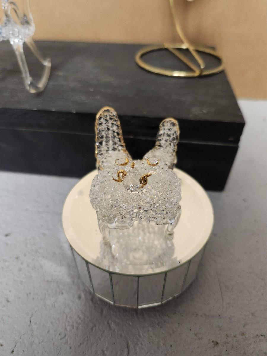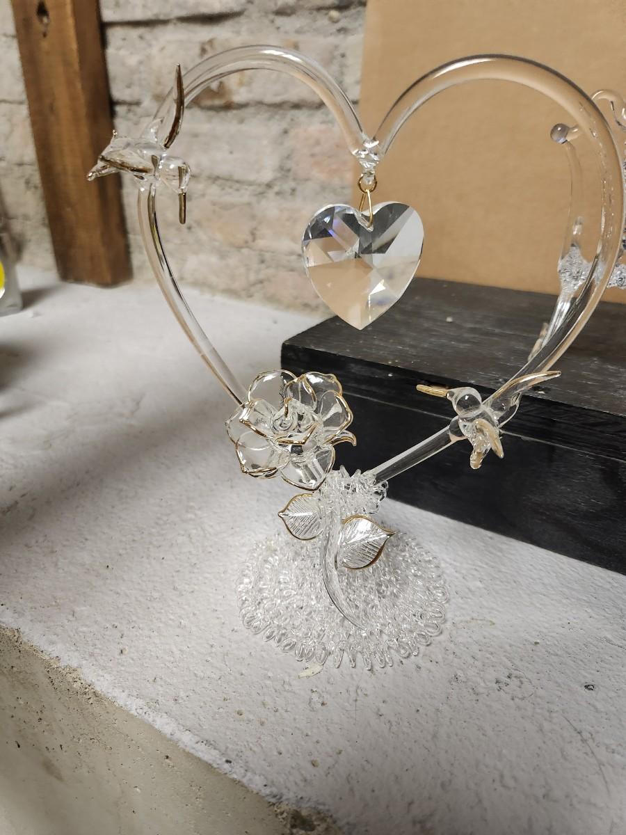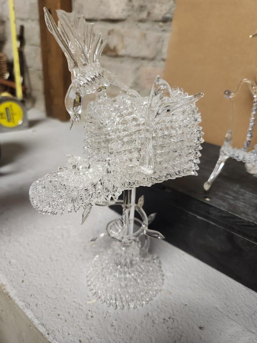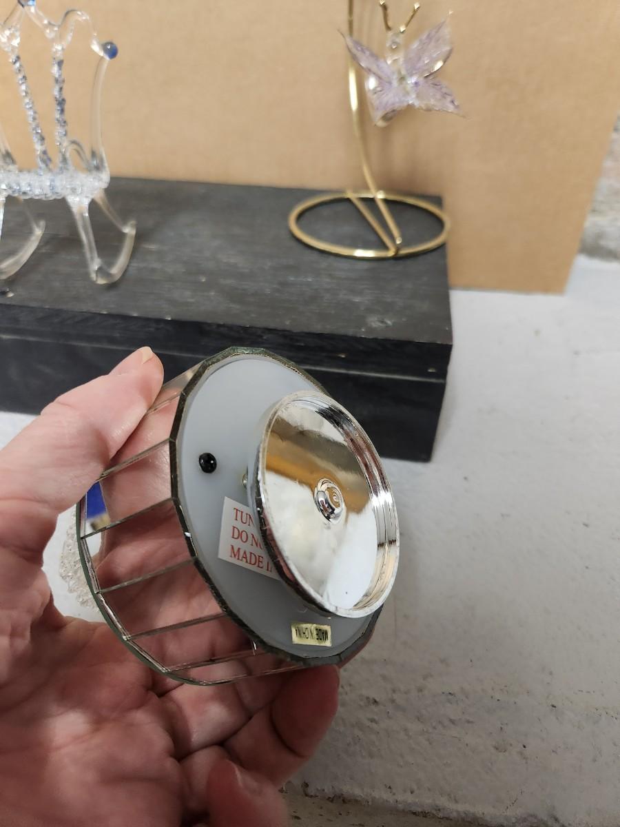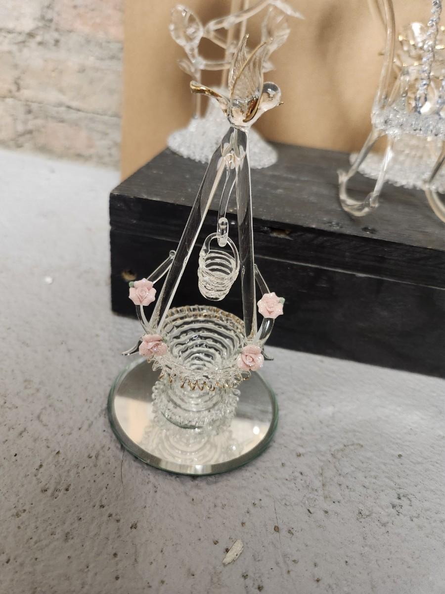 Lot #3 of threaded glass. This on has a hanging butterfly, a mailbox, music box, hanging crystal heart, wishing basket and rocking chair