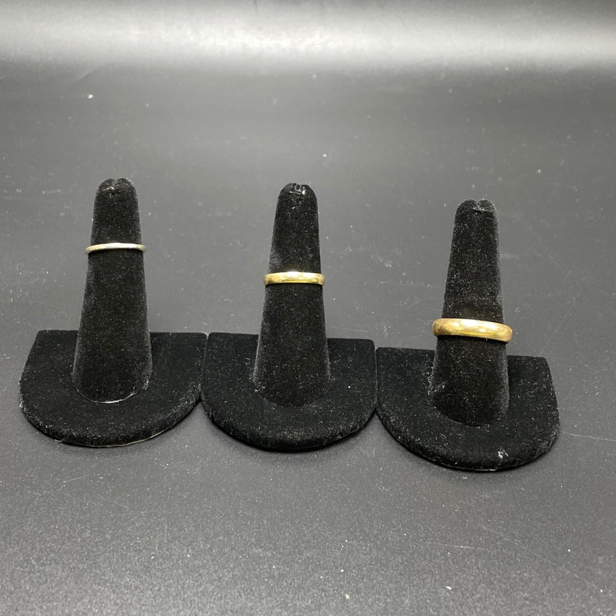 One 14K white gold band with two yellow gold bands both marked 14K. The white gold appears to have initials engraved. See images. Starting bid is near melt value. Shipping available.
