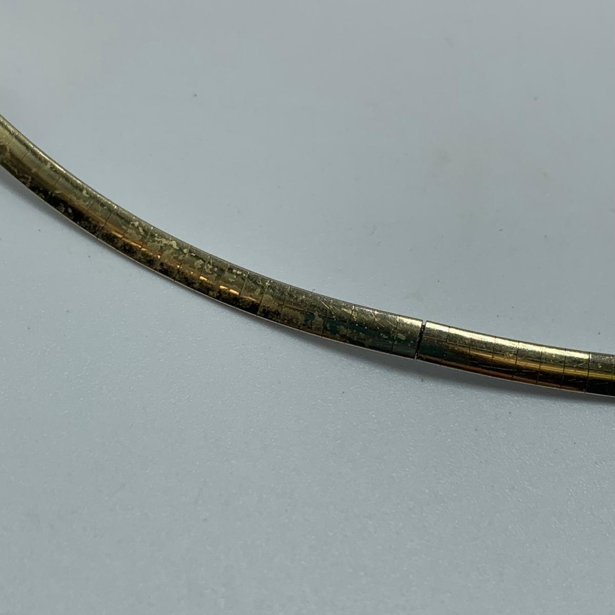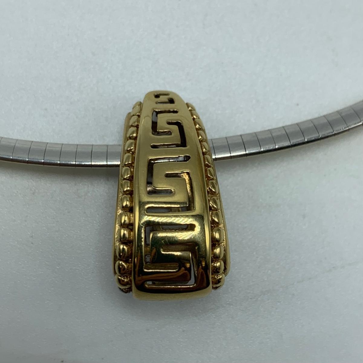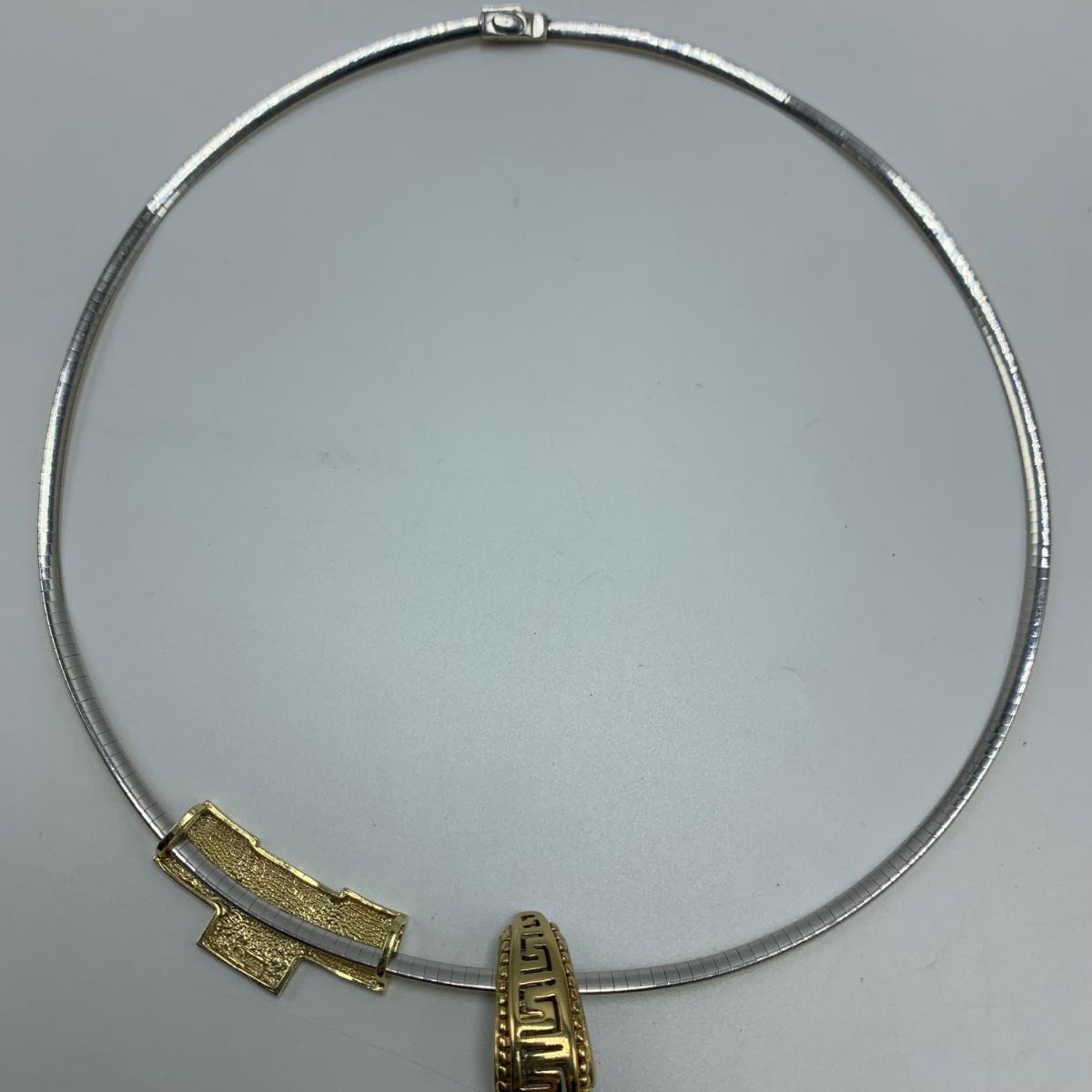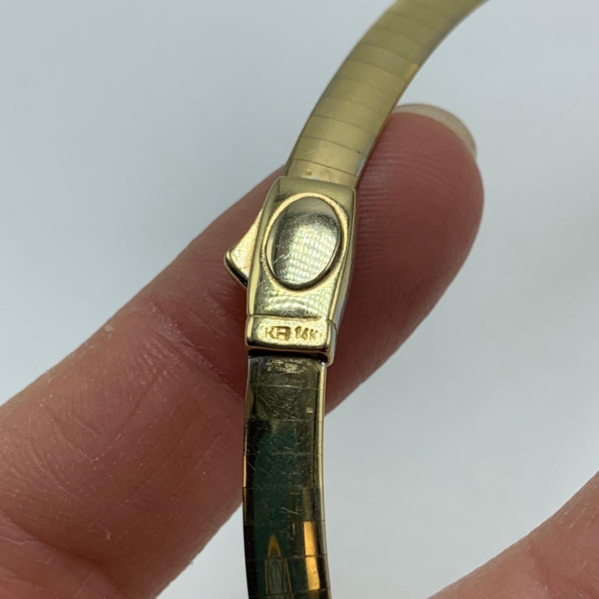 Three omega chain necklaces, each stamped “˜14K’. Two of the chains appear to have yellow gold on one side and white gold on the other. One pendant also appears to be yellow gold on one side and white gold on the other. It is stamped “˜14K’, as is the other pendant. The necklaces are about 6” in diameter. The thickest chain is 5mm thick. The necklace that currently holds the two pendants has some bends and small gaps in the chain. All could benefit from a cleaning.